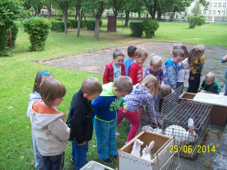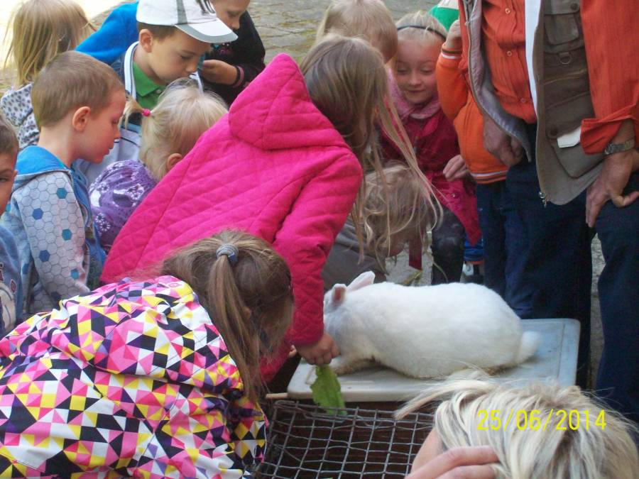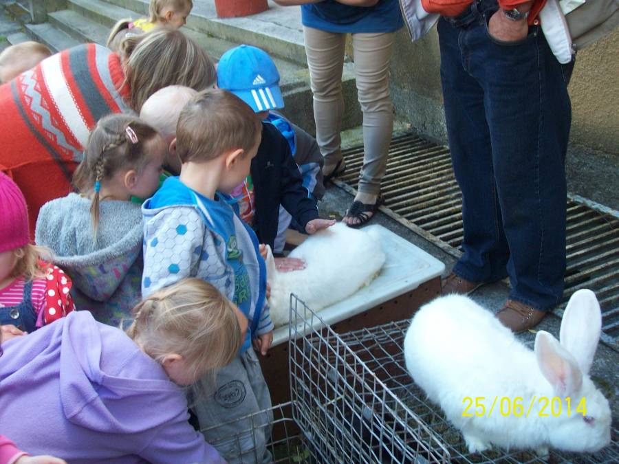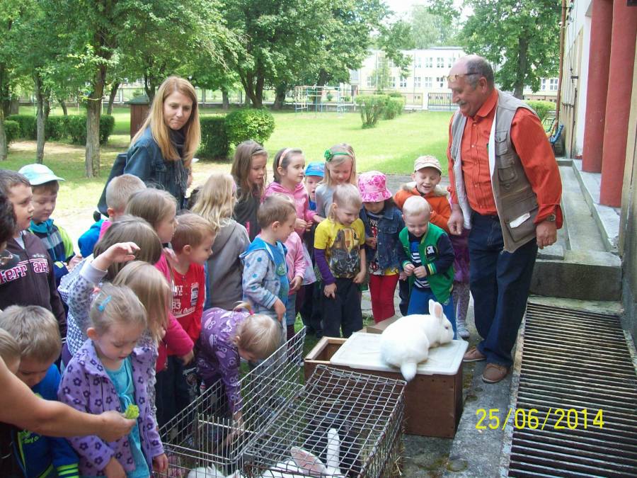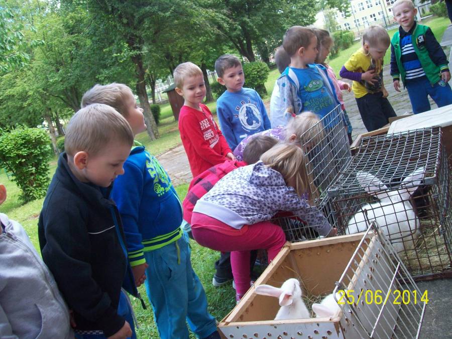 25 czerwca na przedszkolnym placu zagościły puchate zwierzątka - króliczki . Nasz gość pan Ryszard – dziadek Miłosza z Wesołych dzwoneczków, przyjechał do nas ze swoimi podopiecznymi. Dzieci mogły się dowiedzieć się co te zwierzątka jedzą, jak mieszkają oraz jakie mają przyzwyczajenia, a do tego wszystkiego można było je pogłaskać czy wziąć na ręce.Obcowanie ze zwierzętami sprawiło przedszkolakom wiele radości!