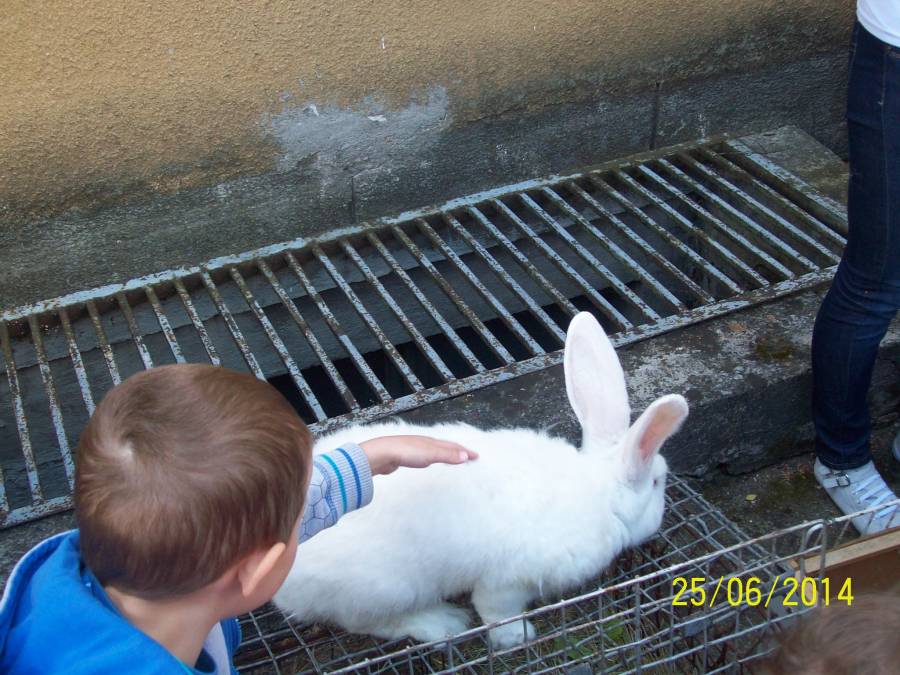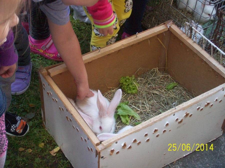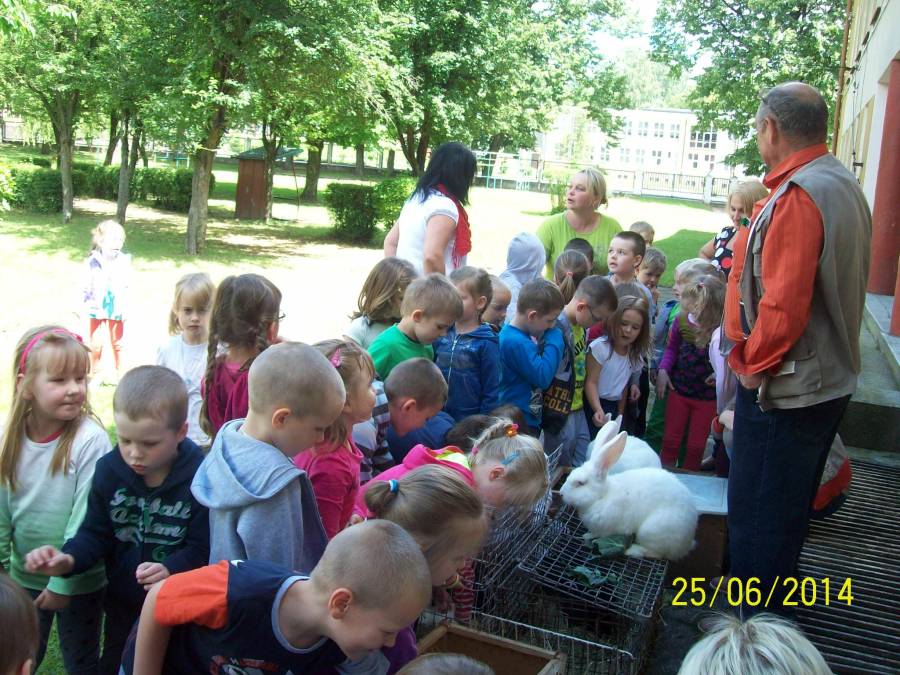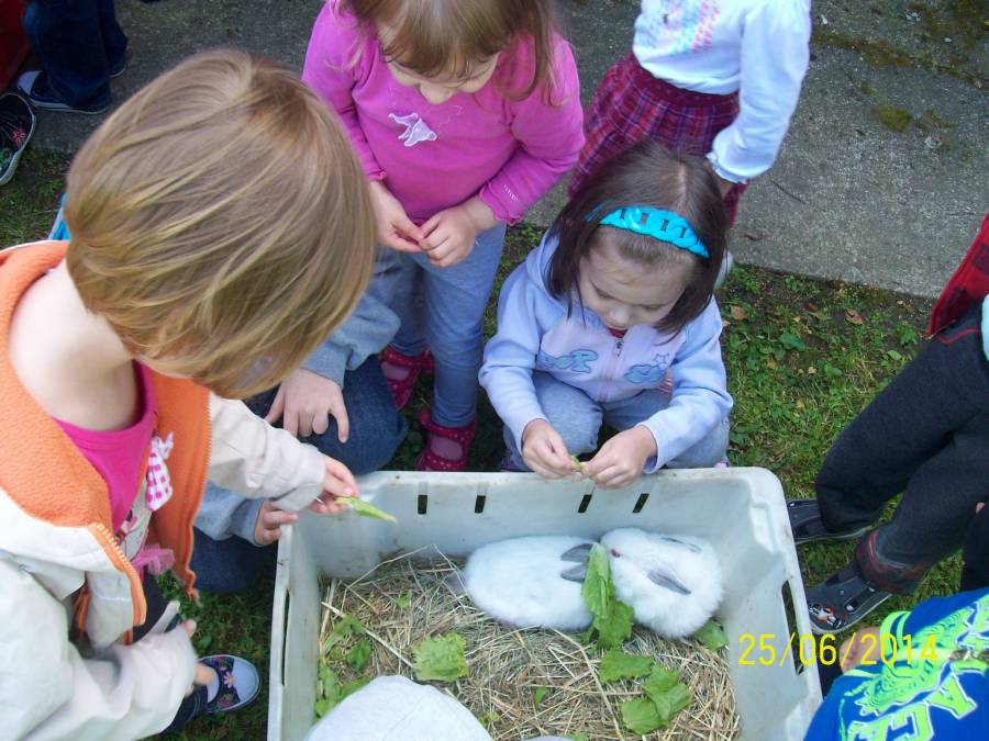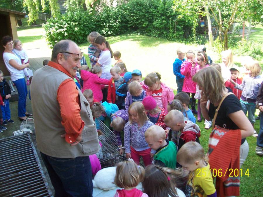 25 czerwca na przedszkolnym placu zagościły puchate zwierzątka - króliczki . Nasz gość pan Ryszard – dziadek Miłosza z Wesołych dzwoneczków, przyjechał do nas ze swoimi podopiecznymi. Dzieci mogły się dowiedzieć się co te zwierzątka jedzą, jak mieszkają oraz jakie mają przyzwyczajenia, a do tego wszystkiego można było je pogłaskać czy wziąć na ręce.Obcowanie ze zwierzętami sprawiło przedszkolakom wiele radości!