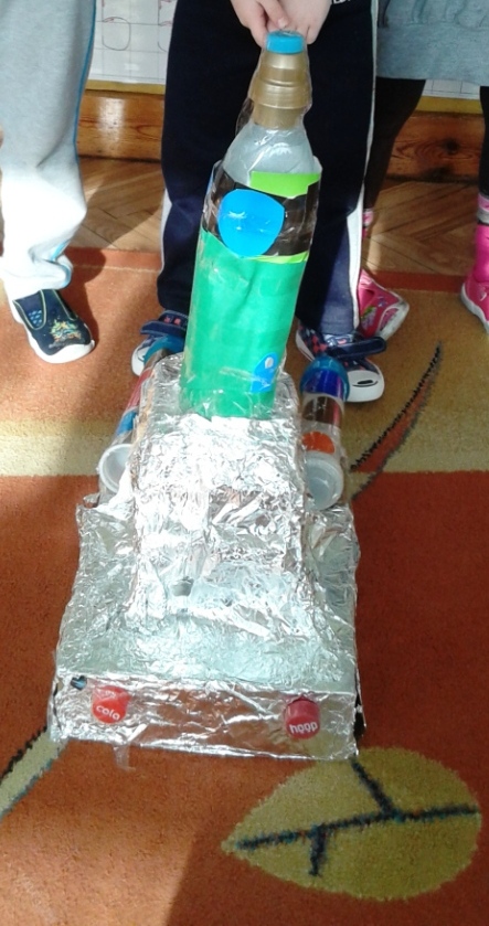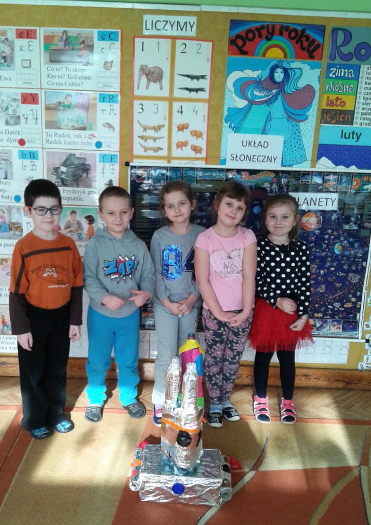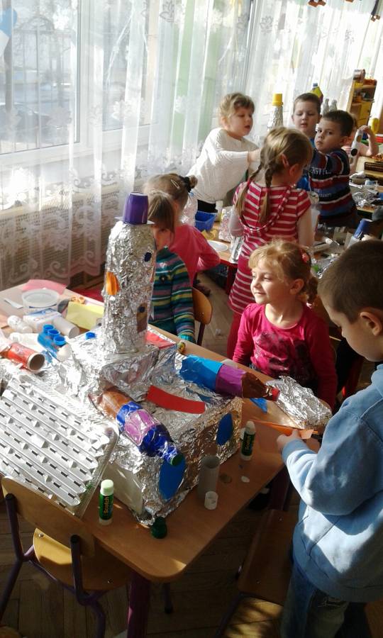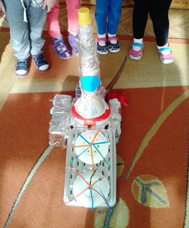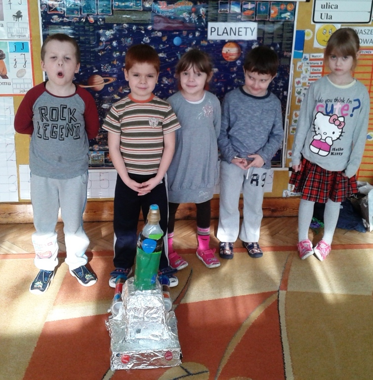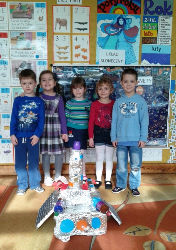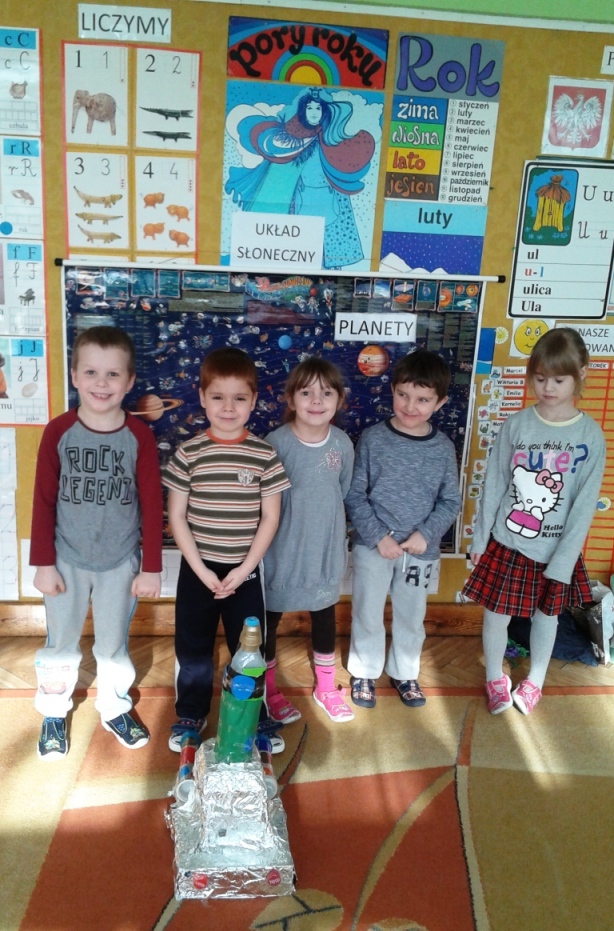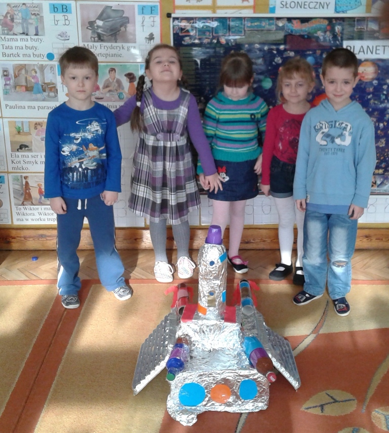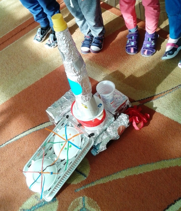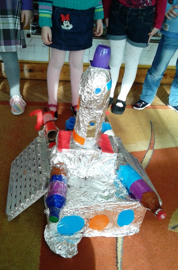 W związku z realizowaną w tym tygodniu tematyką „ W kosmosie”, dzieci z grupy Kolorowe akwarelki stworzyły „Pojazd kosmiczny”. Został on wykonany z przyniesionych przez dzieci materiałów wtórnych. Praca ta miała na celu nie tylko kształcenie umiejętności łączenia ze sobą różnych elementów, rozwijanie wyobraźni przestrzennej, ale również wdrażanie do dbania o środowisko naturalne człowieka. Dzieci pracując w grupach wykazały się umiejętnością współpracy, a także wielką kreatywnością i pomysłowością !