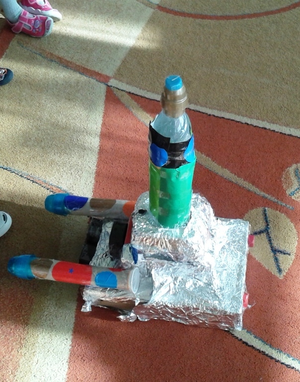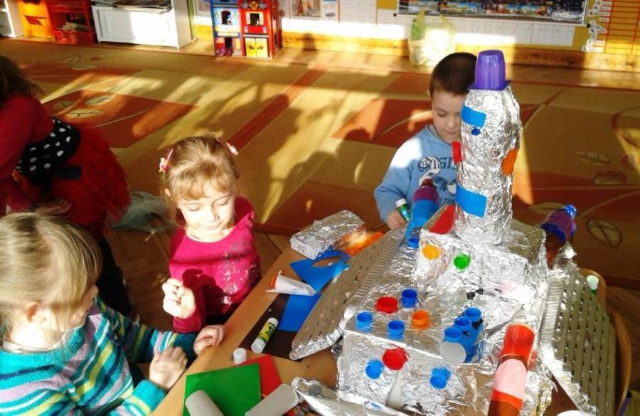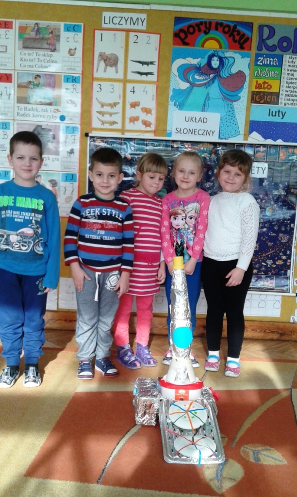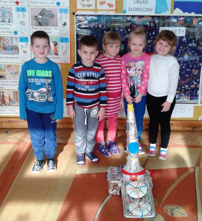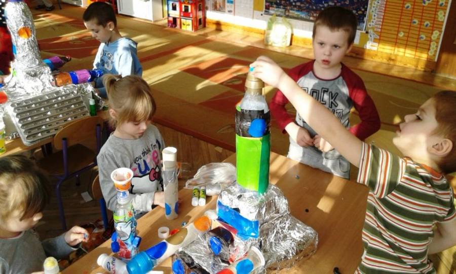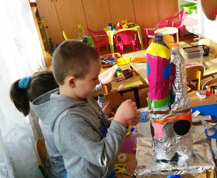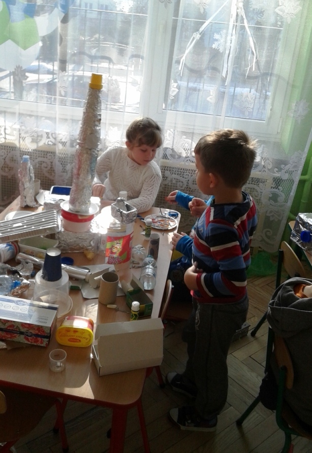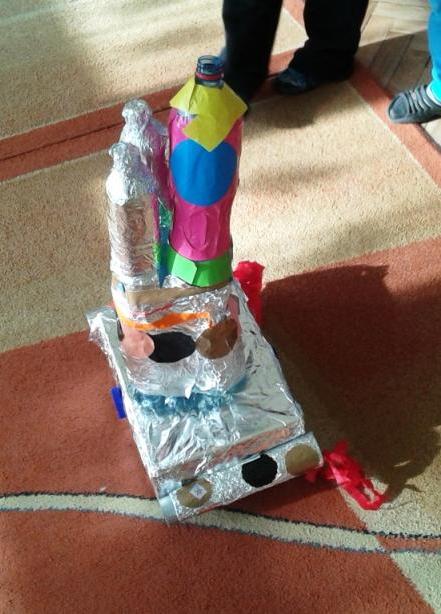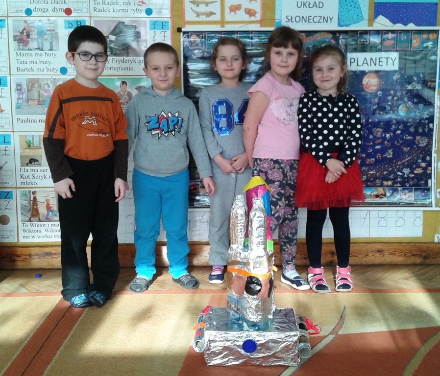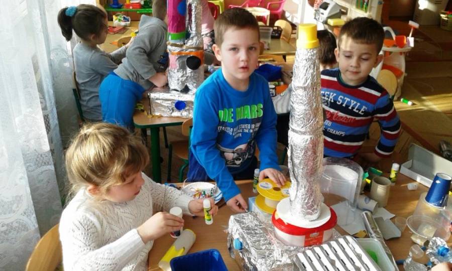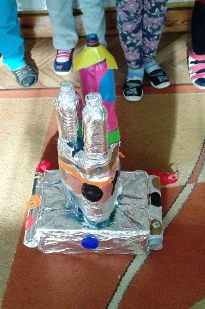 W związku z realizowaną w tym tygodniu tematyką „ W kosmosie”, dzieci z grupy Kolorowe akwarelki stworzyły „Pojazd kosmiczny”. Został on wykonany z przyniesionych przez dzieci materiałów wtórnych. Praca ta miała na celu nie tylko kształcenie umiejętności łączenia ze sobą różnych elementów, rozwijanie wyobraźni przestrzennej, ale również wdrażanie do dbania o środowisko naturalne człowieka. Dzieci pracując w grupach wykazały się umiejętnością współpracy, a także wielką kreatywnością i pomysłowością !