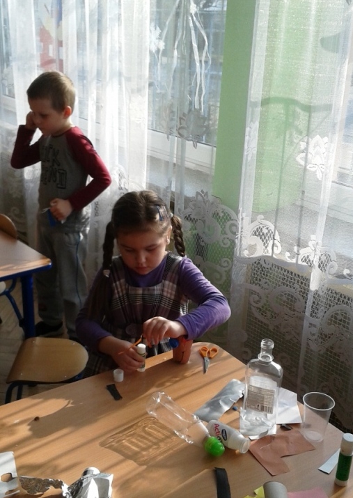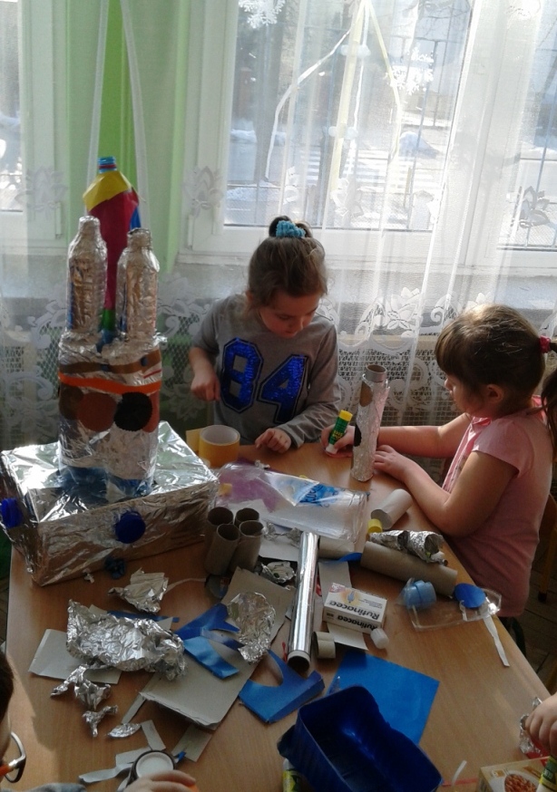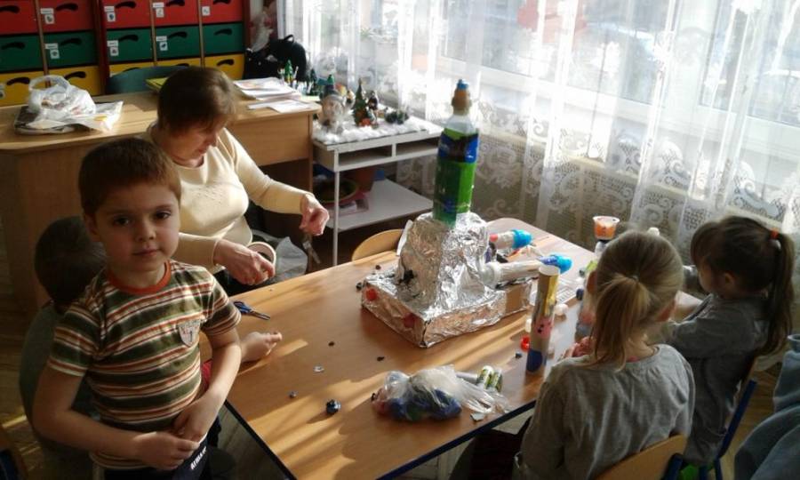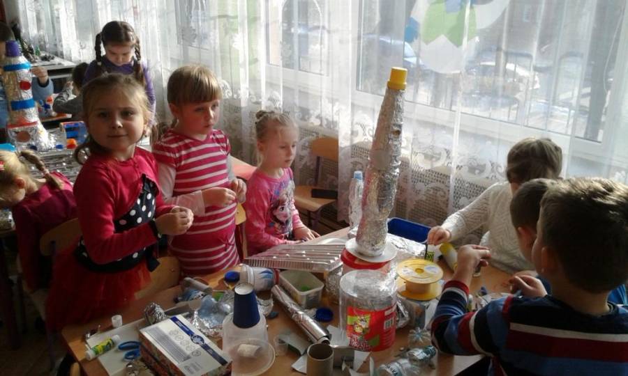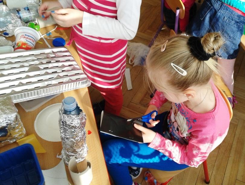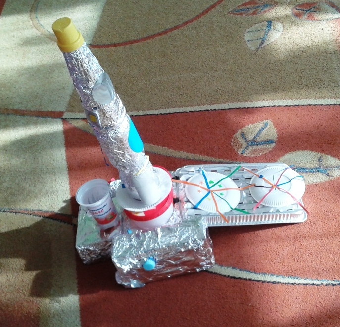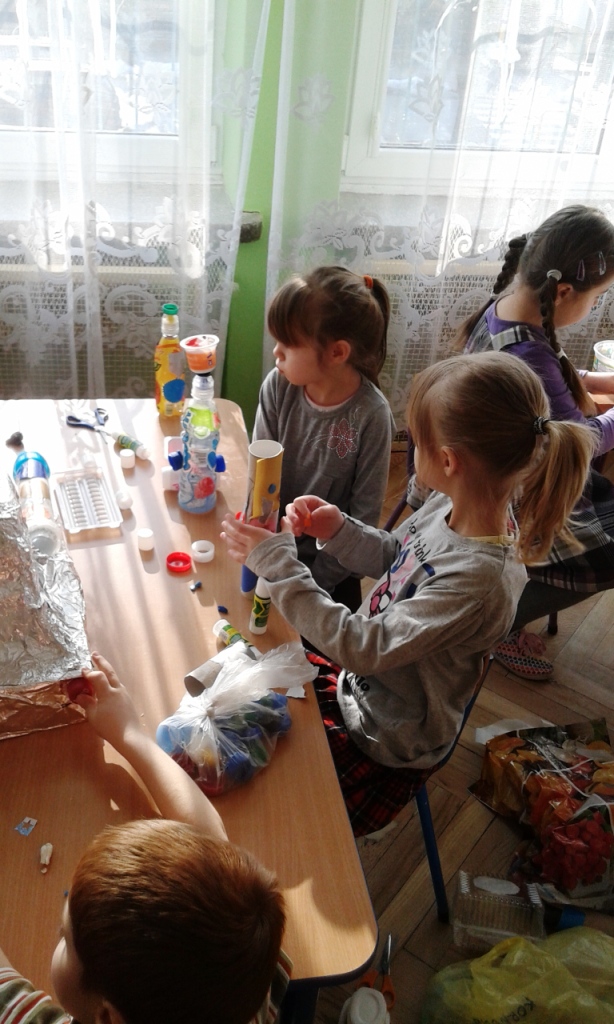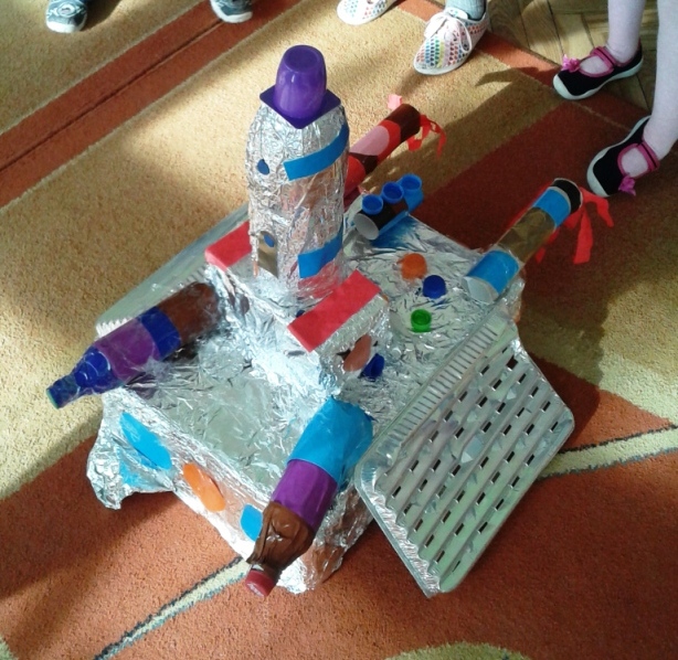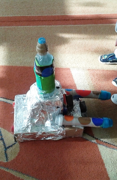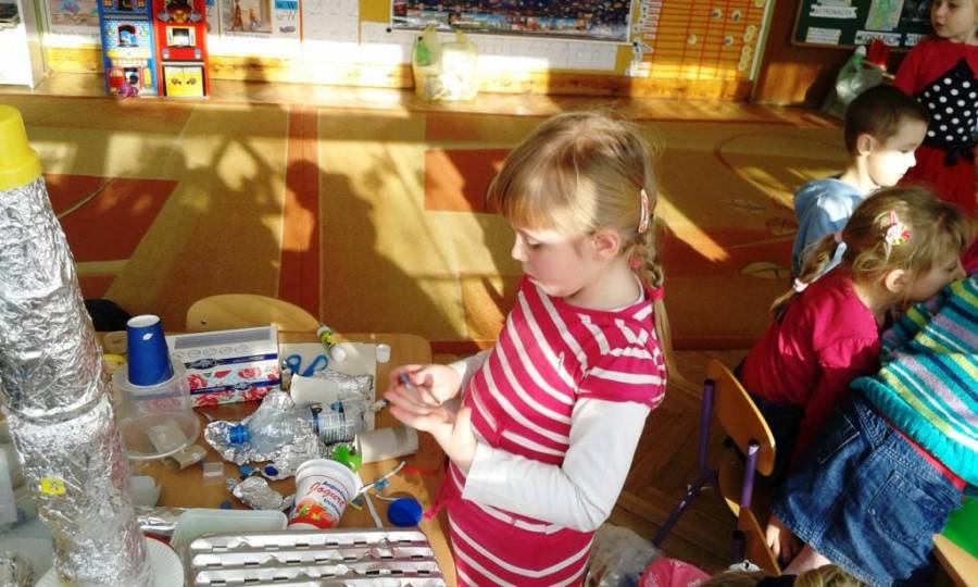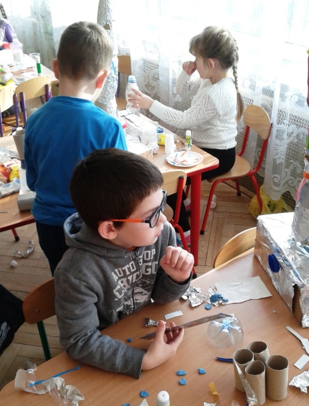 W związku z realizowaną w tym tygodniu tematyką „ W kosmosie”, dzieci z grupy Kolorowe akwarelki stworzyły „Pojazd kosmiczny”. Został on wykonany z przyniesionych przez dzieci materiałów wtórnych. Praca ta miała na celu nie tylko kształcenie umiejętności łączenia ze sobą różnych elementów, rozwijanie wyobraźni przestrzennej, ale również wdrażanie do dbania o środowisko naturalne człowieka. Dzieci pracując w grupach wykazały się umiejętnością współpracy, a także wielką kreatywnością i pomysłowością !