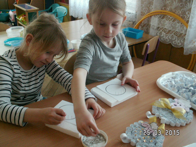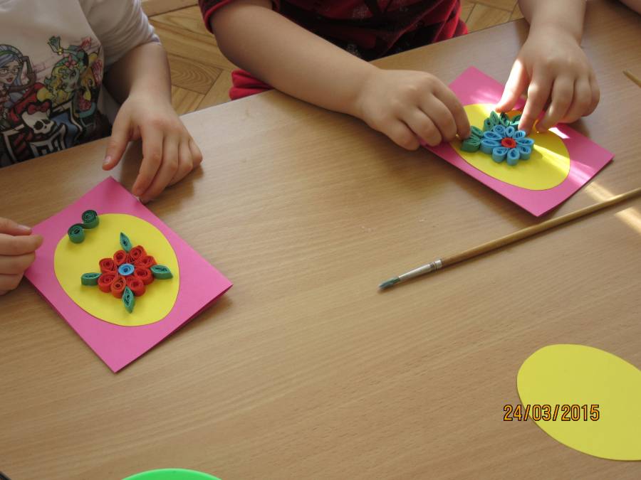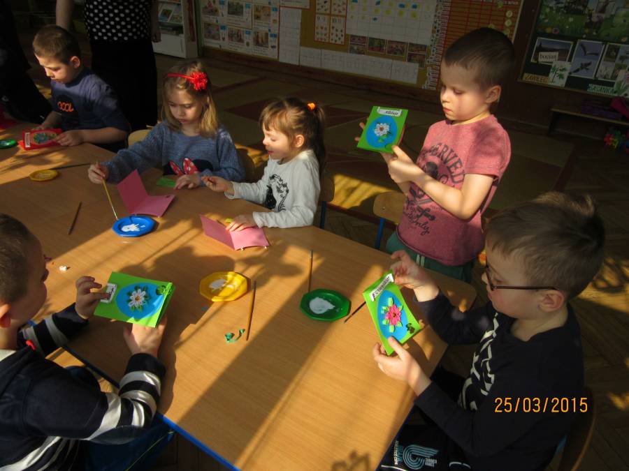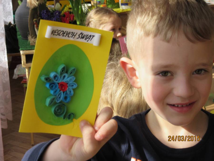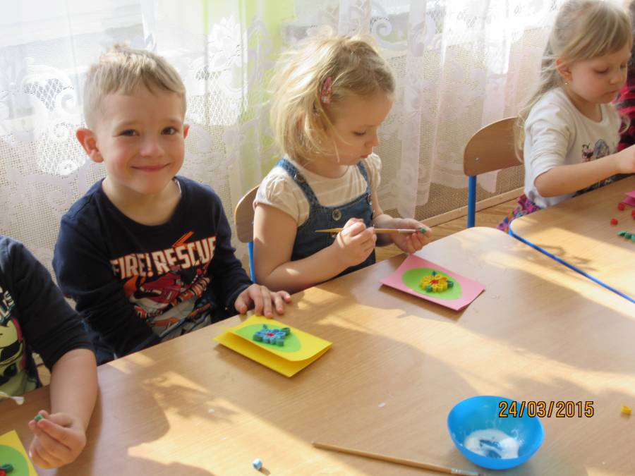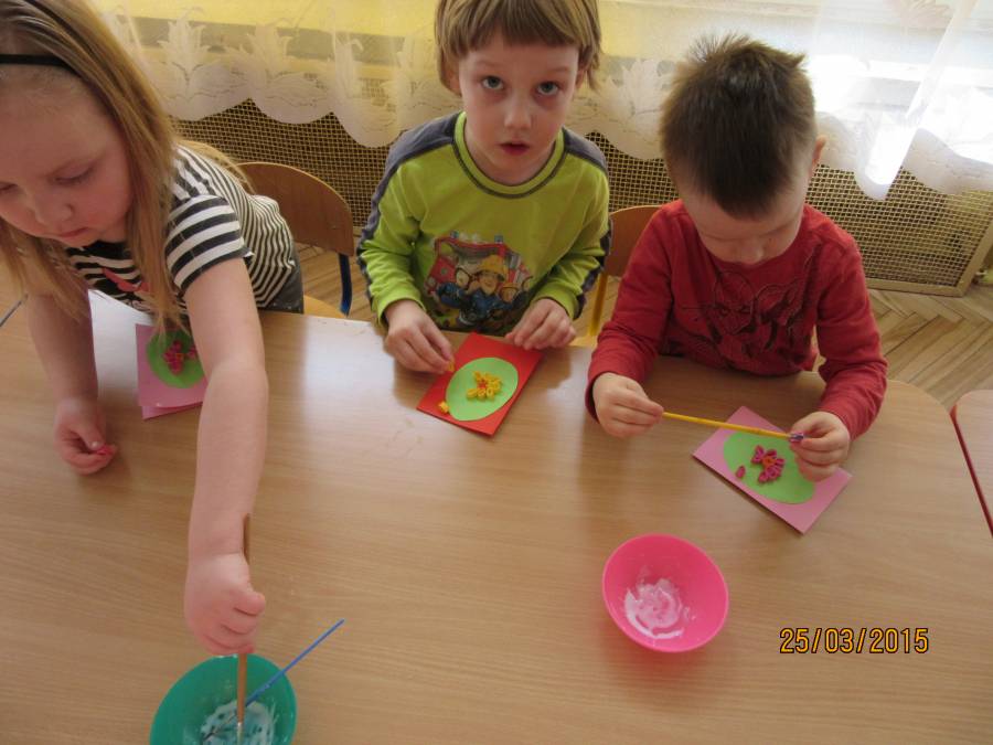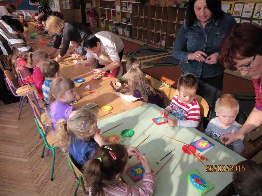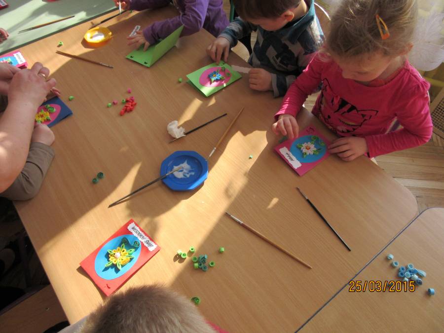 W związku z tym zaprosiliśmy do Przedszkola Nr 1 Panie z Uniwersytetu III Wieku, które pokazały nam jak ciekawie metodą quiling wykonać pocztówki. Takie warsztaty odbyły się w każdej grupie. Dzieci były bardzo zainteresowane i chętne do pracy. Zgodnie z instrukcjami pani Teresy Rygasiewicz zwijały papierowe paski, naklejały kolejne elementy i dopasowywały odpowiednie kolory. Efekt końcowy był niesamowity. Każda kartka była wyjątkowa i na pewno spodoba się osobie, która ją otrzyma.