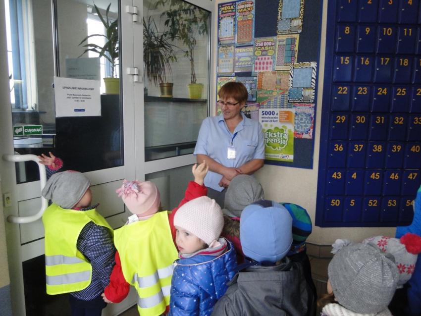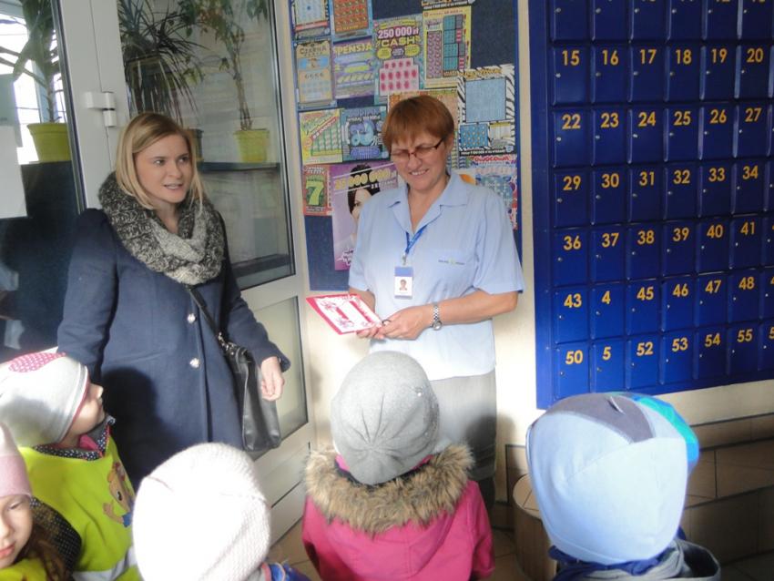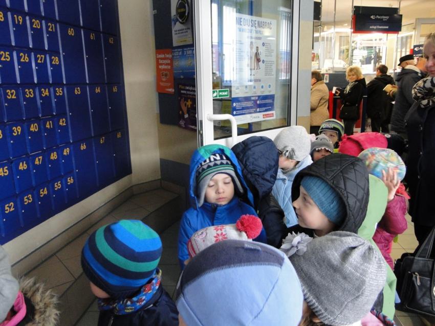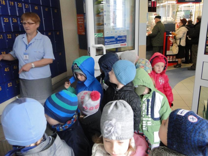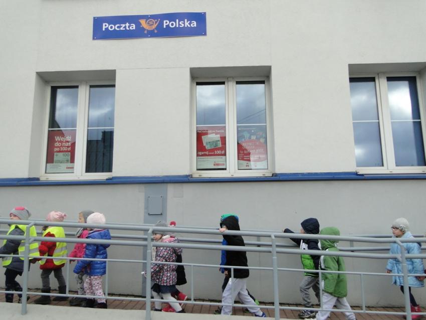 W poniedziałek 26 października „Roztańczone nutki” wybrały się na wycieczkę do Urzędu Pocztowego. Przedszkolaki poznały wszystkie tajniki pracy pocztowca oraz drogę listu, paczki i innych przesyłek. Dzieci dowiedziały się również, że na poczcie można załatwić wiele innych spraw, na przykład: zapłacić rachunki, kupić gazetę lub książkę. Podczas odwiedzin dzieci utrwalały nawyk właściwego, kulturalnego zachowania się w miejscach publicznych. Na zakończenie dzieci podziękowały i wręczyły pracownikom poczty piękną laurkę. Wycieczka okazała się pouczająca i bardzo interesująca, a dzieci wracały do przedszkola pełne miłych wrażeń.