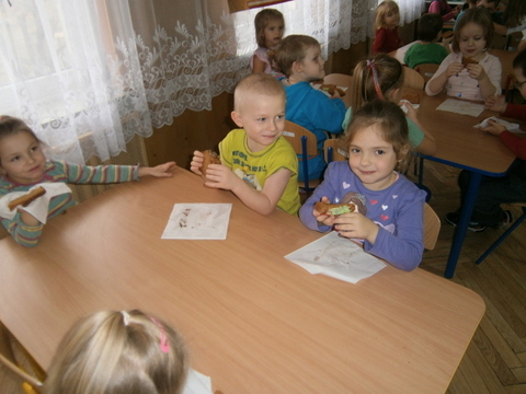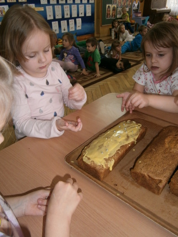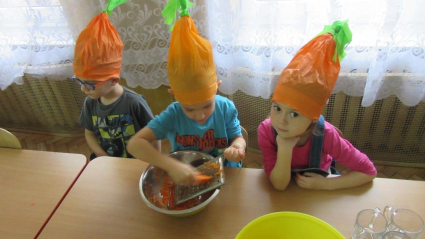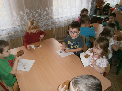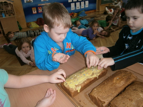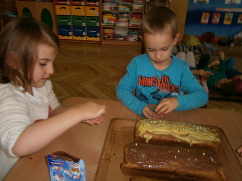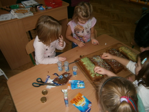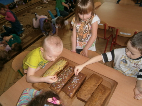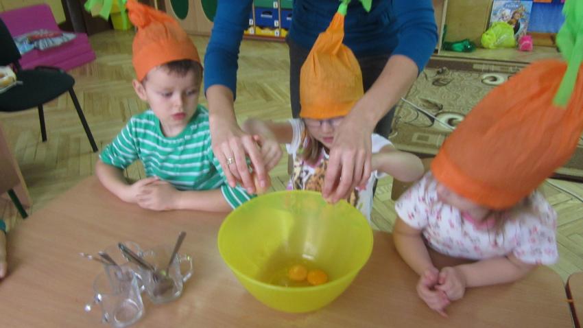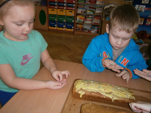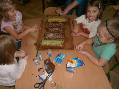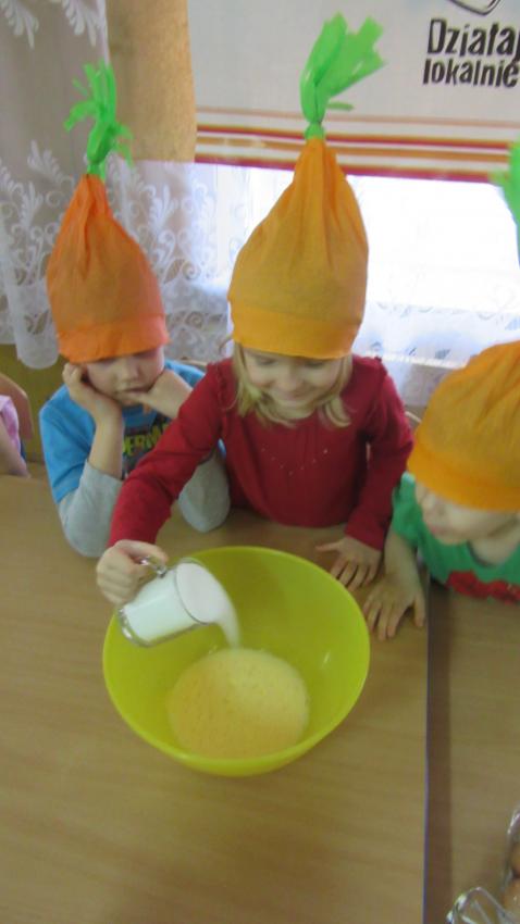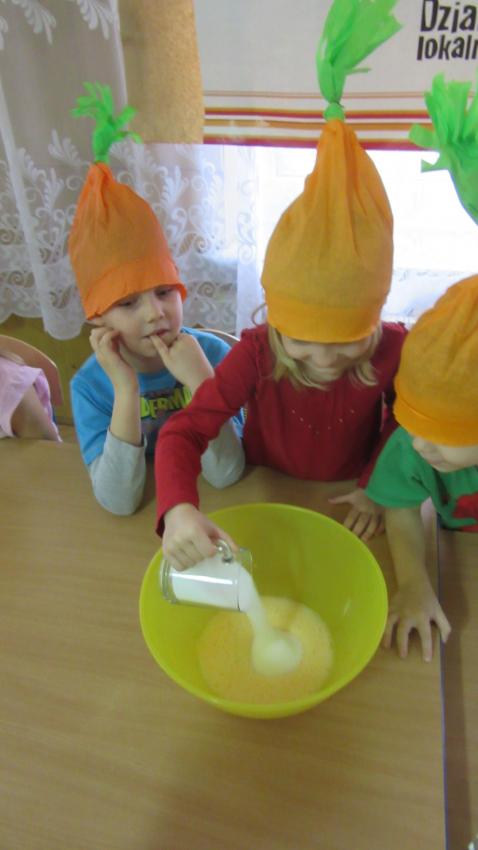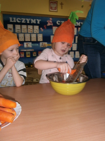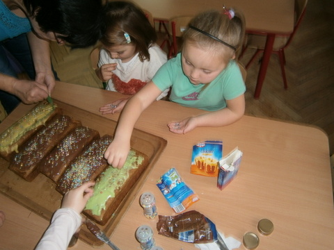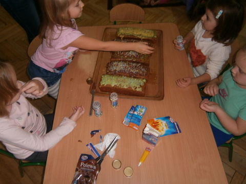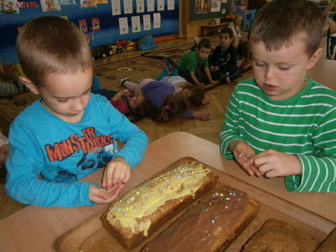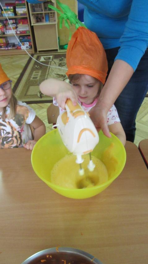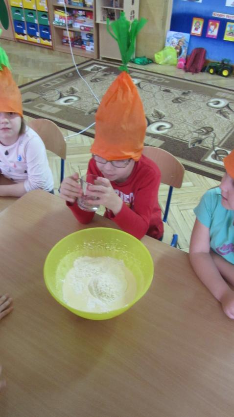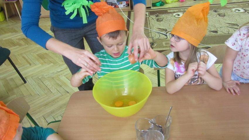 W piątek 06.11.2015 r. przedszkolaki z oddziału V „Tęczowe kredki” przygotowywały pyszne ciasto marchewkowe, łączyły ze sobą potrzebne składniki, tarkowały marchewki, miksowały. Największą radość sprawiało dekorowanie wypieków polewą, lukrem i ozdobami. Po spróbowaniu wszystkie dzieci jednogłośnie stwierdziły, że ciasto wyszło PYSZNE. Brawa dla naszych małych kucharzy.