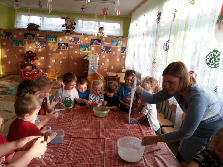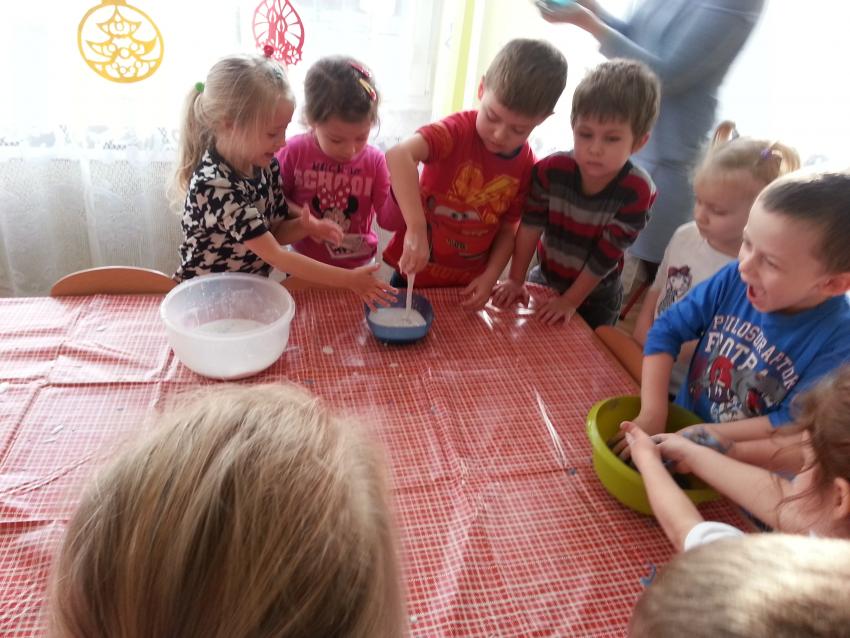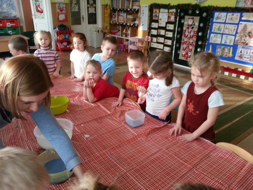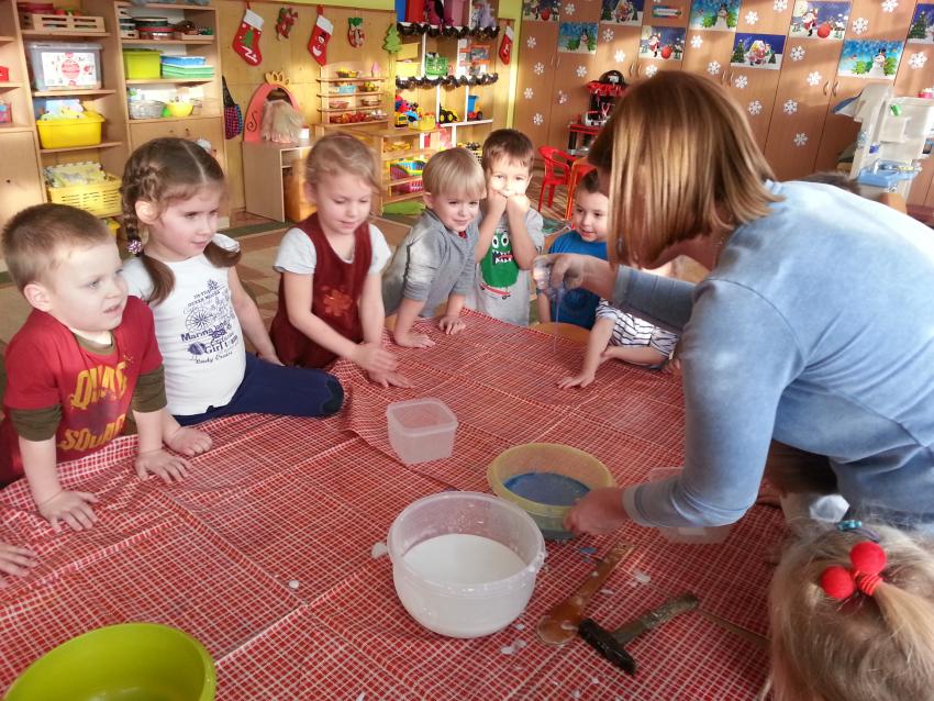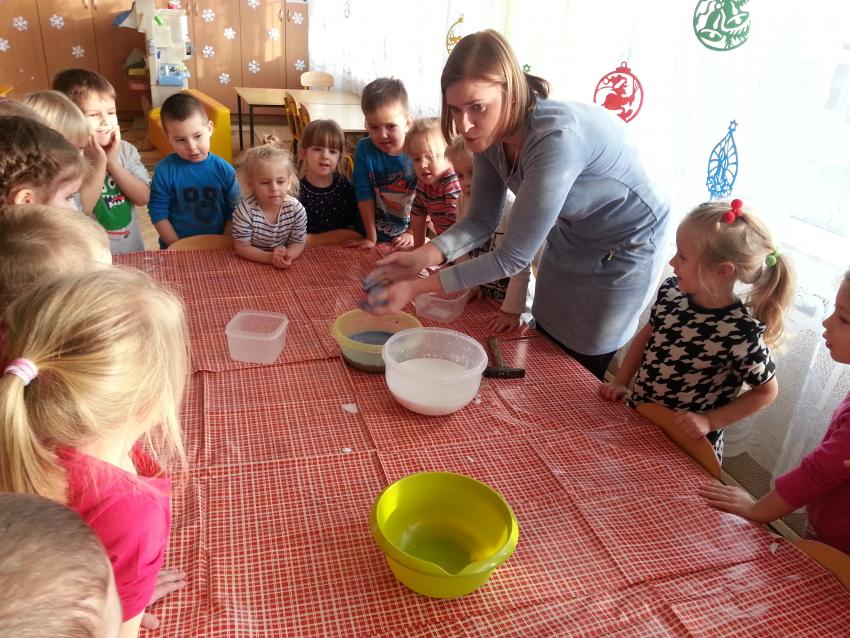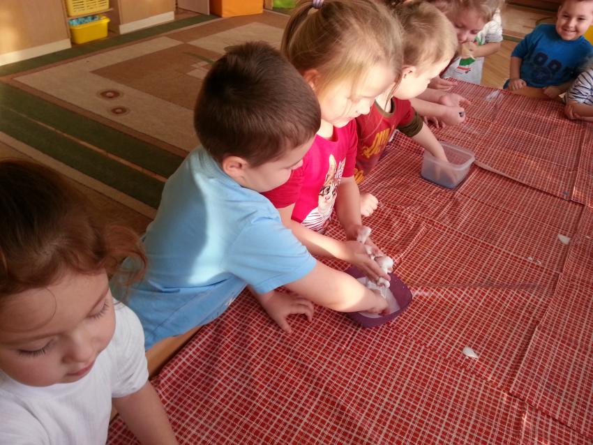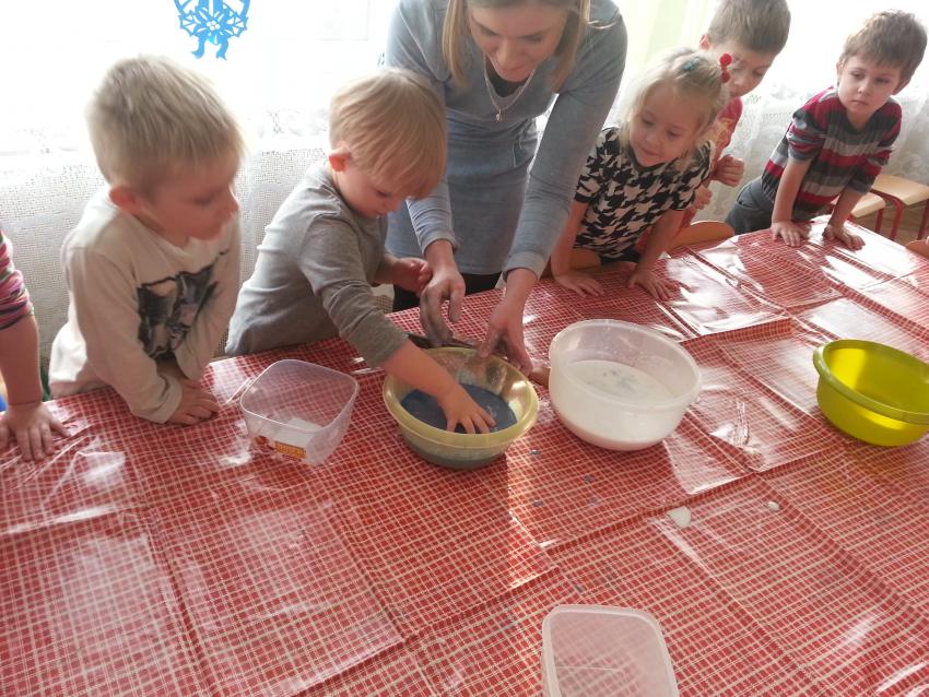 Z zaciekawieniem obserwowaliśmy jak woda paruje, unosi się do góry i skrapla w postaci deszczu. Poznaliśmy również „magiczną masę”- ciecz nieniutonowką, która pod wpływem nacisku zmienia swoje właściwości. Dzieciakom bardzo podobał się ten eksperyment. W szczególności, gdy po zabawie pozostały nam „kosmiczne” dłonie zabarwione na niebiesko.