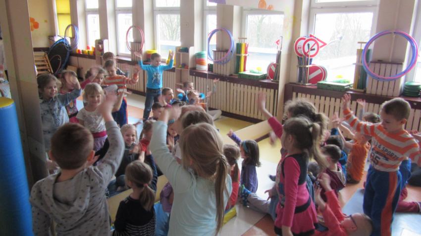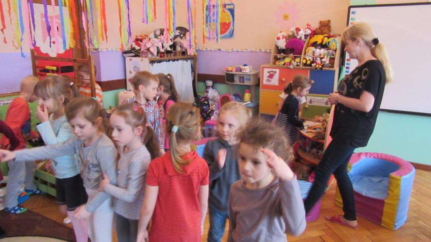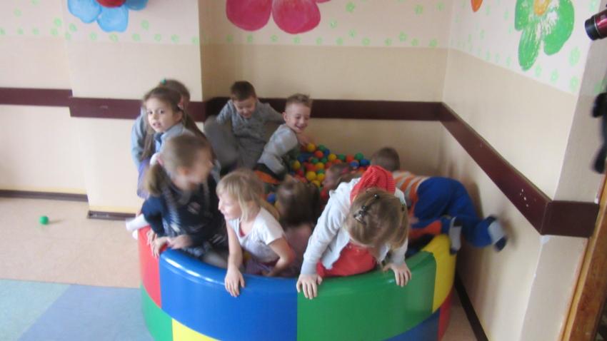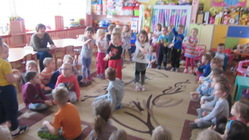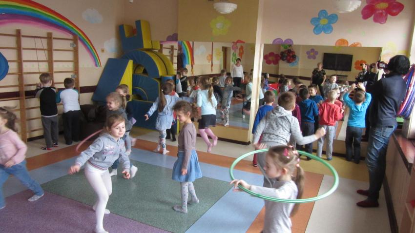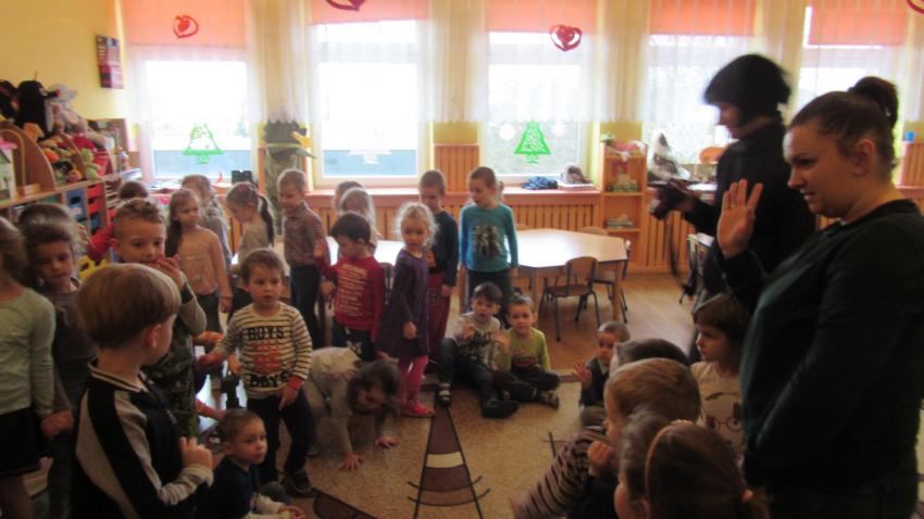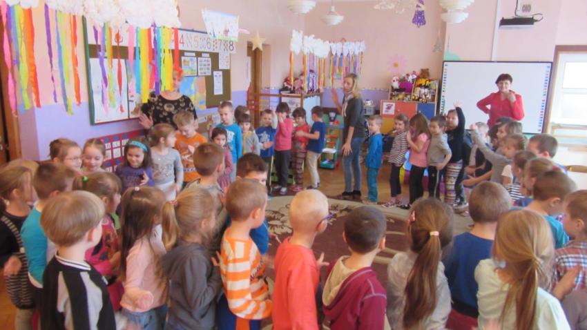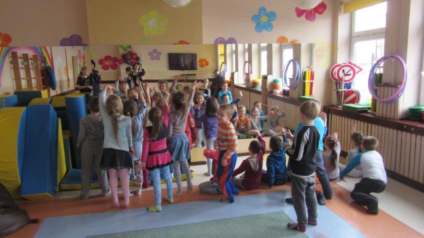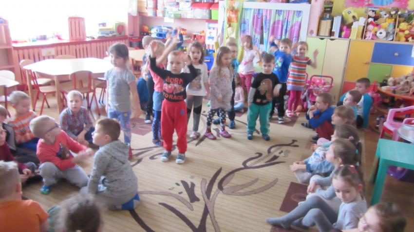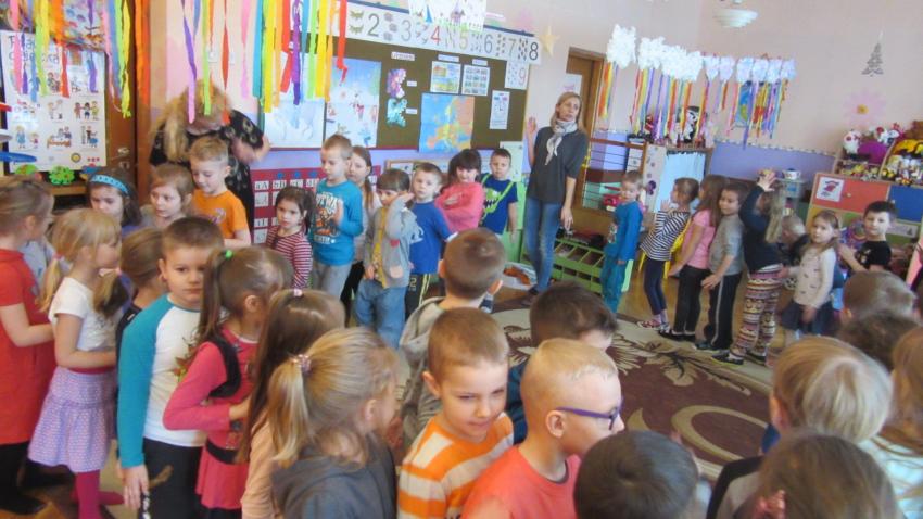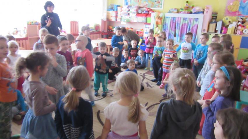 Starszaki z naszego przedszkola zostały zaproszone w przez panią Dyrektor Lucynę Szymańską do odwiedzenia jej przedszkolaków. Dzieci miały okazję integrować się podczas wspólnej zabawy, tańców i śpiewania.