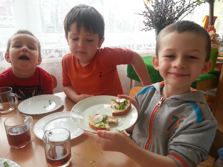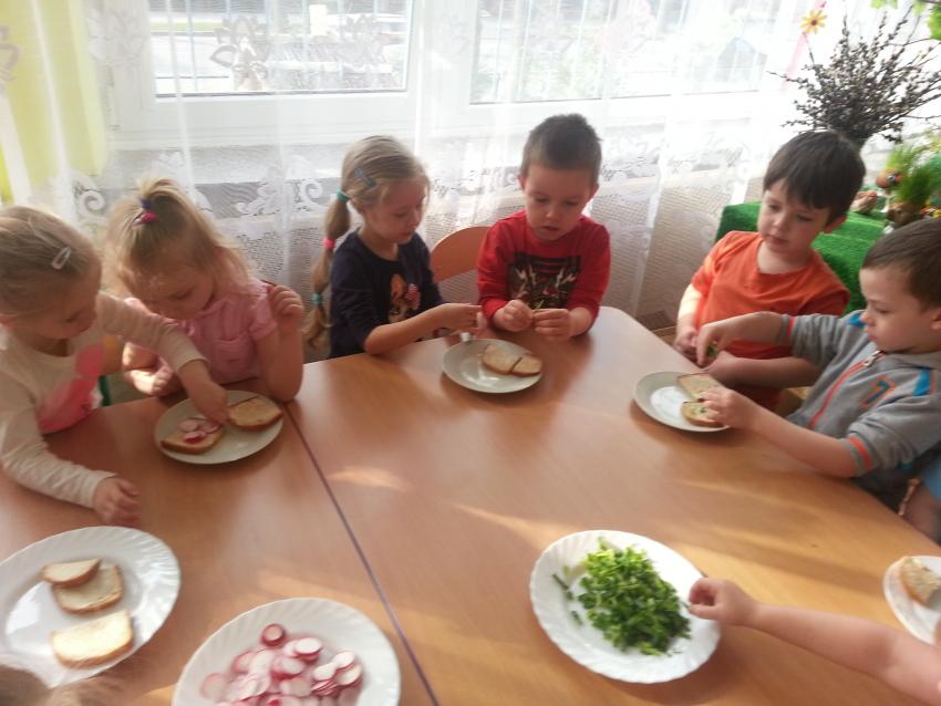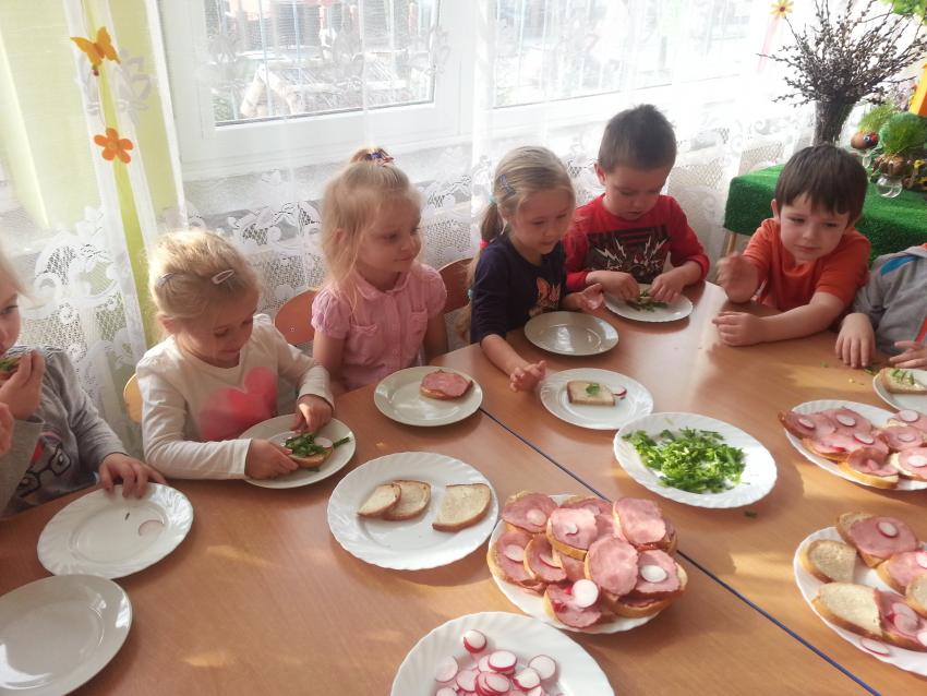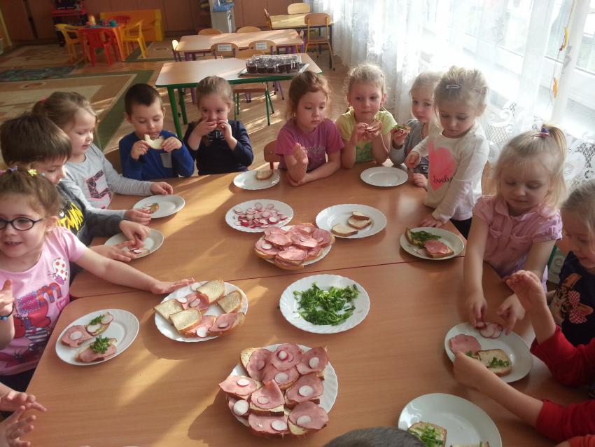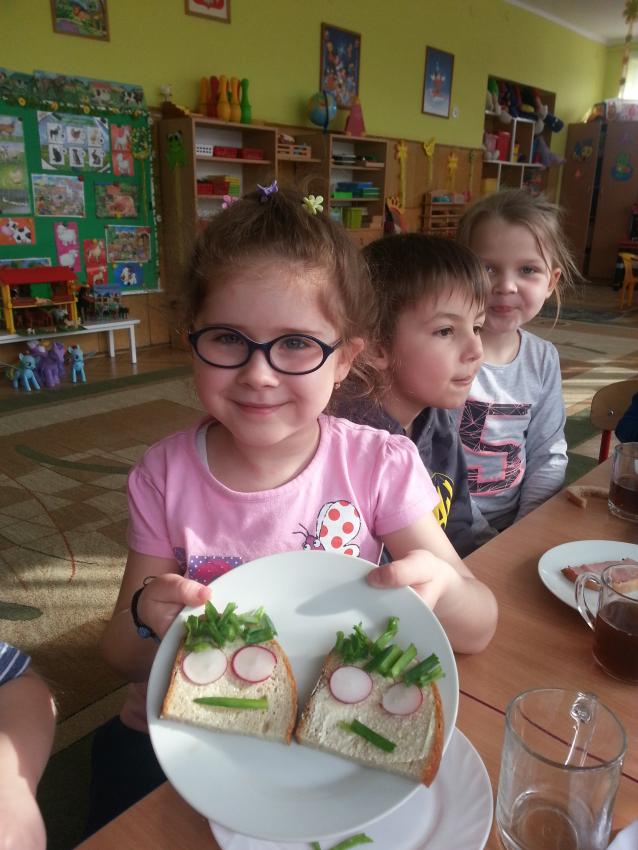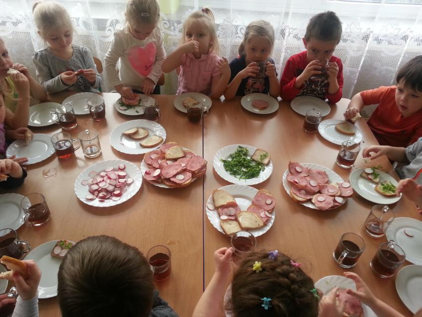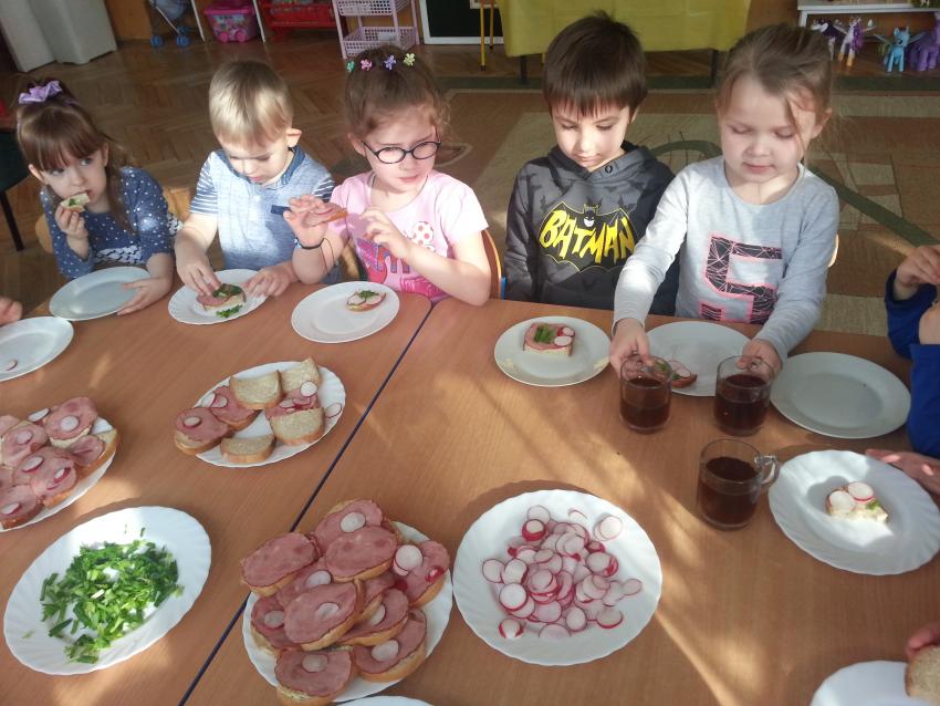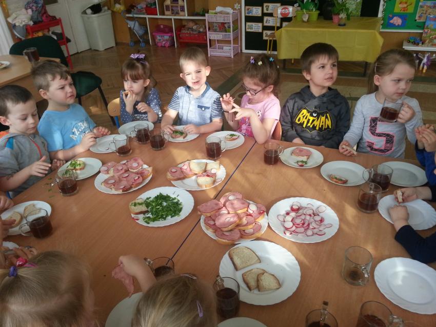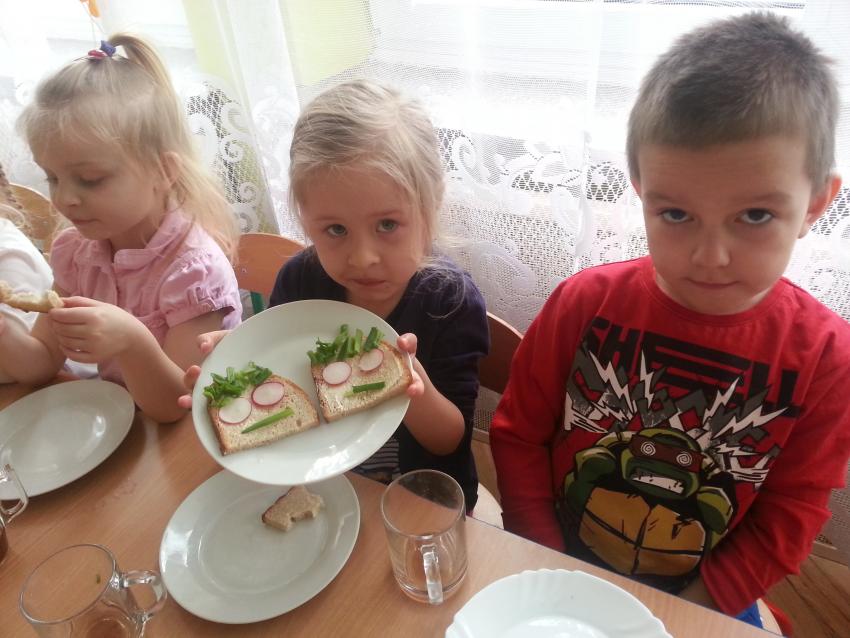 W ubiegły piątek „Roztańczone nutki” miały okazję zjeść wspólne, nieco inne niż zawsze śniadanie. Szczypiorek, który wspólnie posadziliśmy w końcu urósł i nadawał się do zjedzenia. Na początku dokładnie go umyliśmy, a potem zabraliśmy się za krojenie i robienie pysznego śniadania. Kanapki przez nas wykonane nie tylko były smaczne, zdrowe ale i pięknie ozdobione. Pamiętać należy, że najlepiej smakują kanapki wykonane własnoręcznie, dlatego wszyscy zjedli je z ogromnym apetytem. Wspólne śniadanie bardzo podobało się „Roztańczonym nutkom” i już nie mogą doczekać się kolejnego posiłku przy wspólnym stole.