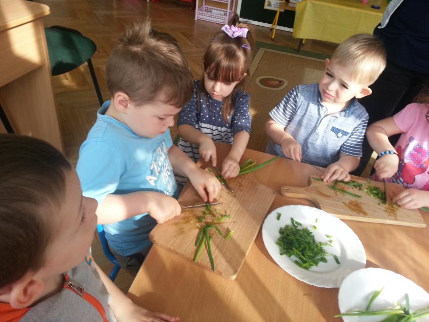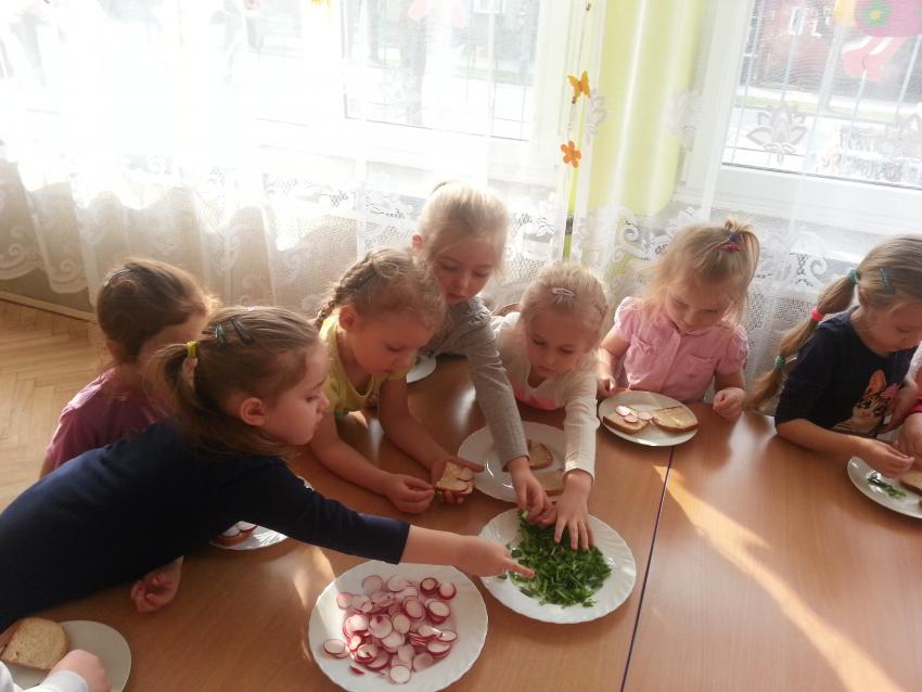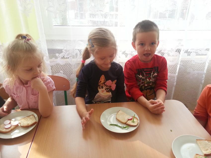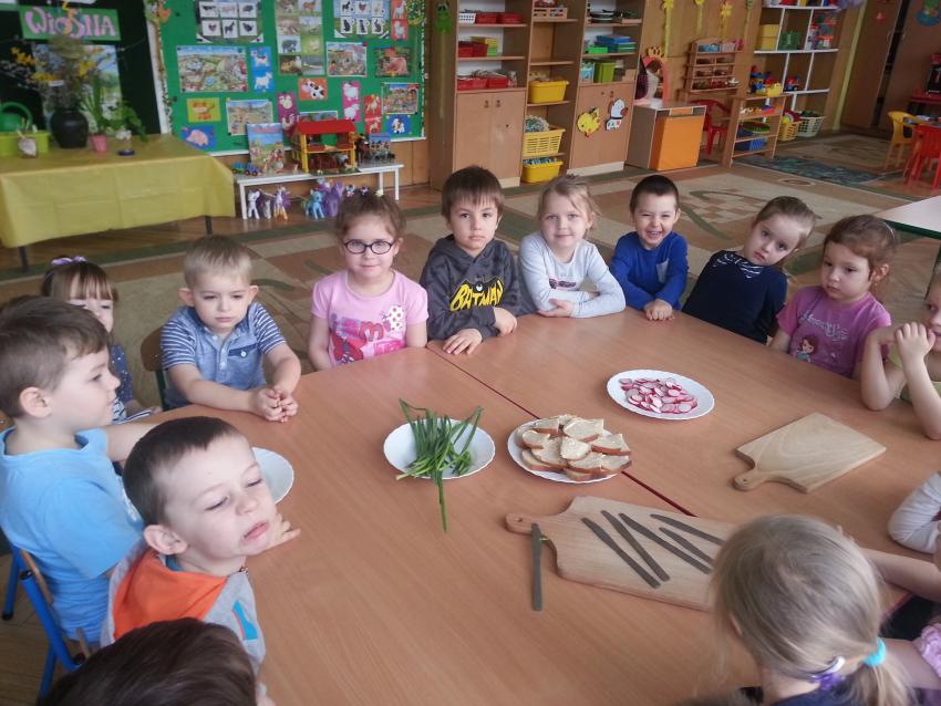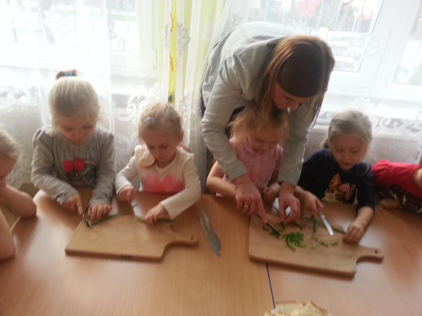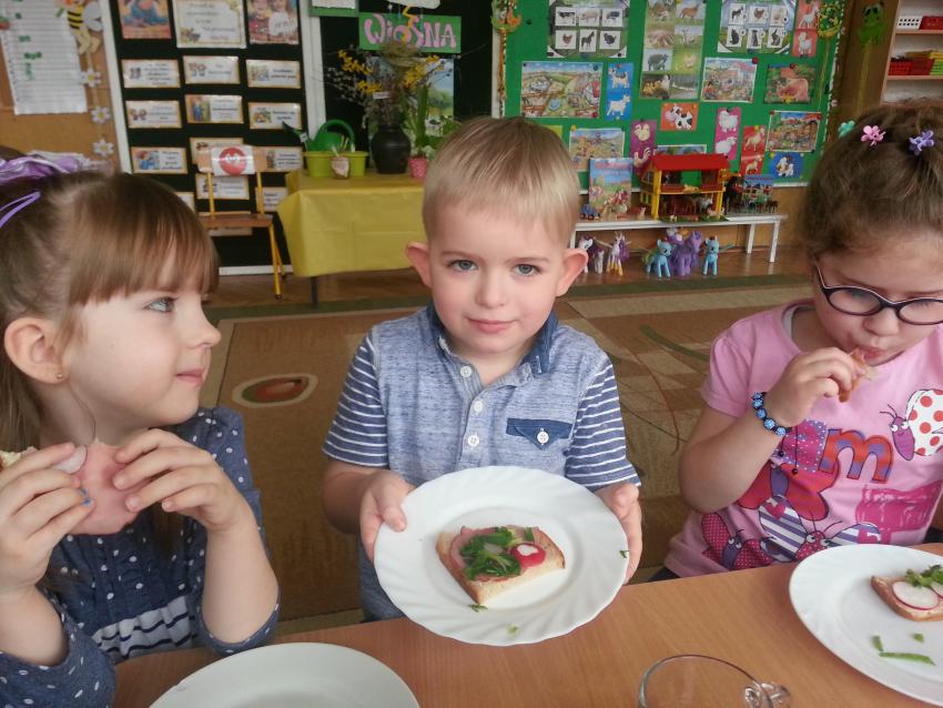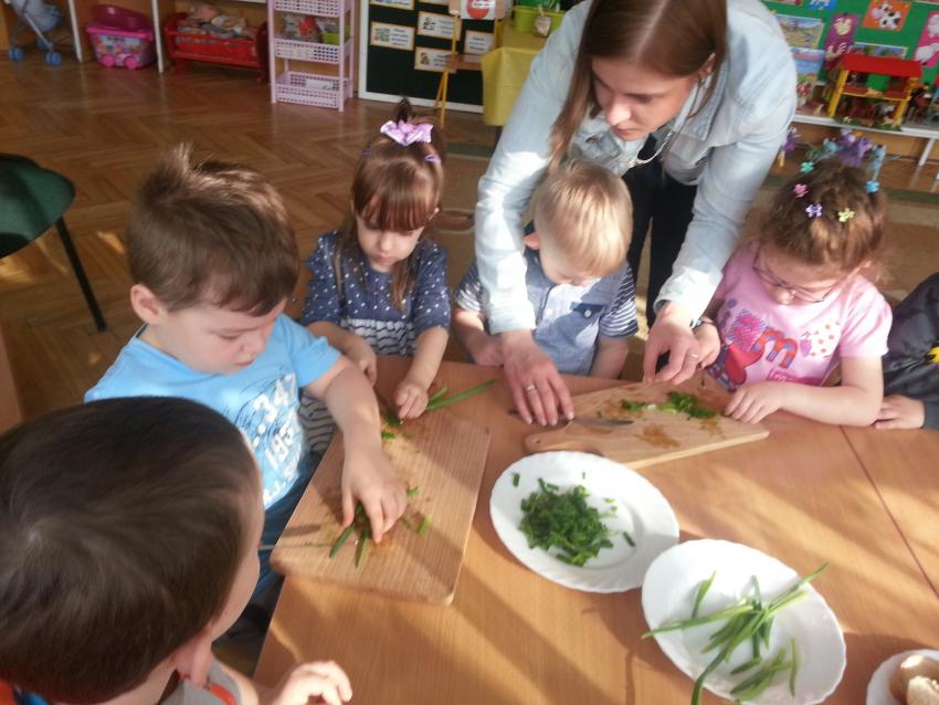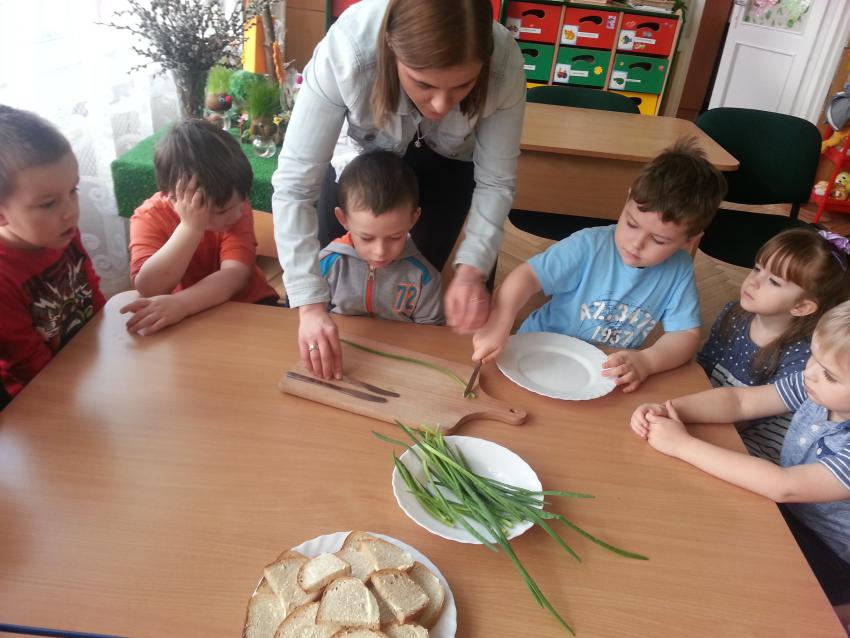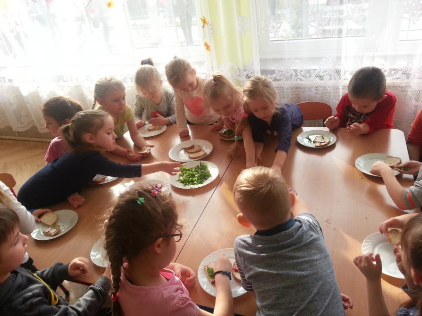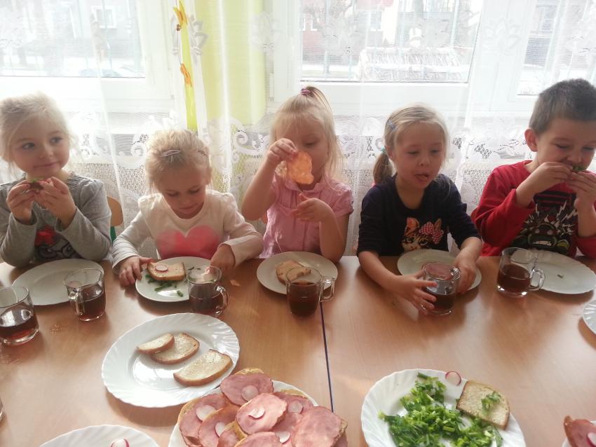 W ubiegły piątek „Roztańczone nutki” miały okazję zjeść wspólne, nieco inne niż zawsze śniadanie. Szczypiorek, który wspólnie posadziliśmy w końcu urósł i nadawał się do zjedzenia. Na początku dokładnie go umyliśmy, a potem zabraliśmy się za krojenie i robienie pysznego śniadania. Kanapki przez nas wykonane nie tylko były smaczne, zdrowe ale i pięknie ozdobione. Pamiętać należy, że najlepiej smakują kanapki wykonane własnoręcznie, dlatego wszyscy zjedli je z ogromnym apetytem. Wspólne śniadanie bardzo podobało się „Roztańczonym nutkom” i już nie mogą doczekać się kolejnego posiłku przy wspólnym stole.