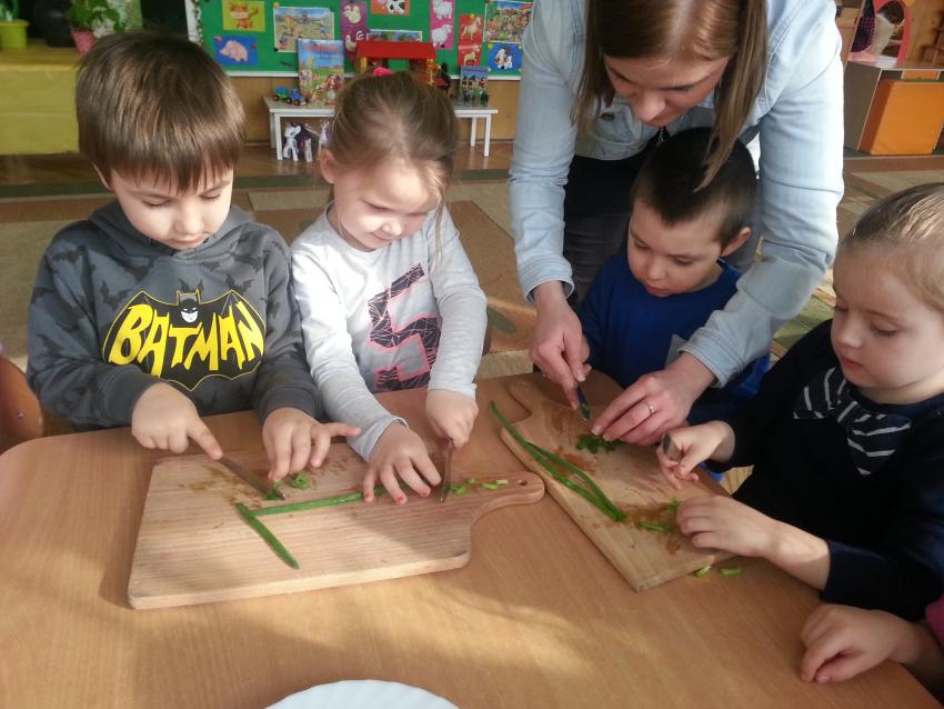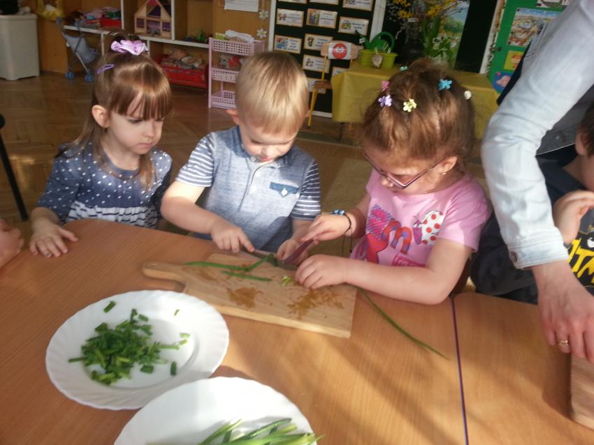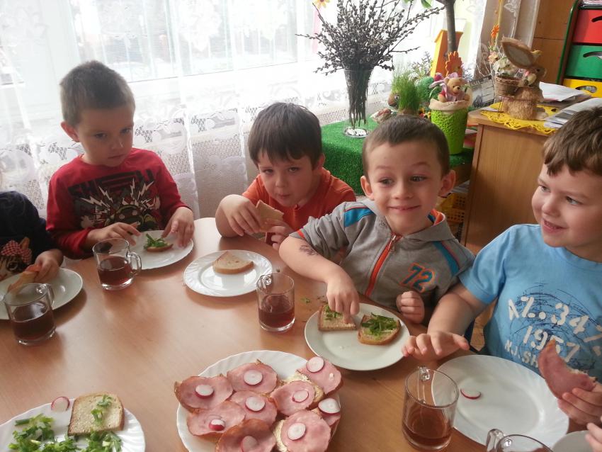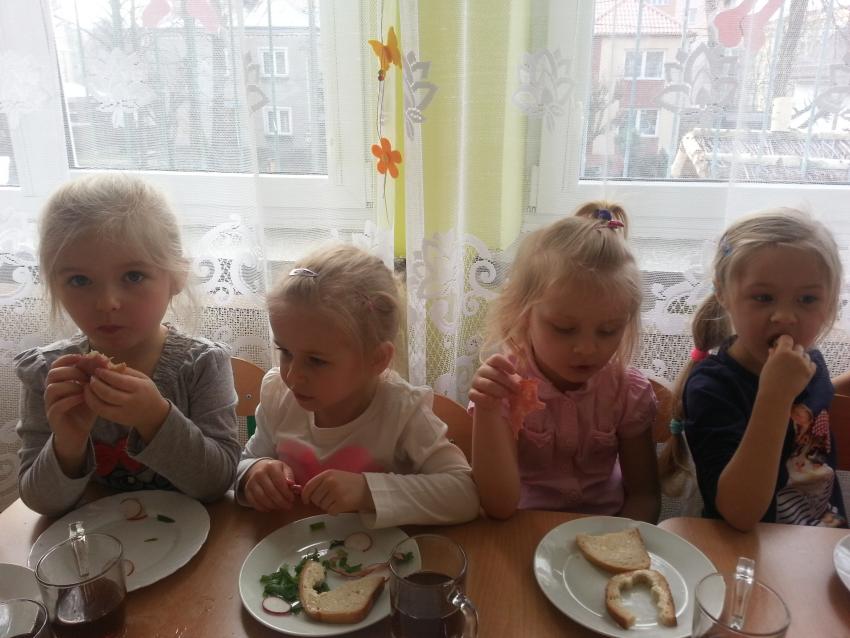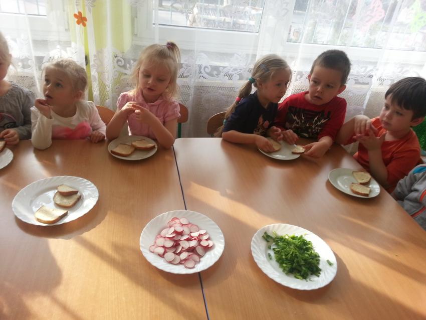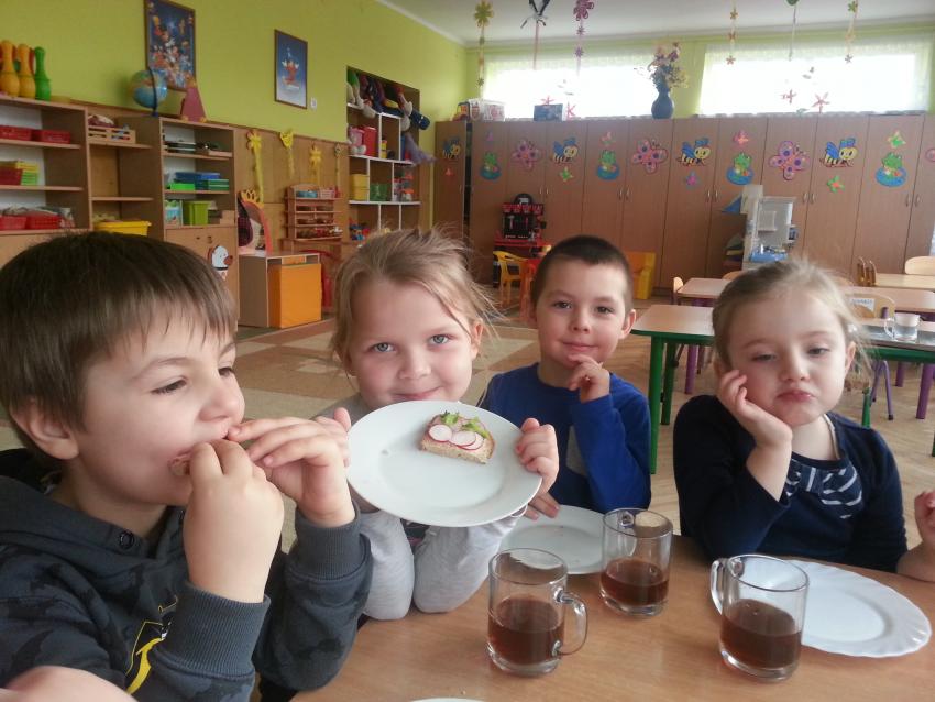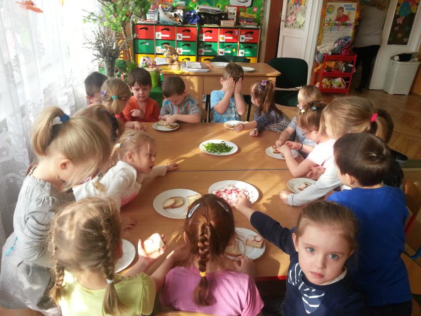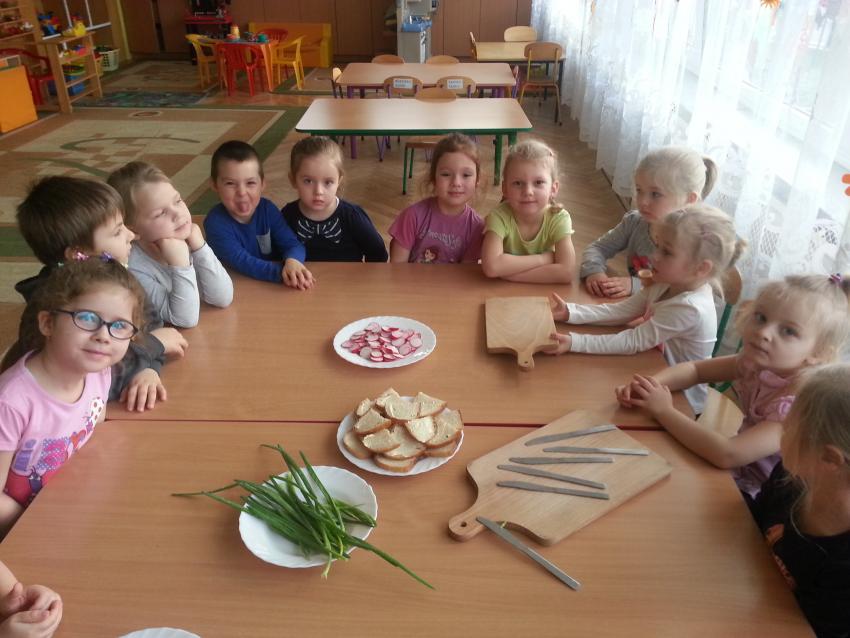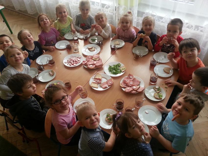 W ubiegły piątek „Roztańczone nutki” miały okazję zjeść wspólne, nieco inne niż zawsze śniadanie. Szczypiorek, który wspólnie posadziliśmy w końcu urósł i nadawał się do zjedzenia. Na początku dokładnie go umyliśmy, a potem zabraliśmy się za krojenie i robienie pysznego śniadania. Kanapki przez nas wykonane nie tylko były smaczne, zdrowe ale i pięknie ozdobione. Pamiętać należy, że najlepiej smakują kanapki wykonane własnoręcznie, dlatego wszyscy zjedli je z ogromnym apetytem. Wspólne śniadanie bardzo podobało się „Roztańczonym nutkom” i już nie mogą doczekać się kolejnego posiłku przy wspólnym stole.