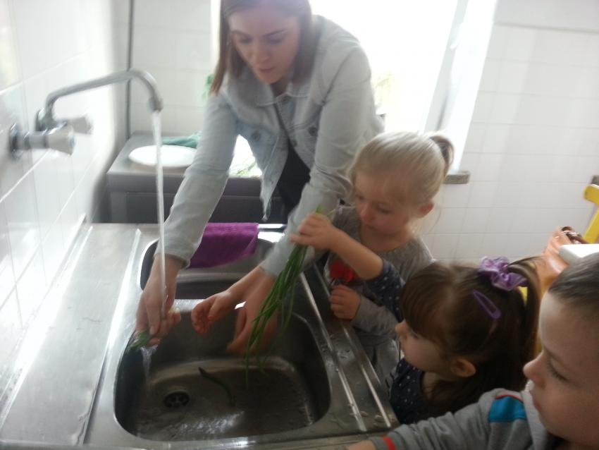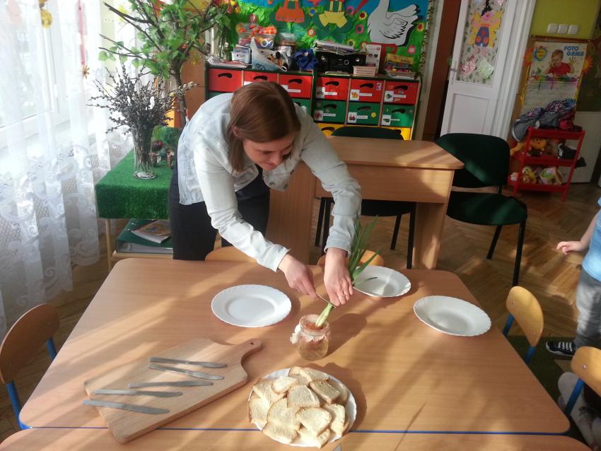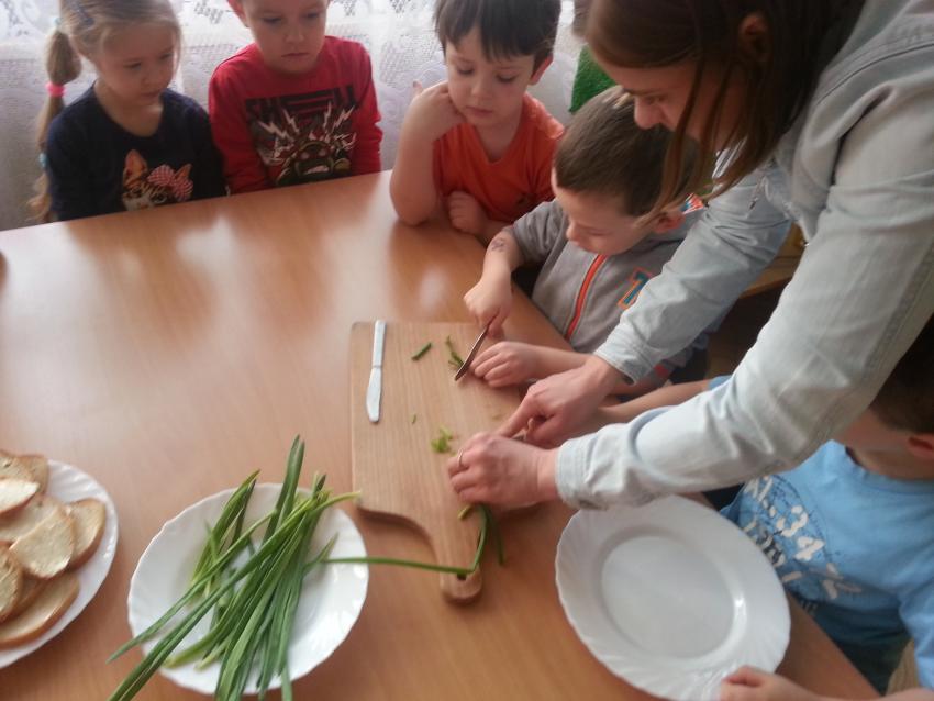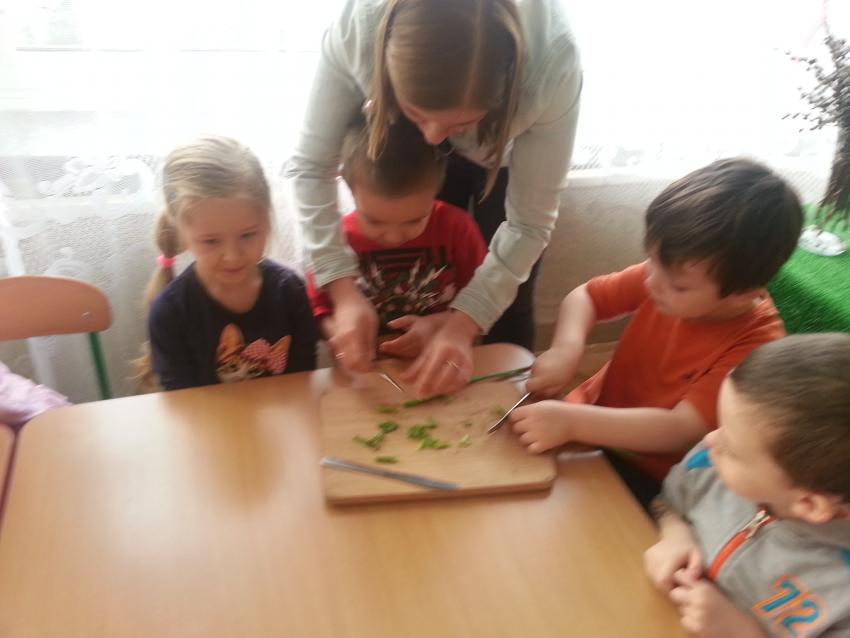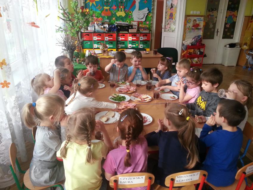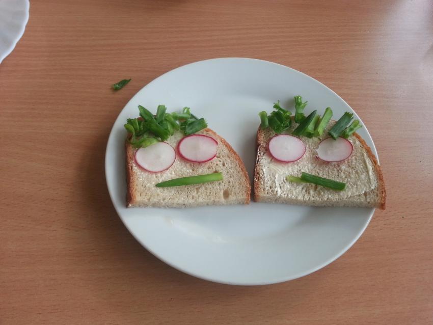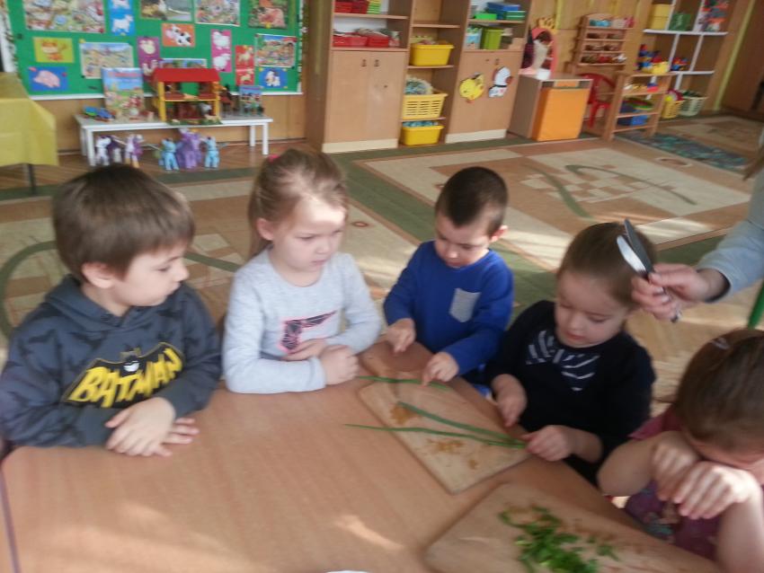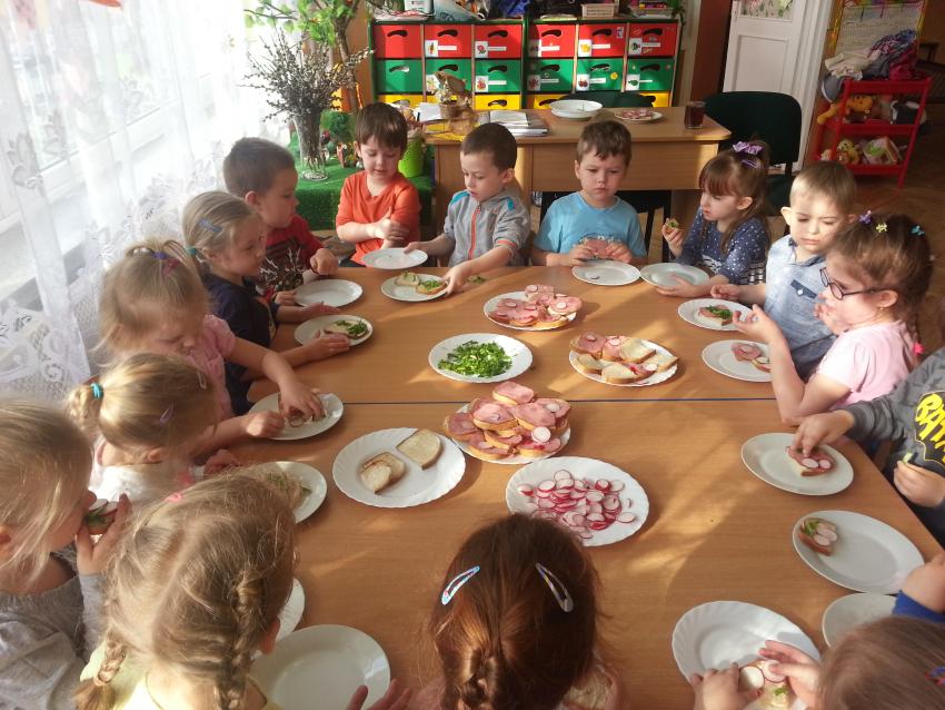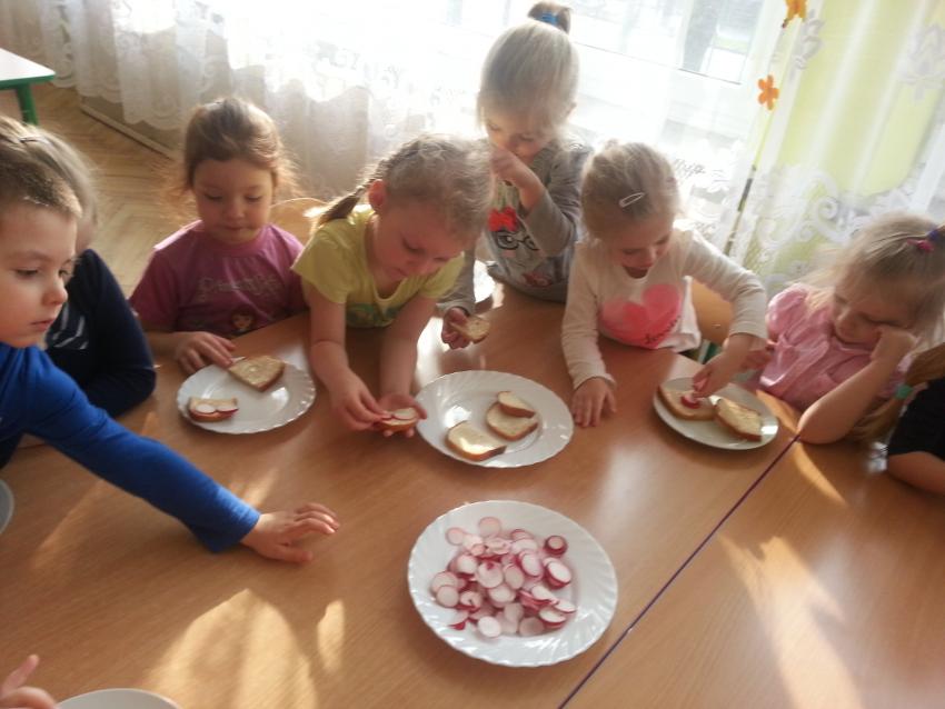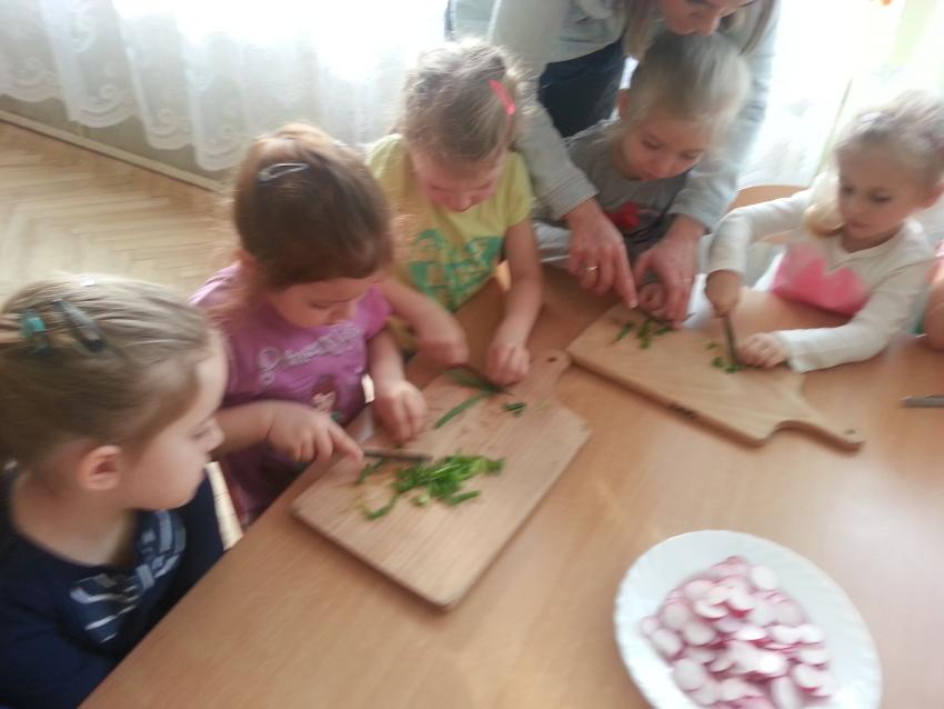 W ubiegły piątek „Roztańczone nutki” miały okazję zjeść wspólne, nieco inne niż zawsze śniadanie. Szczypiorek, który wspólnie posadziliśmy w końcu urósł i nadawał się do zjedzenia. Na początku dokładnie go umyliśmy, a potem zabraliśmy się za krojenie i robienie pysznego śniadania. Kanapki przez nas wykonane nie tylko były smaczne, zdrowe ale i pięknie ozdobione. Pamiętać należy, że najlepiej smakują kanapki wykonane własnoręcznie, dlatego wszyscy zjedli je z ogromnym apetytem. Wspólne śniadanie bardzo podobało się „Roztańczonym nutkom” i już nie mogą doczekać się kolejnego posiłku przy wspólnym stole.