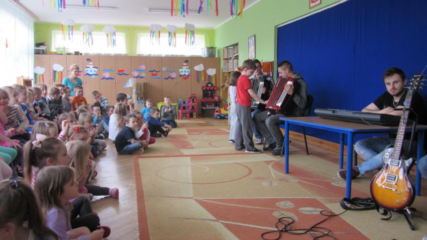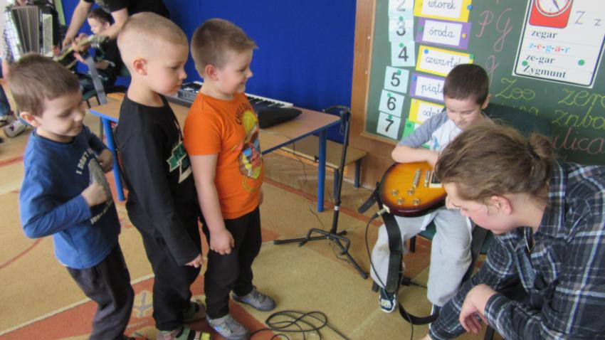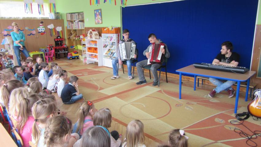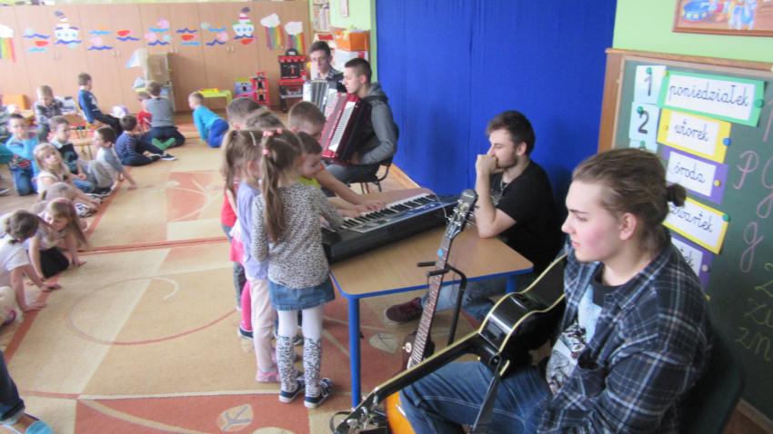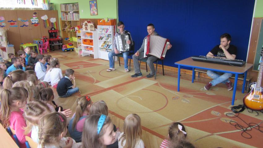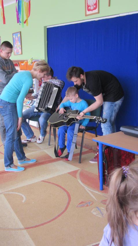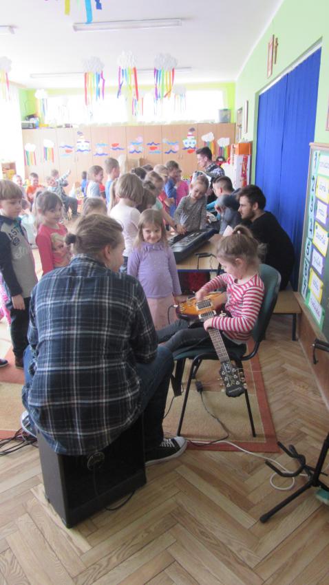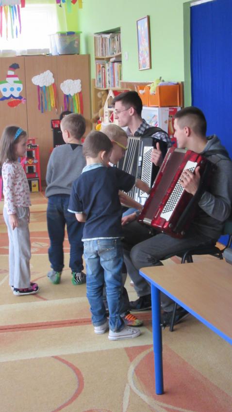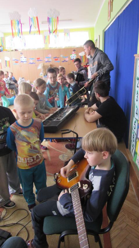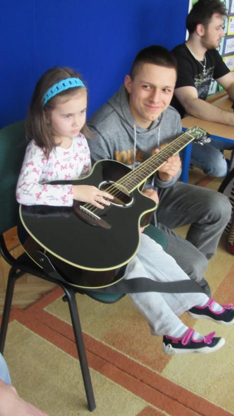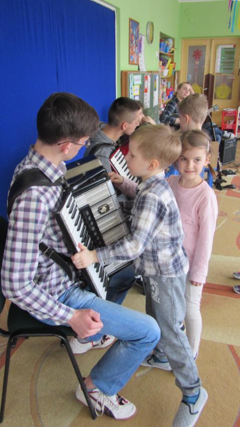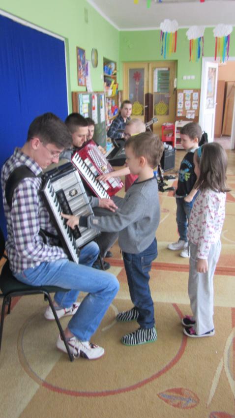 Starszaki odwiedzili uczniowie z ZSR w Sokółce z opiekunem kółka teatralnego panią Jolantą Czyżewską – mamą jednego z naszych przedszkolaków. W ramach omawianej przez nas tematyki zaprezentowali nam instrumenty na których grają. Dzieci również mogły spróbować swoich sił jako muzycy.