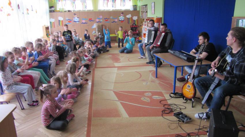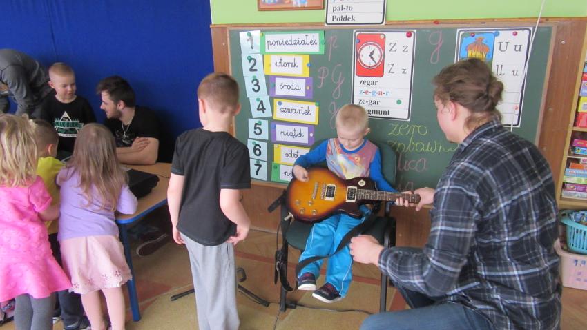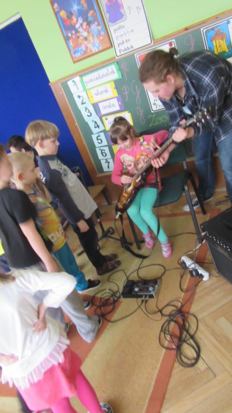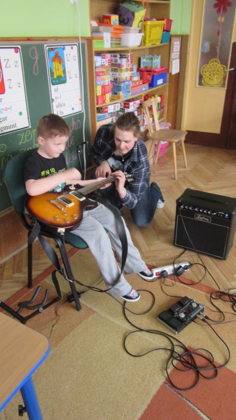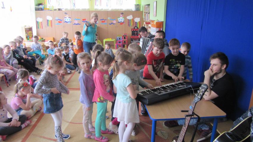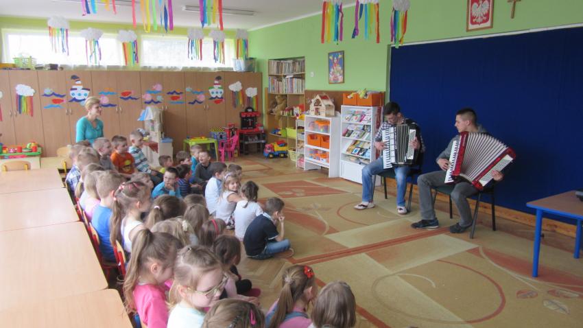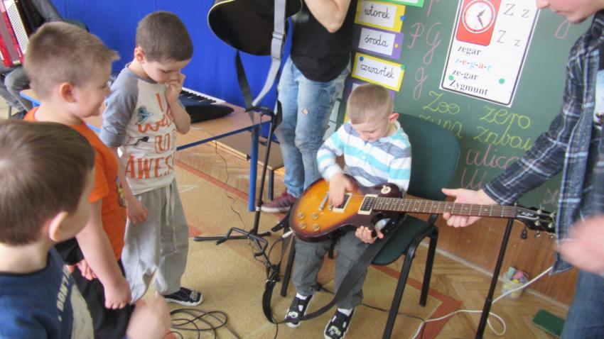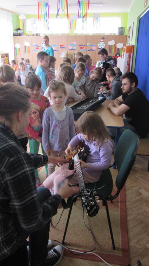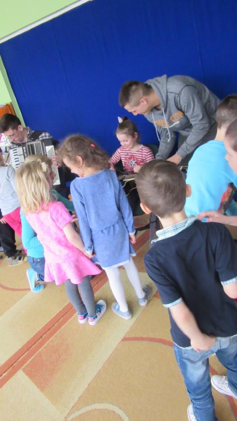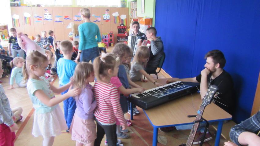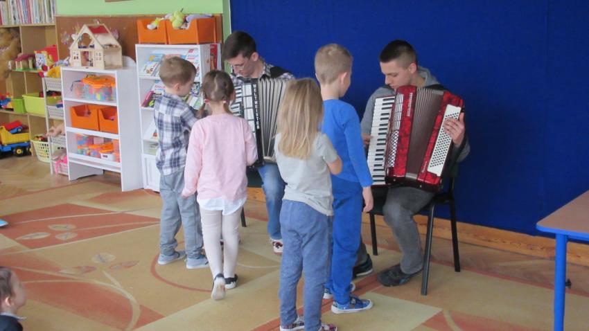 Starszaki odwiedzili uczniowie z ZSR w Sokółce z opiekunem kółka teatralnego panią Jolantą Czyżewską – mamą jednego z naszych przedszkolaków. W ramach omawianej przez nas tematyki zaprezentowali nam instrumenty na których grają. Dzieci również mogły spróbować swoich sił jako muzycy.
