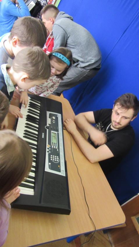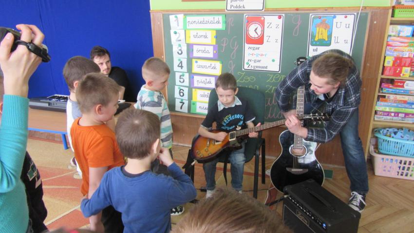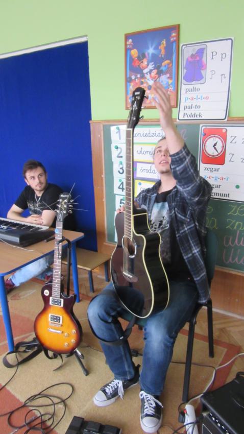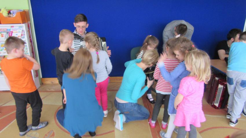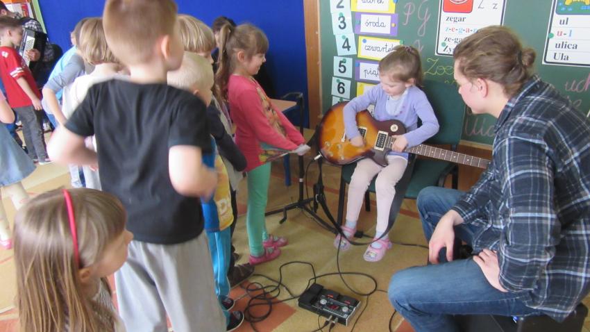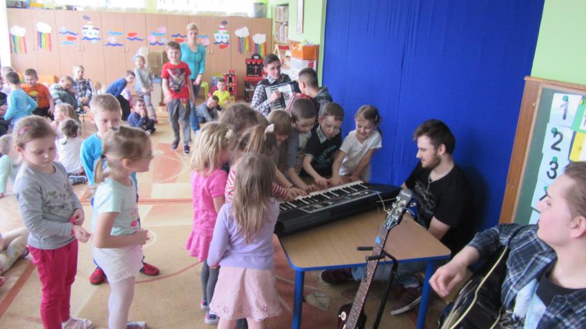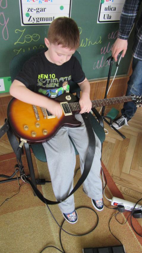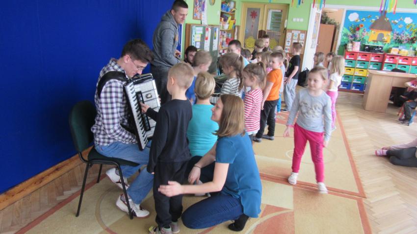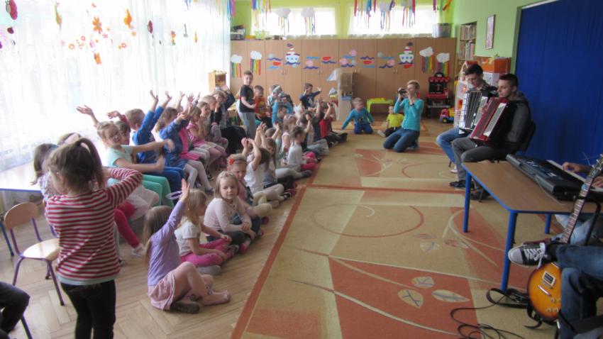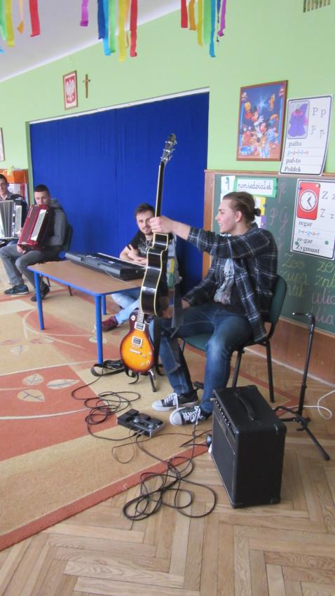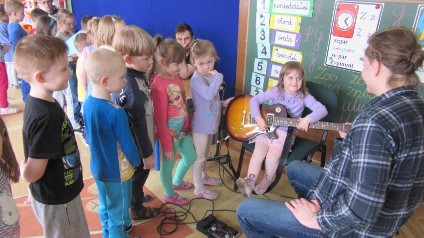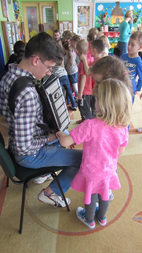 Starszaki odwiedzili uczniowie z ZSR w Sokółce z opiekunem kółka teatralnego panią Jolantą Czyżewską – mamą jednego z naszych przedszkolaków. W ramach omawianej przez nas tematyki zaprezentowali nam instrumenty na których grają. Dzieci również mogły spróbować swoich sił jako muzycy.