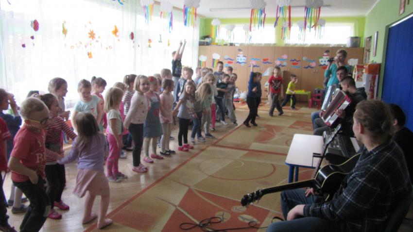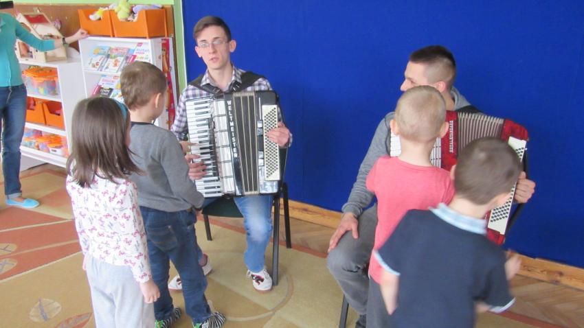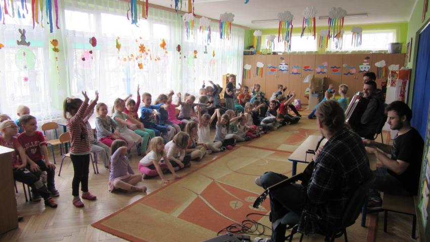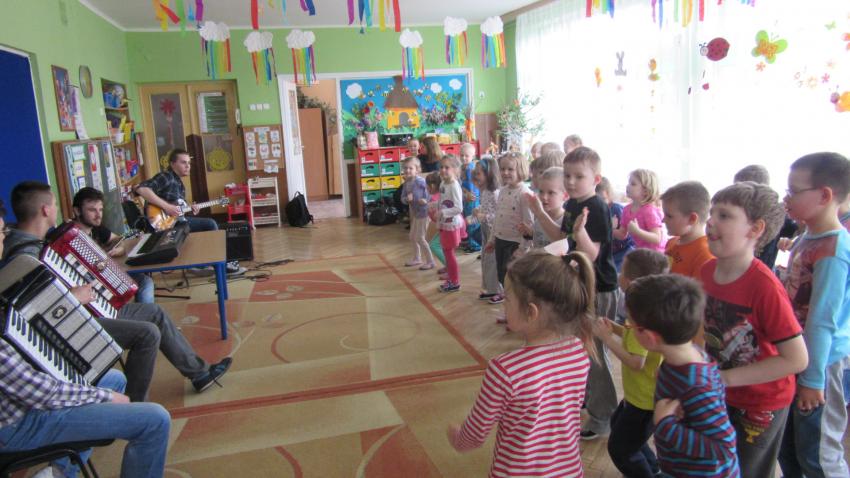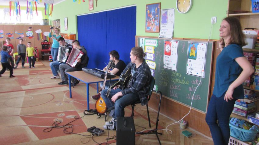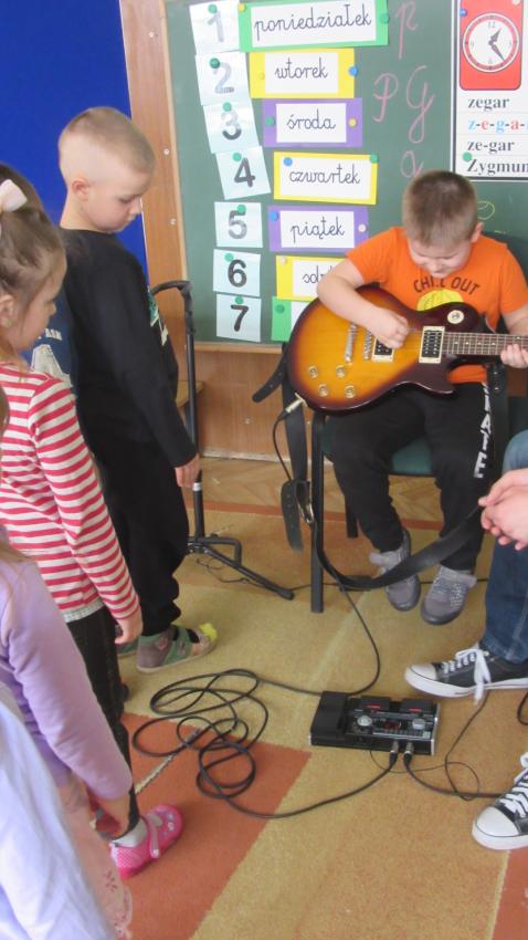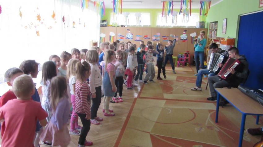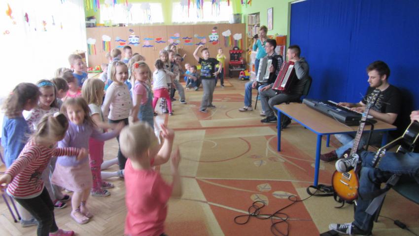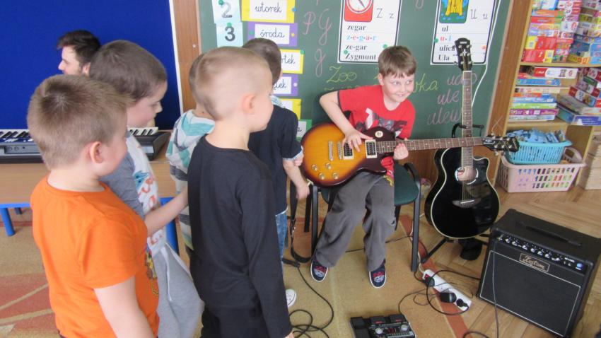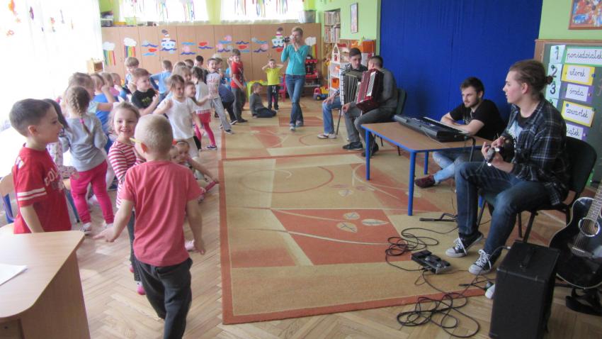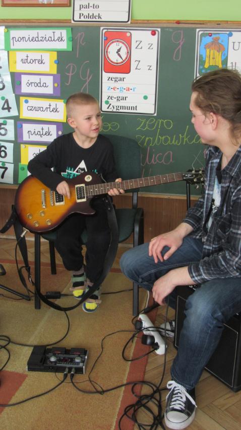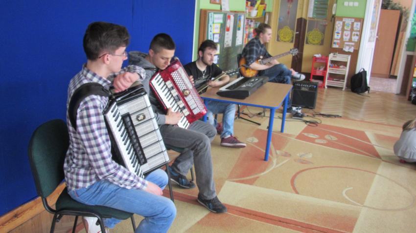 Starszaki odwiedzili uczniowie z ZSR w Sokółce z opiekunem kółka teatralnego panią Jolantą Czyżewską – mamą jednego z naszych przedszkolaków. W ramach omawianej przez nas tematyki zaprezentowali nam instrumenty na których grają. Dzieci również mogły spróbować swoich sił jako muzycy.