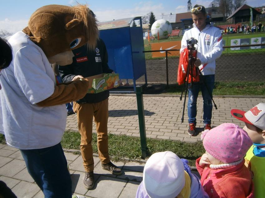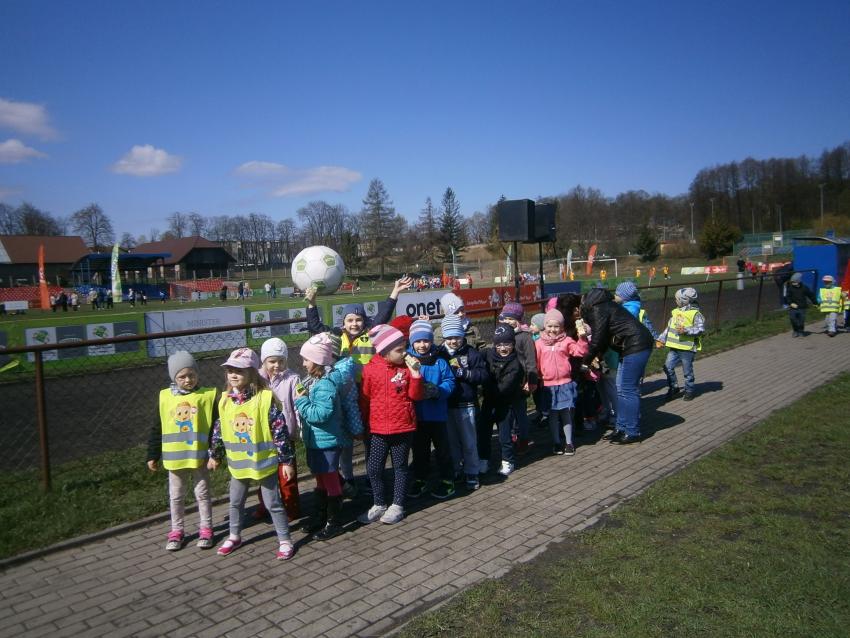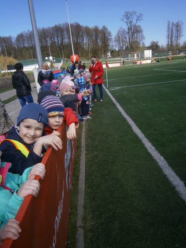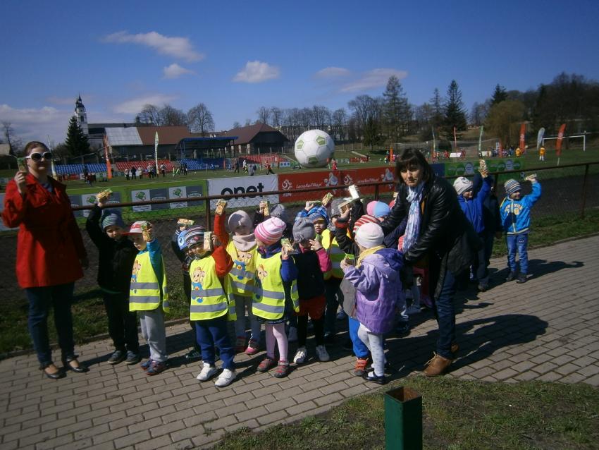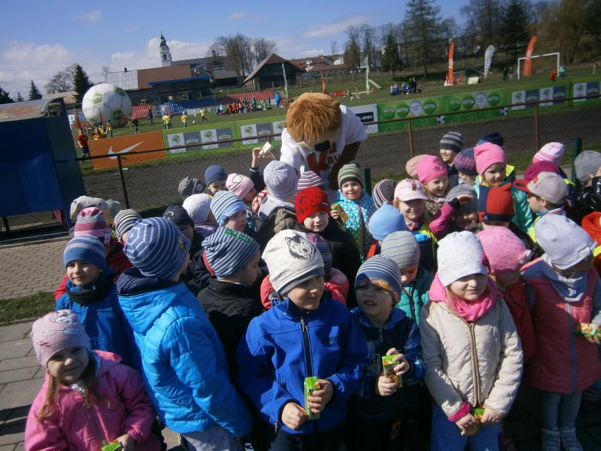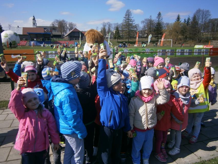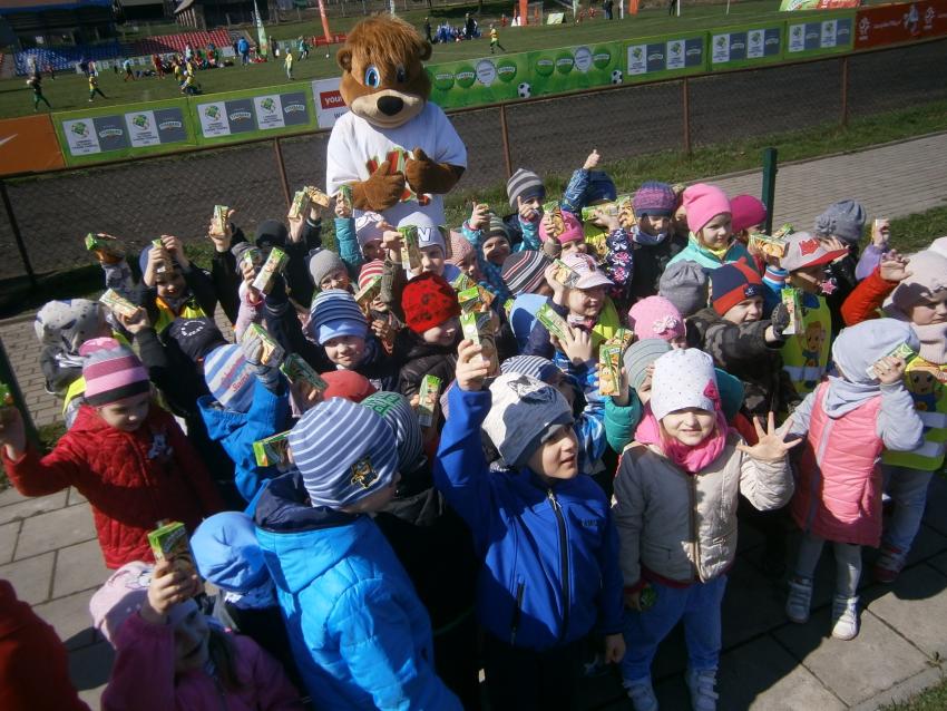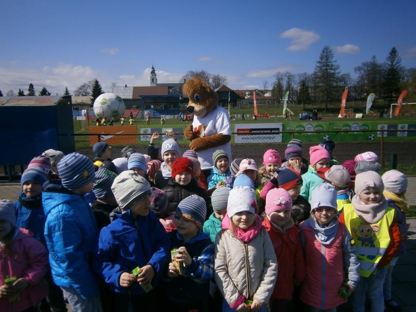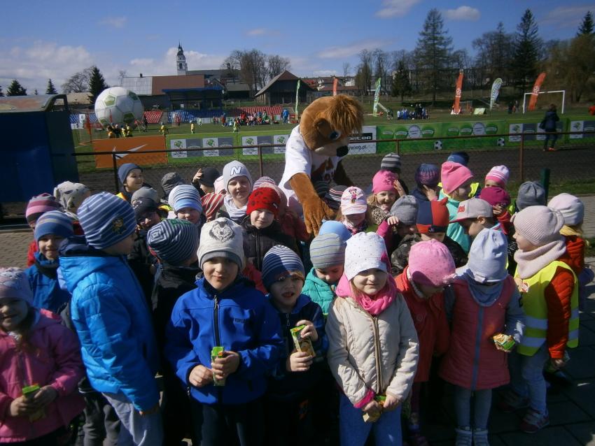 W piątek 15.04.2016 przedszkolaki z grupy „Zaczarowane pacynki” i „Tęczowe kredki” wybrały się na stadion OSiR w Sokółce. Odbywał się tam finał wojewódzki turnieju piłki nożnej „Z podwórka na stadion” o Puchar Tymbarku. Dzieci miały okazje obserwować rozgrywki sportowe zarówno chłopców jak i dziewczyn. Jedną z atrakcji był KUBUŚ, który przyszedł się do nas przywitać i wręczył nam pyszne soczki. Na pamiątkę mogliśmy zrobić sobie zdjęcie z nowym kolegą.