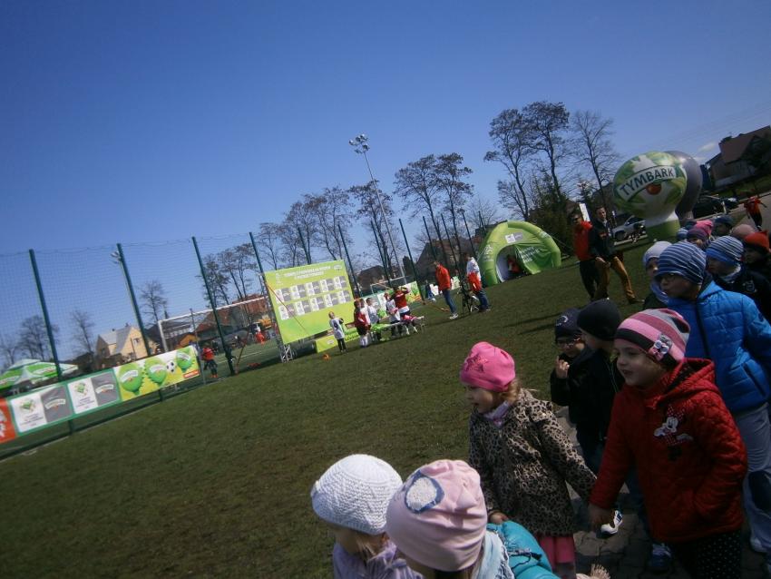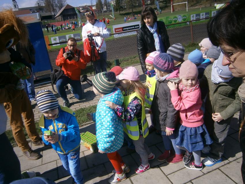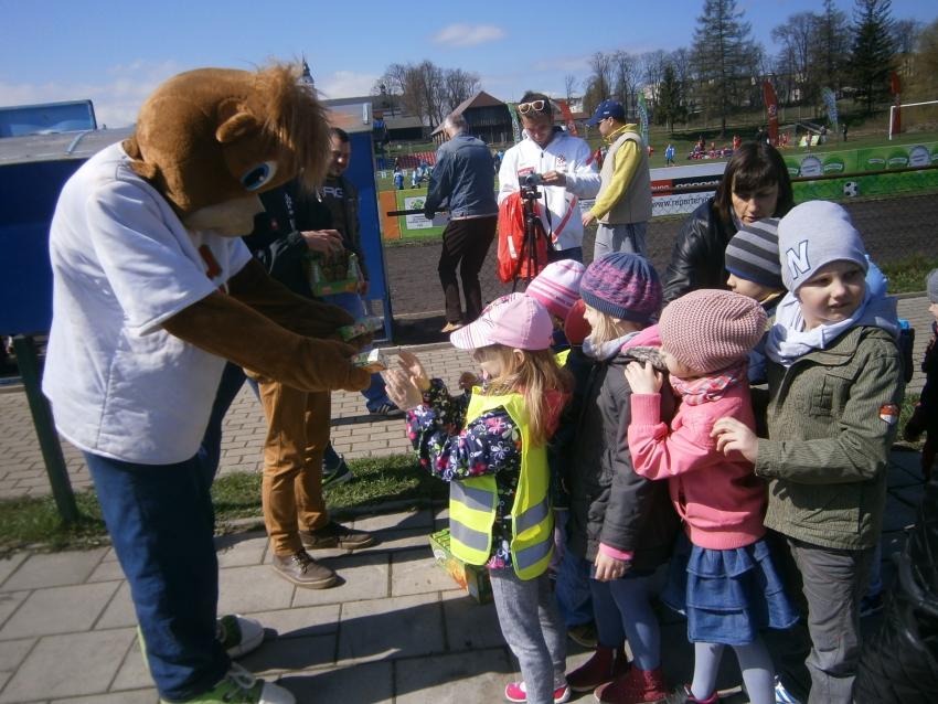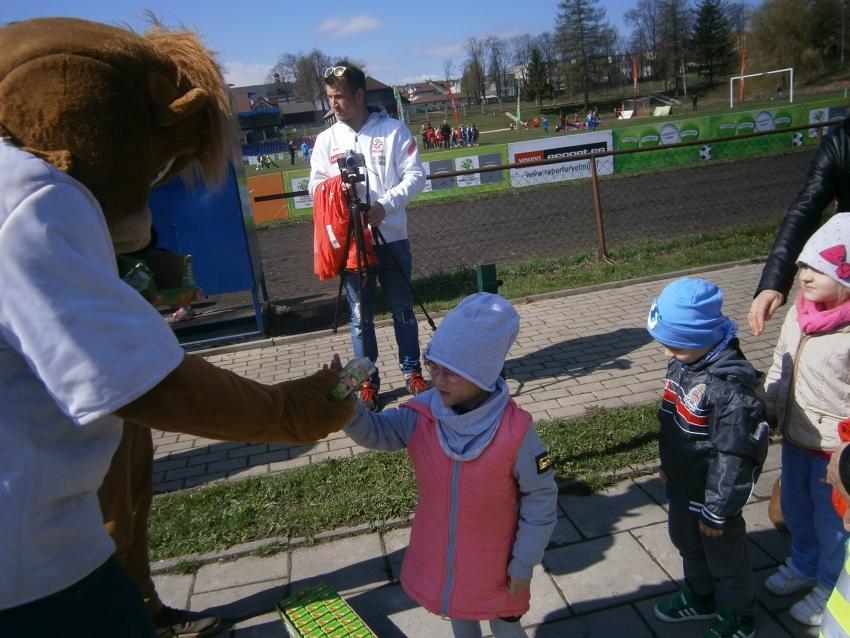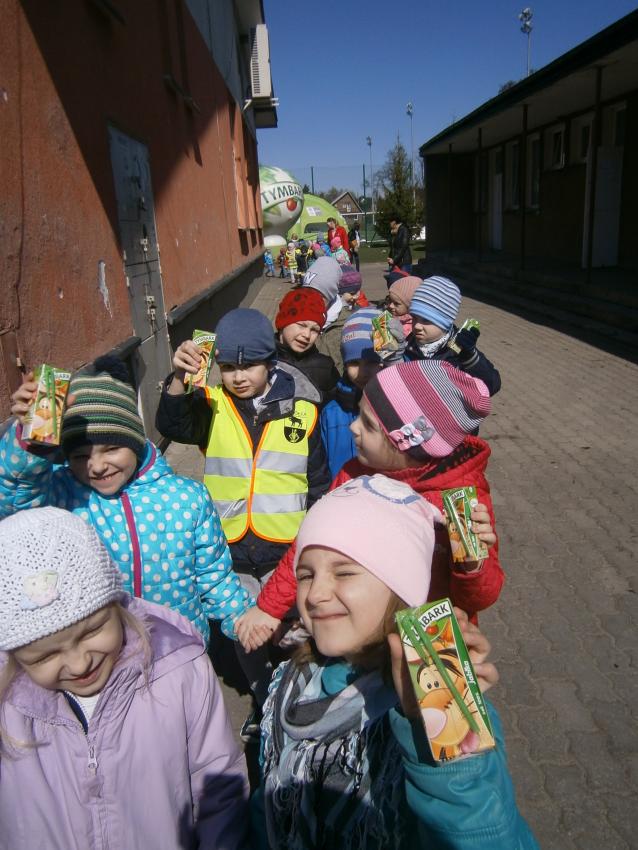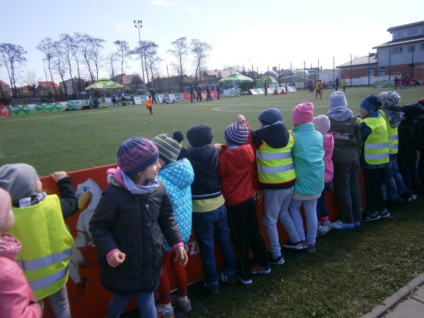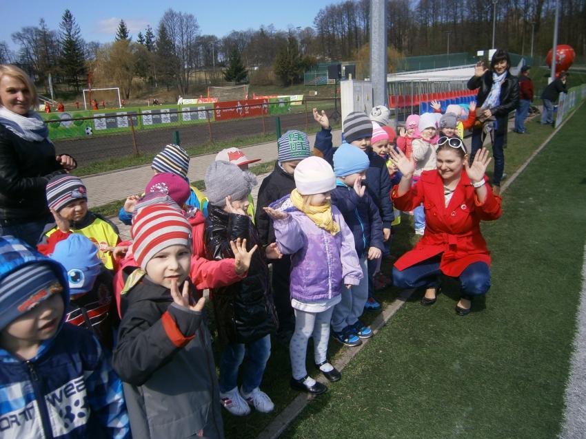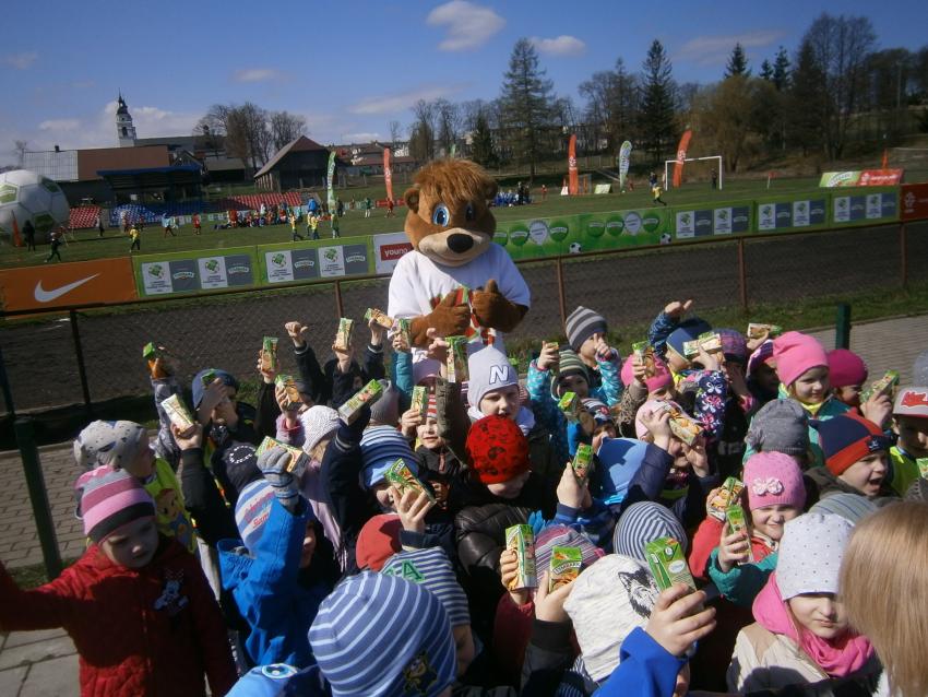 W piątek 15.04.2016 przedszkolaki z grupy „Zaczarowane pacynki” i „Tęczowe kredki” wybrały się na stadion OSiR w Sokółce. Odbywał się tam finał wojewódzki turnieju piłki nożnej „Z podwórka na stadion” o Puchar Tymbarku. Dzieci miały okazje obserwować rozgrywki sportowe zarówno chłopców jak i dziewczyn. Jedną z atrakcji był KUBUŚ, który przyszedł się do nas przywitać i wręczył nam pyszne soczki. Na pamiątkę mogliśmy zrobić sobie zdjęcie z nowym kolegą.
