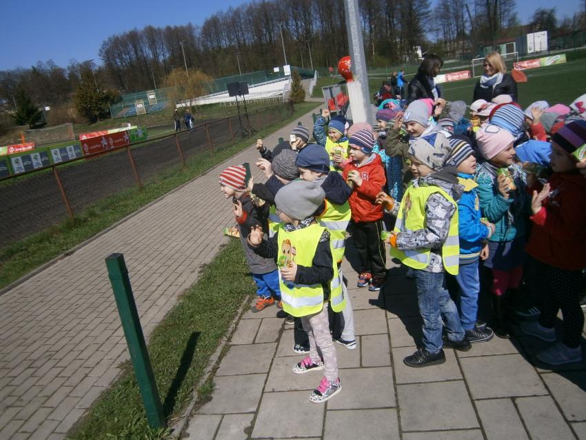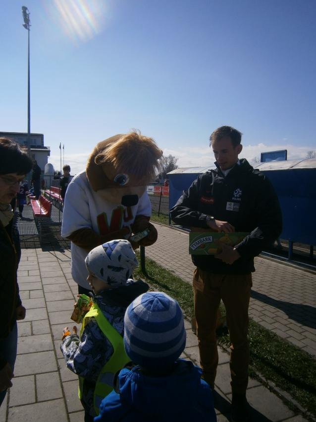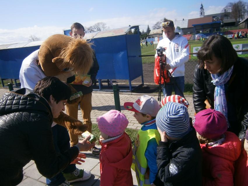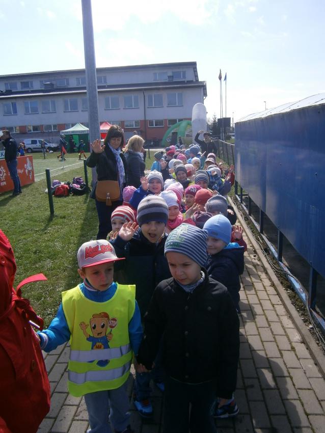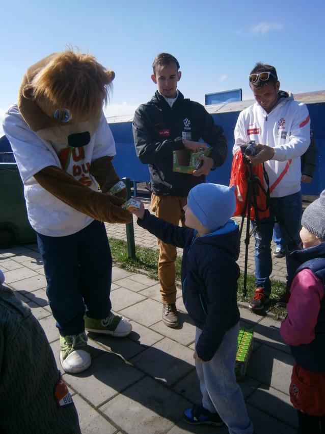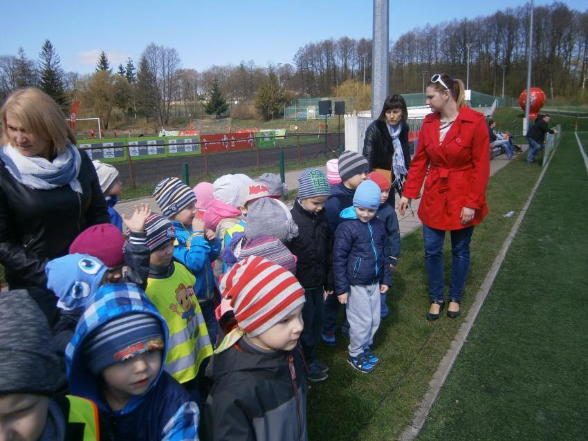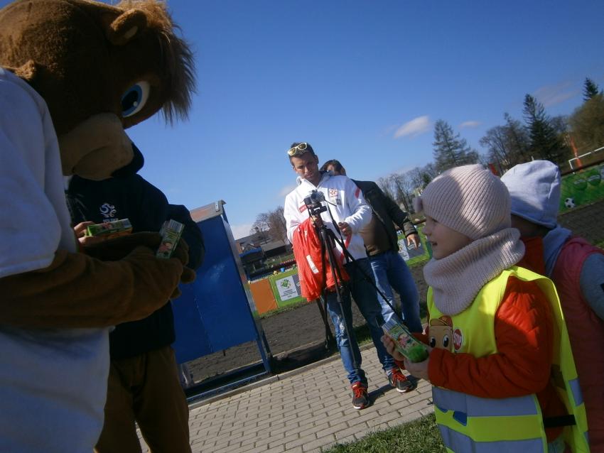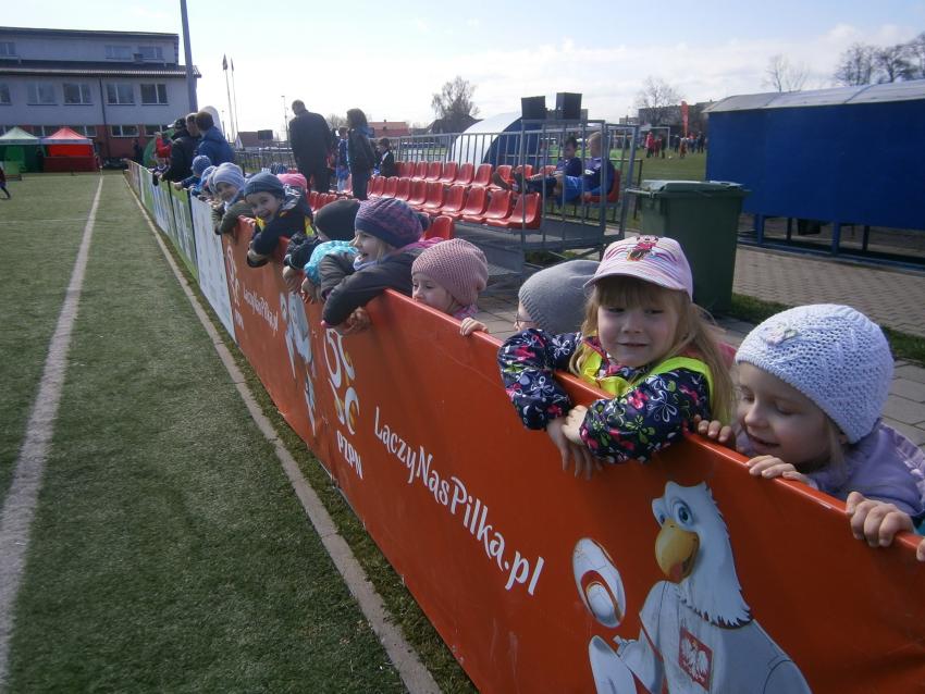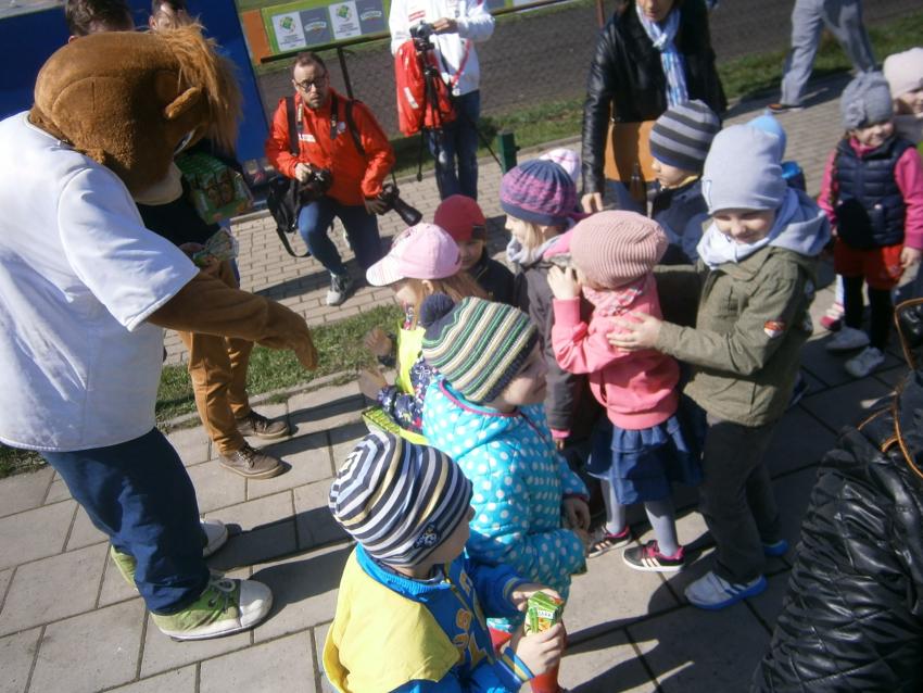 W piątek 15.04.2016 przedszkolaki z grupy „Zaczarowane pacynki” i „Tęczowe kredki” wybrały się na stadion OSiR w Sokółce. Odbywał się tam finał wojewódzki turnieju piłki nożnej „Z podwórka na stadion” o Puchar Tymbarku. Dzieci miały okazje obserwować rozgrywki sportowe zarówno chłopców jak i dziewczyn. Jedną z atrakcji był KUBUŚ, który przyszedł się do nas przywitać i wręczył nam pyszne soczki. Na pamiątkę mogliśmy zrobić sobie zdjęcie z nowym kolegą.