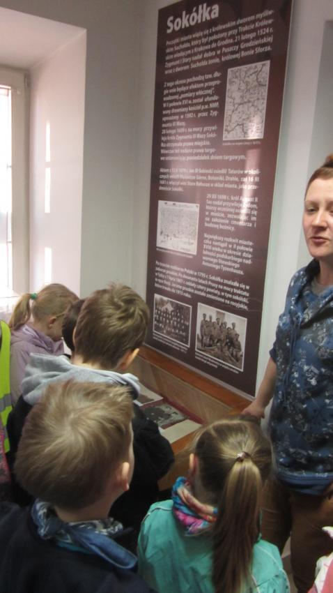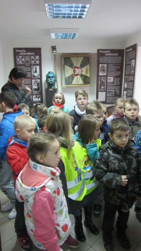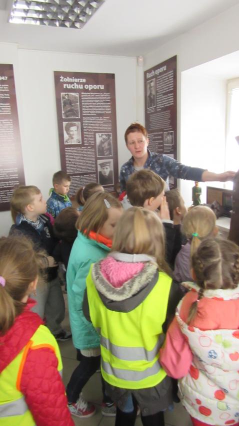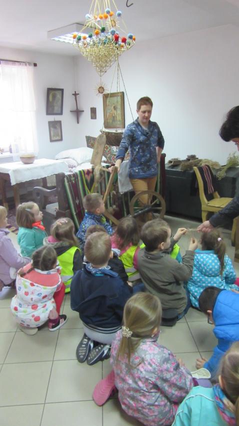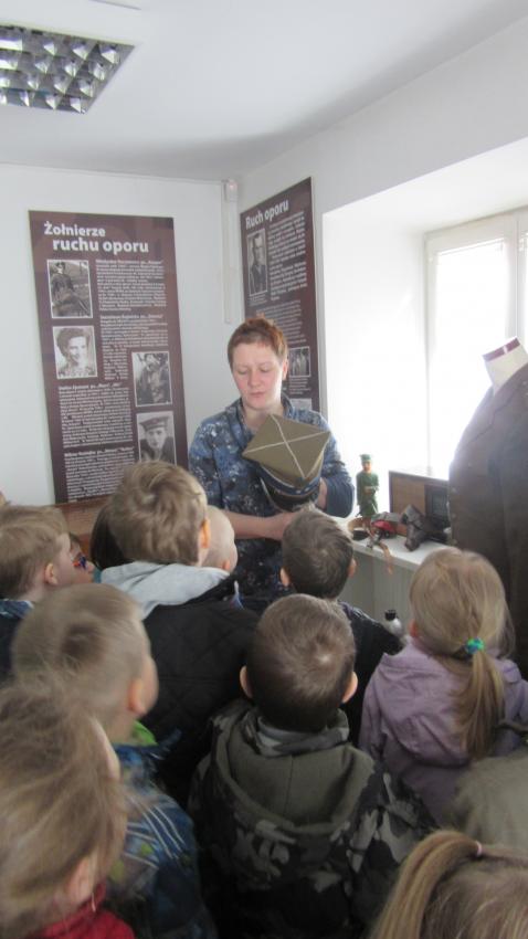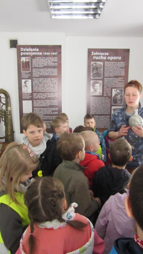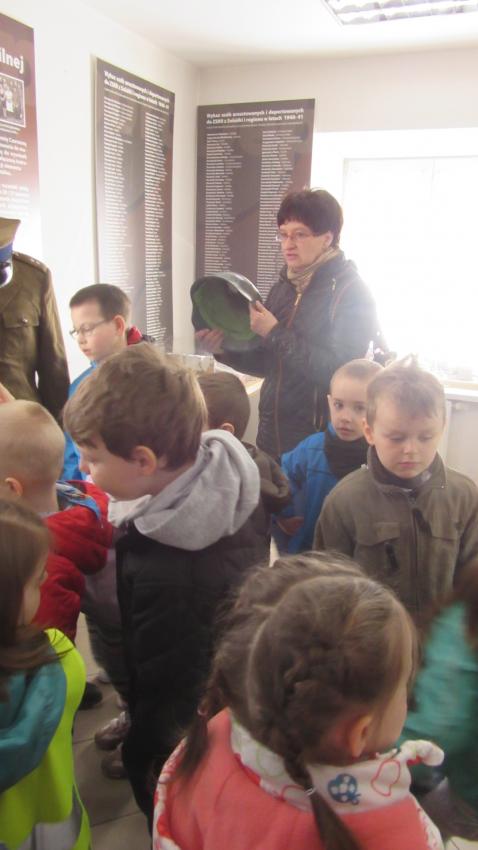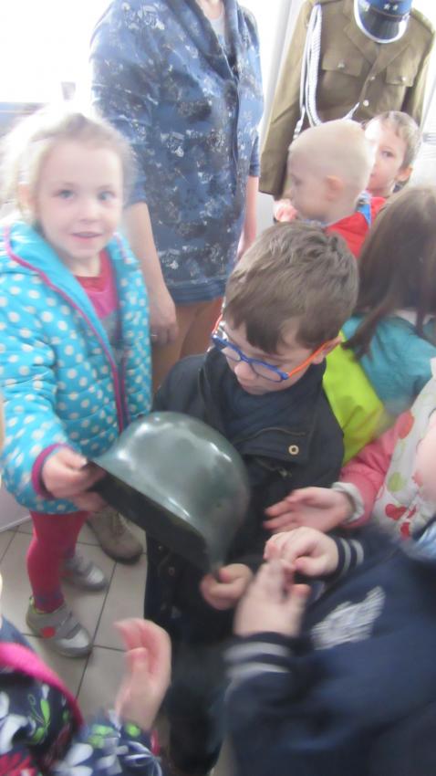 W czwartek 21.04.2016 r. przedszkolaki z grupy „Tęczowe kredki” zwiedzały Muzeum Ziemi Sokólskiej. Oglądaliśmy zbiory przedmiotów użytkowych związanych z życiem codziennym na wsi sokólskiej, podziwialiśmy zaaranżowane wnętrze izby wiejskiej oraz zbiór pięknych tkanin powstałych na tradycyjnych warsztatach tkackich. Ze względów na realizowaną w naszej grupie innowację pedagogiczną „Historia w przedszkolu” głównie uwagę zwróciliśmy na wystawę historyczną, która w przystępny sposób przybliża historię miasta oraz prezentuje pamiątki ofiarowane przez mieszkańców Ziemi Sokólskiej. Naszych przedszkolaków zainteresował szczególnie mundur i atrybuty żołnierskie.