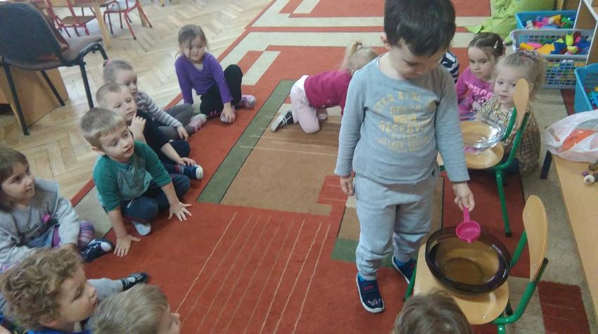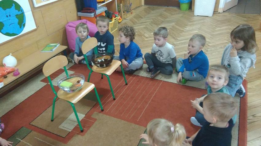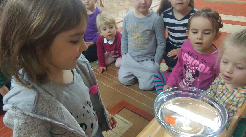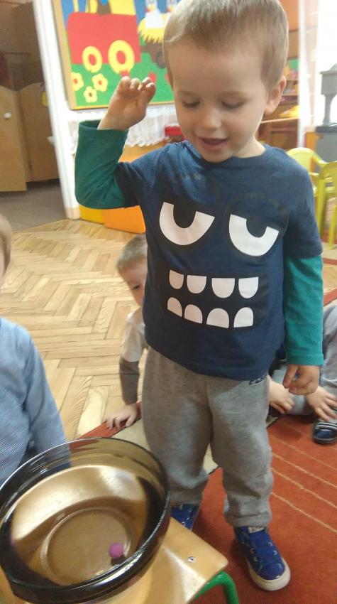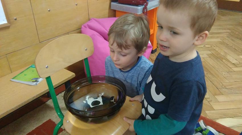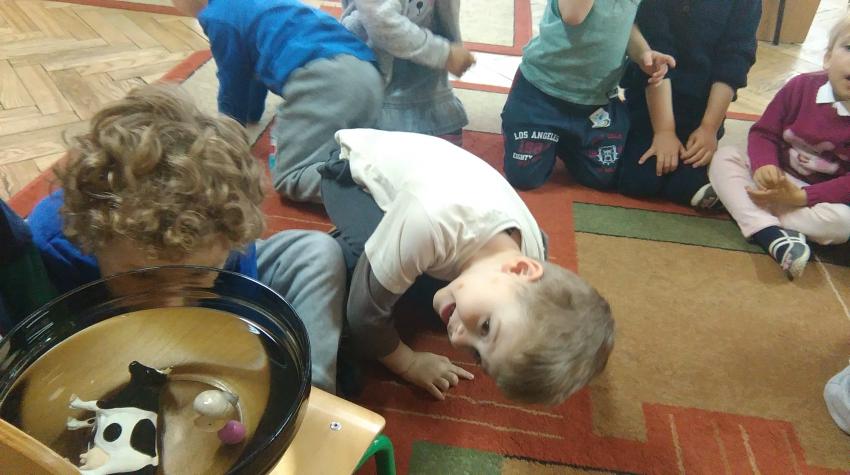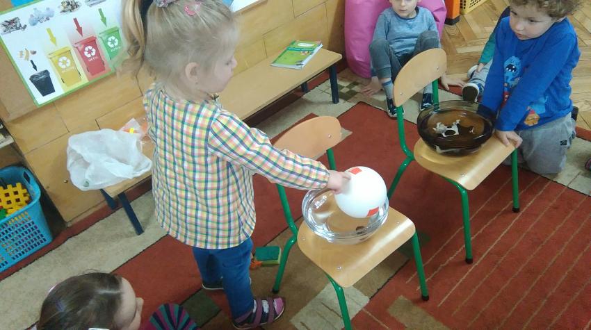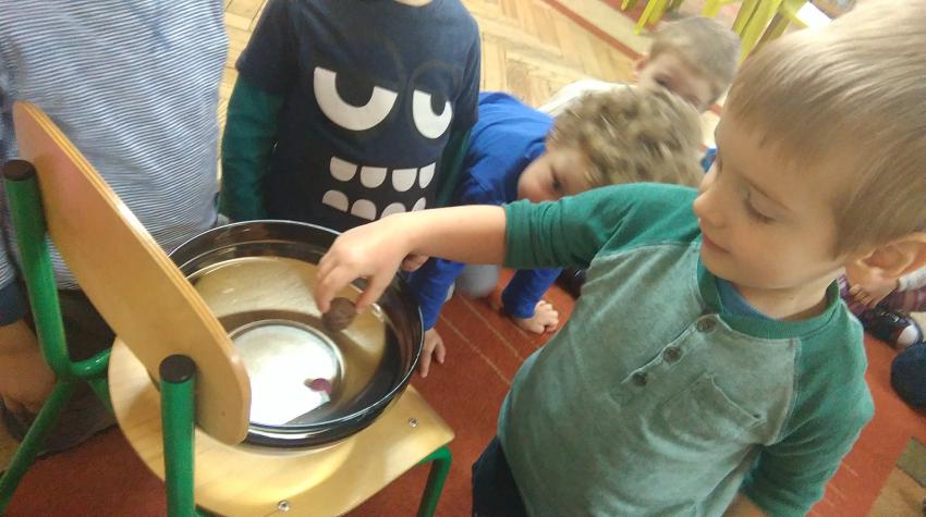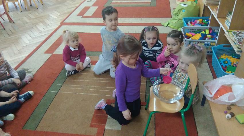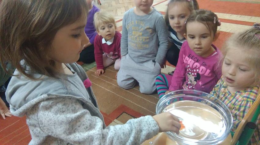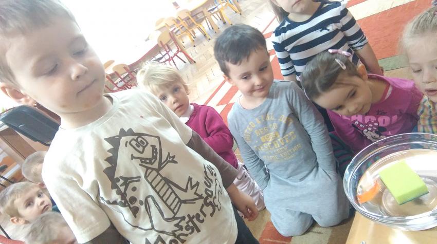 Wesołe Dzwoneczki sprawdzały, które przedmioty potrafią utrzymywać się na powierzchni wody, a które toną. Na początku doświadczenia zdania, co do zdolności „pływackich” niektórych przedmiotów, były podzielone. Na końcu eksperymentu dzieci nie miały wątpliwości, że ciężkie przedmioty toną, a lekkie pływają. Przeprowadzony eksperyment wzbudził w dzieciach wielkie zainteresowanie chęcią odkrywania i poznawania świata przyrody. Na koniec zajęć odbyło się uroczyste pasowanie dzieci na Opiekuna Przyroda.