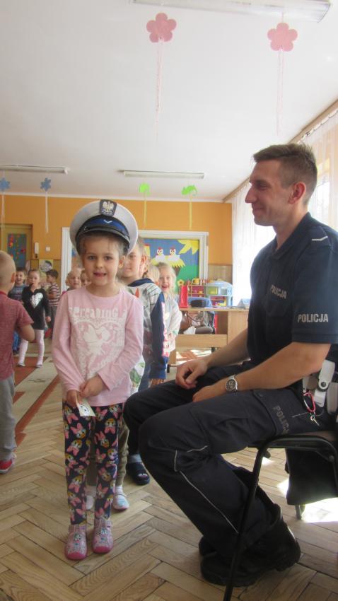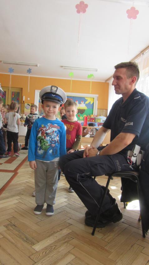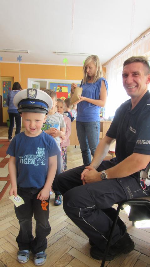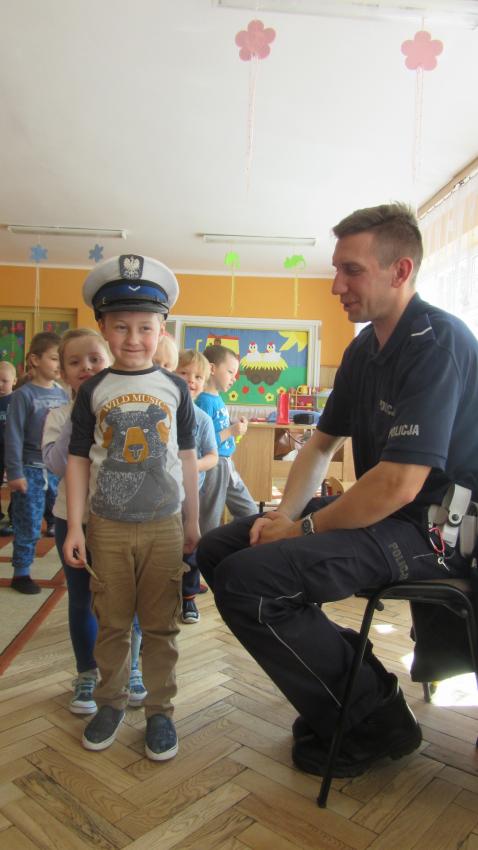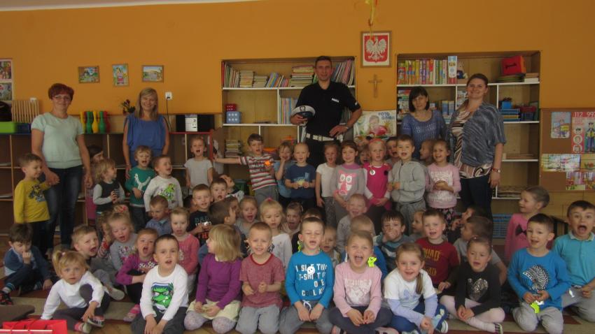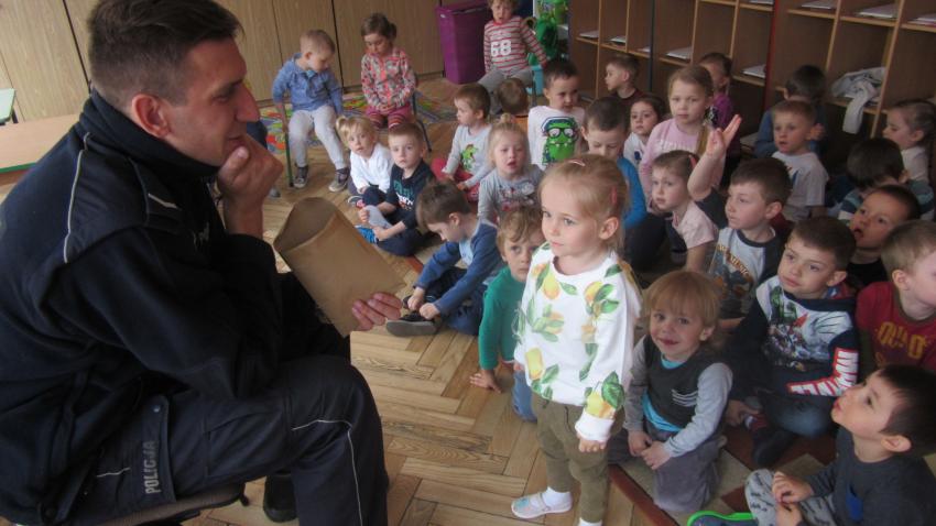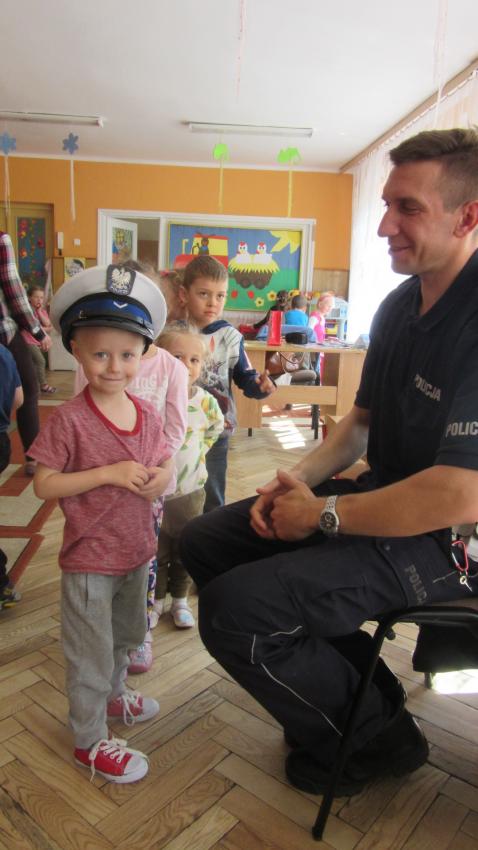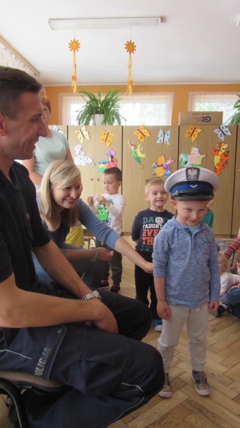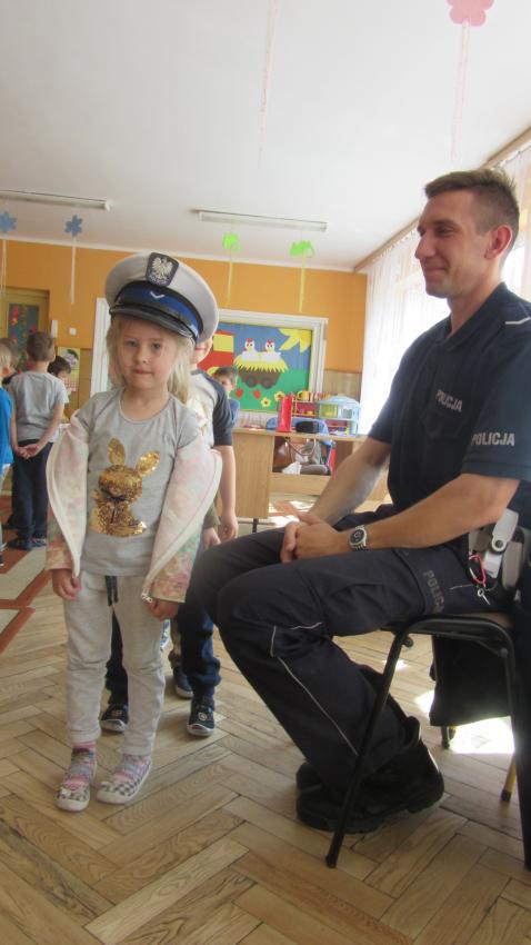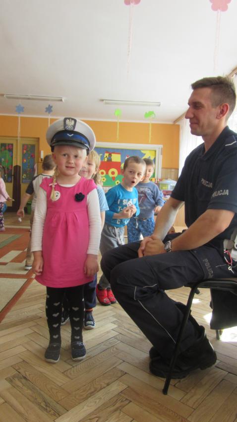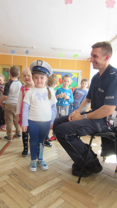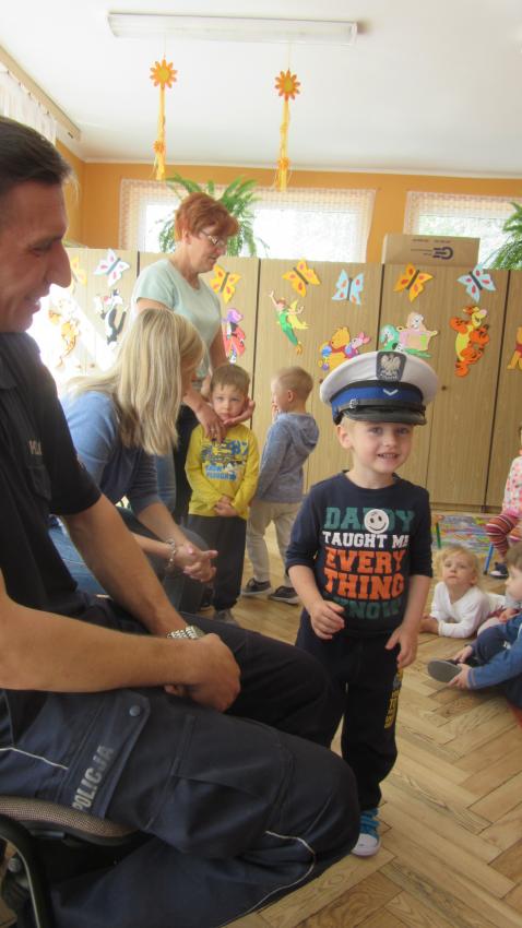 Dzieci z trzech grup „Wesołe Dzwoneczki”, „Zaczarowane Pacynki” i „Roztańczone Nutki” zgromadziły się na zajęciach z Panem Policjantem - Marcinem Połuszejko.  Podczas spotkania przedszkolaki dowiedziały się o tym jak bezpiecznie poruszać się po drogach i podróżować samochodem i rowerem. Nasze przedszkolaki posiadają takie wiadomości i swoją wiedzą chętnie dzieliły się z Panem Policjantem. Nasz gość opowiedział dzieciom o swojej bardzo odpowiedzialnej pracy, o zasadach obowiązujących w ruchu drogowym, a szczególnie o tym, jak należy przewozić dzieci w samochodzie i jakie skutki niesie za sobą jazda bez fotelika. Następnie chętnym przedszkolakom pozwolił przymierzyć akcesoria policyjne, które wzbudziły ogromne zainteresowanie.