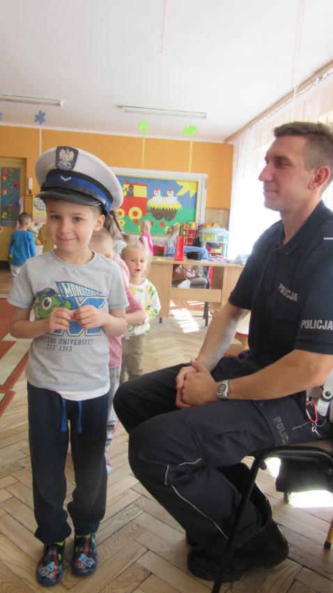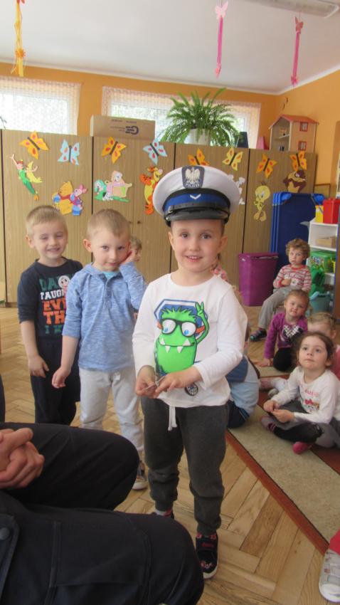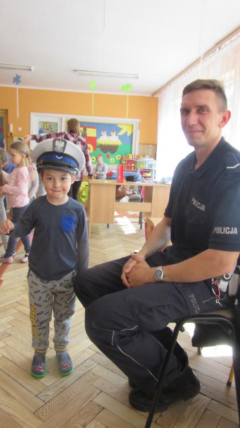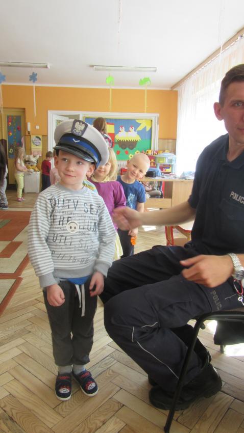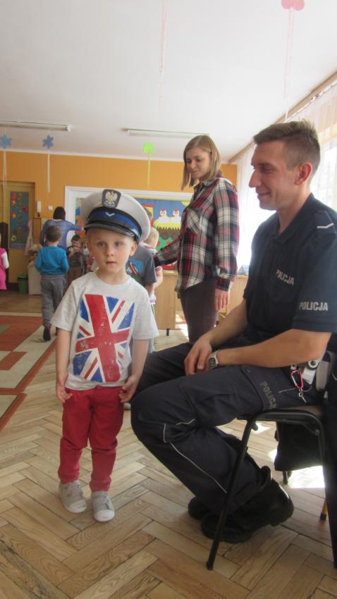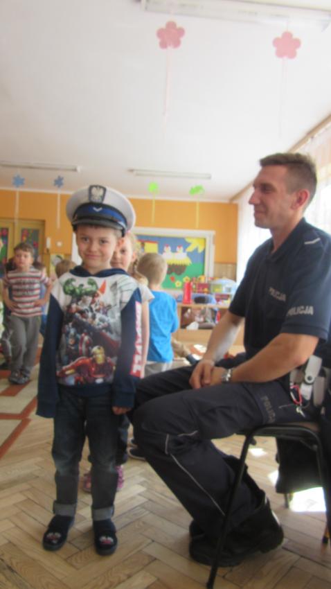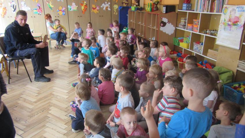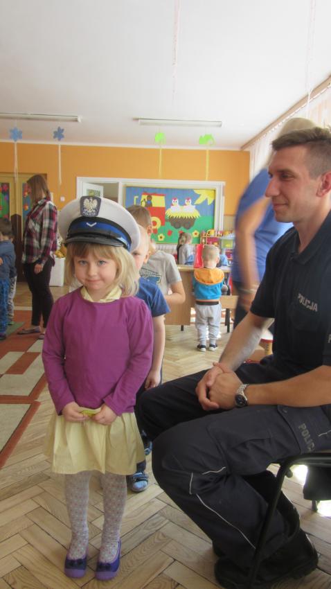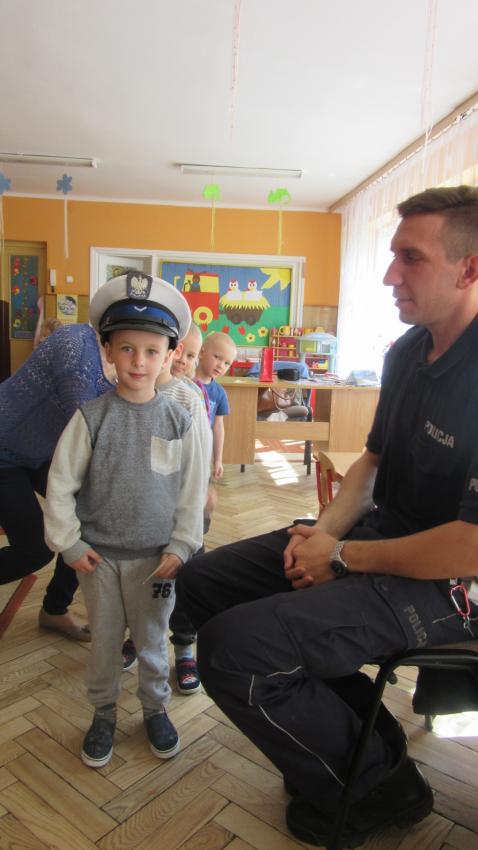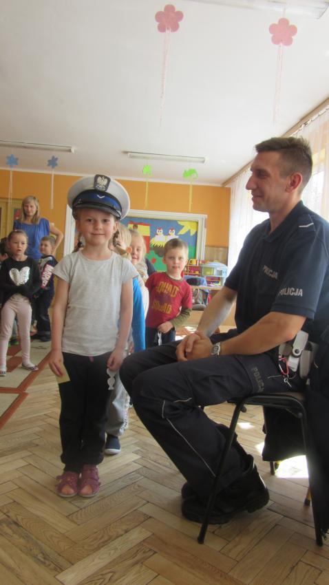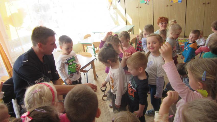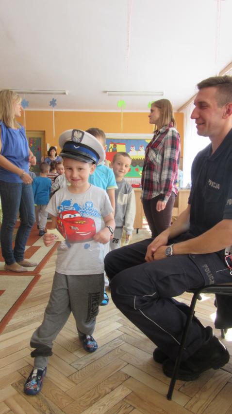 Dzieci z trzech grup „Wesołe Dzwoneczki”, „Zaczarowane Pacynki” i „Roztańczone Nutki” zgromadziły się na zajęciach z Panem Policjantem - Marcinem Połuszejko.  Podczas spotkania przedszkolaki dowiedziały się o tym jak bezpiecznie poruszać się po drogach i podróżować samochodem i rowerem. Nasze przedszkolaki posiadają takie wiadomości i swoją wiedzą chętnie dzieliły się z Panem Policjantem. Nasz gość opowiedział dzieciom o swojej bardzo odpowiedzialnej pracy, o zasadach obowiązujących w ruchu drogowym, a szczególnie o tym, jak należy przewozić dzieci w samochodzie i jakie skutki niesie za sobą jazda bez fotelika. Następnie chętnym przedszkolakom pozwolił przymierzyć akcesoria policyjne, które wzbudziły ogromne zainteresowanie.