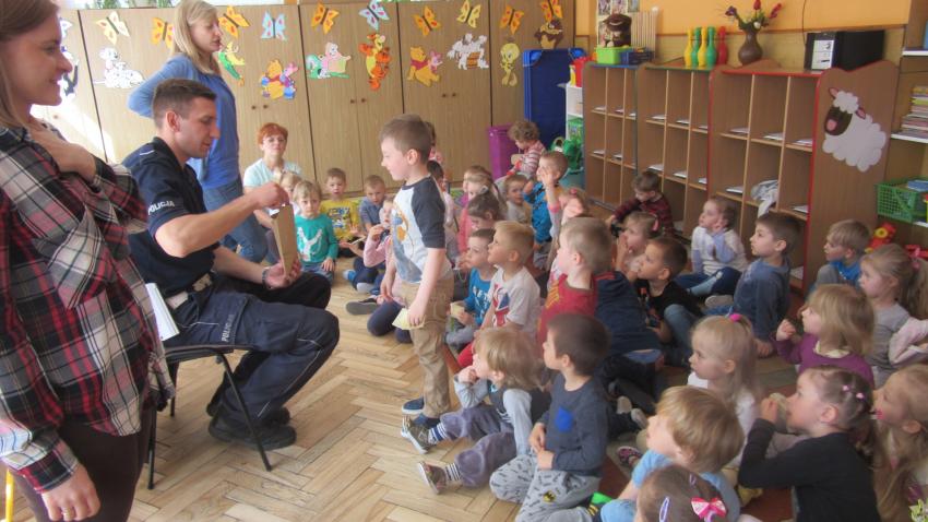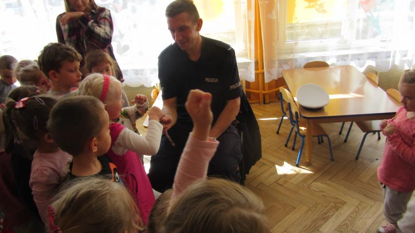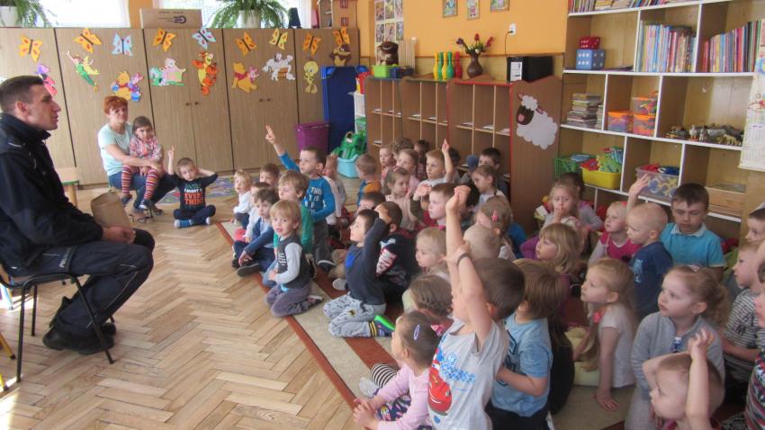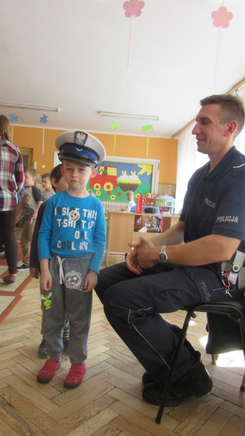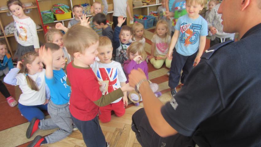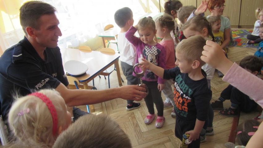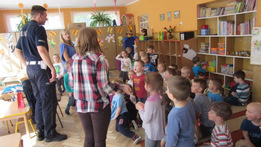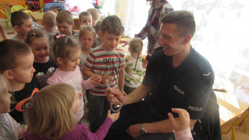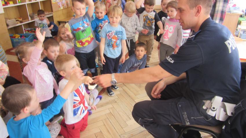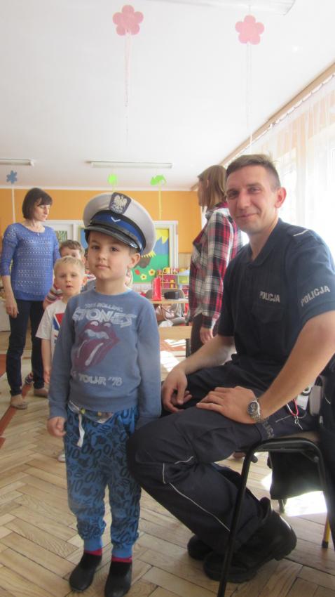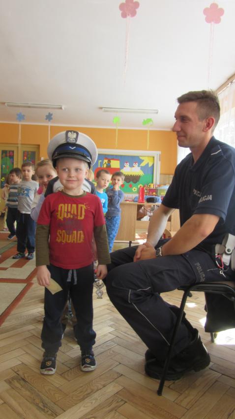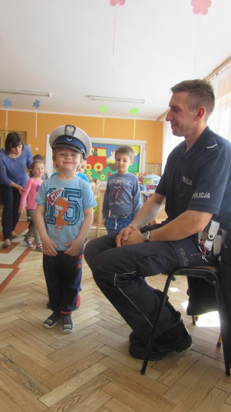 Dzieci z trzech grup „Wesołe Dzwoneczki”, „Zaczarowane Pacynki” i „Roztańczone Nutki” zgromadziły się na zajęciach z Panem Policjantem - Marcinem Połuszejko.  Podczas spotkania przedszkolaki dowiedziały się o tym jak bezpiecznie poruszać się po drogach i podróżować samochodem i rowerem. Nasze przedszkolaki posiadają takie wiadomości i swoją wiedzą chętnie dzieliły się z Panem Policjantem. Nasz gość opowiedział dzieciom o swojej bardzo odpowiedzialnej pracy, o zasadach obowiązujących w ruchu drogowym, a szczególnie o tym, jak należy przewozić dzieci w samochodzie i jakie skutki niesie za sobą jazda bez fotelika. Następnie chętnym przedszkolakom pozwolił przymierzyć akcesoria policyjne, które wzbudziły ogromne zainteresowanie.