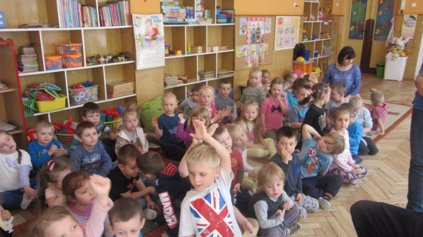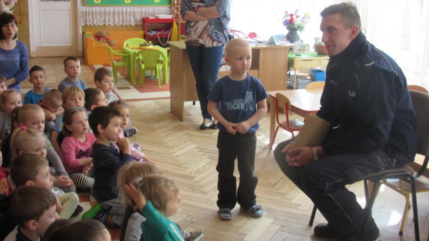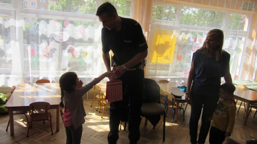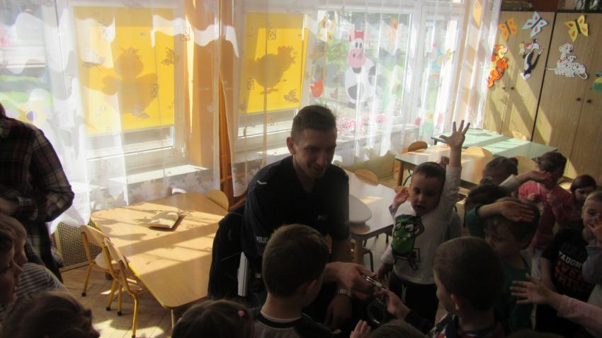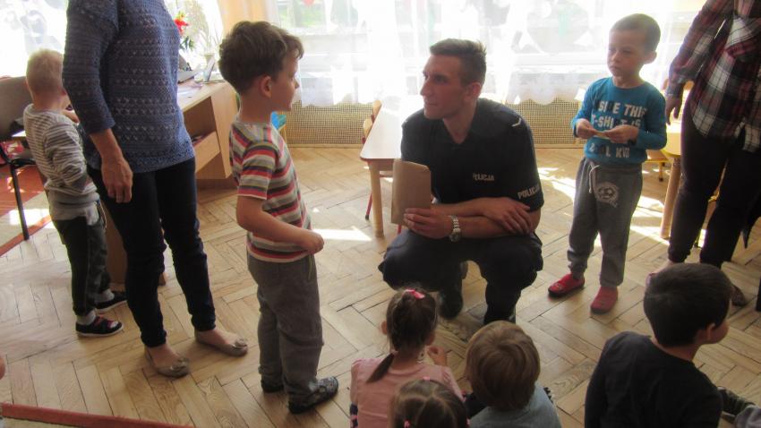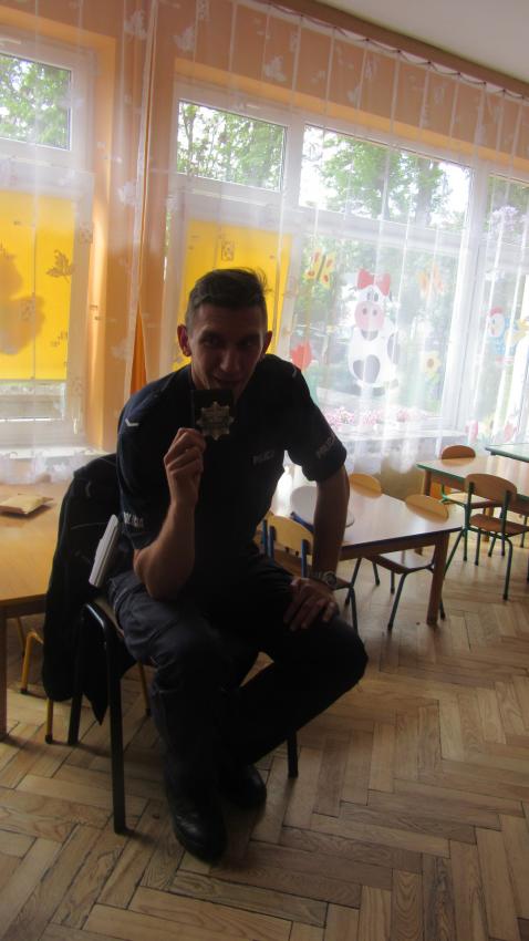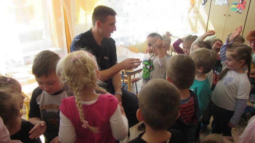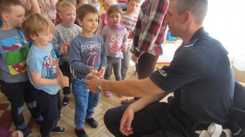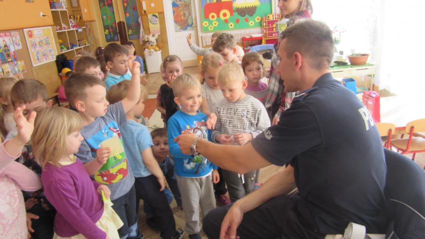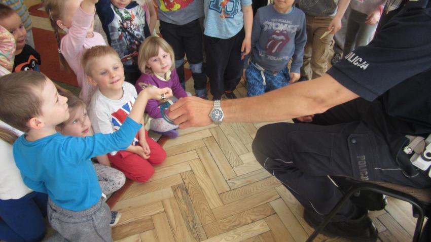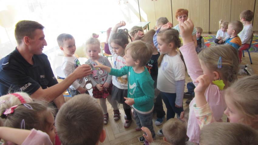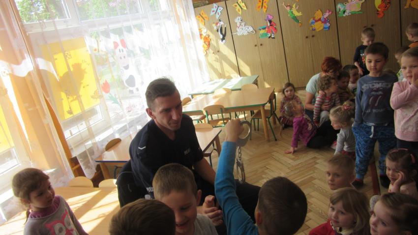 Dzieci z trzech grup „Wesołe Dzwoneczki”, „Zaczarowane Pacynki” i „Roztańczone Nutki” zgromadziły się na zajęciach z Panem Policjantem - Marcinem Połuszejko.  Podczas spotkania przedszkolaki dowiedziały się o tym jak bezpiecznie poruszać się po drogach i podróżować samochodem i rowerem. Nasze przedszkolaki posiadają takie wiadomości i swoją wiedzą chętnie dzieliły się z Panem Policjantem. Nasz gość opowiedział dzieciom o swojej bardzo odpowiedzialnej pracy, o zasadach obowiązujących w ruchu drogowym, a szczególnie o tym, jak należy przewozić dzieci w samochodzie i jakie skutki niesie za sobą jazda bez fotelika. Następnie chętnym przedszkolakom pozwolił przymierzyć akcesoria policyjne, które wzbudziły ogromne zainteresowanie.