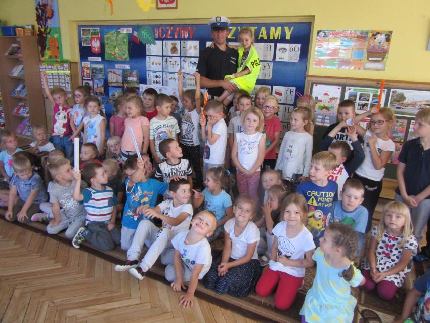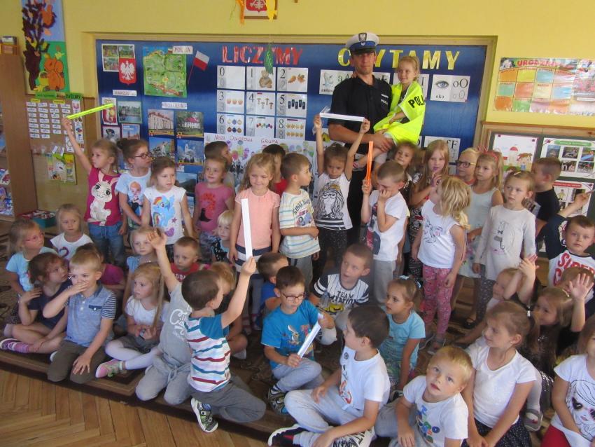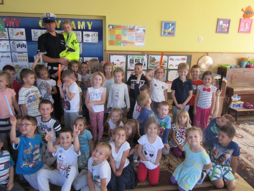 Starszym przedszkolakom złożył wizytę pan policjant. Utrwalił z dziećmi omawiane od kilku dni zasady bezpieczeństwa, które trzeba zachować w drodze do przedszkola. Dzieci z chęcią odpowiadały na pytania, a w nagrodę otrzymały odblaskowe bransoletki. Wszyscy ochoczo przymierzyli również czapkę i policyjną kamizelkę.