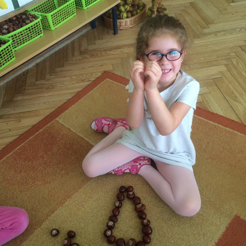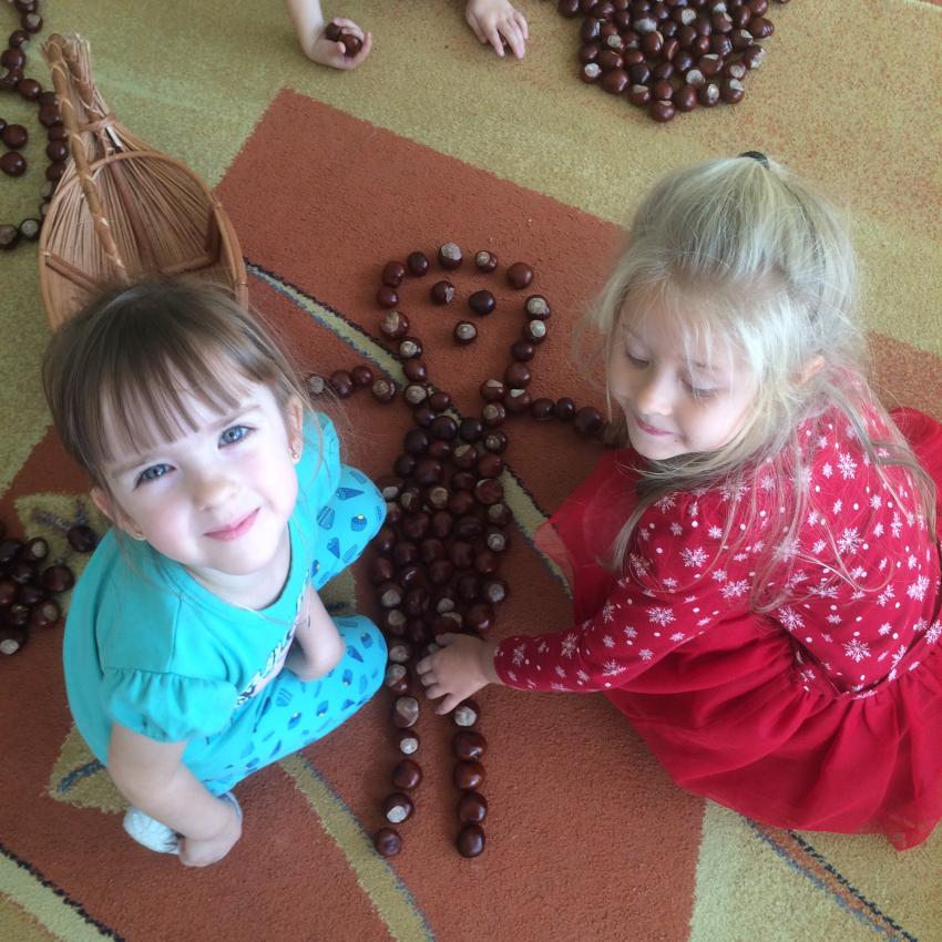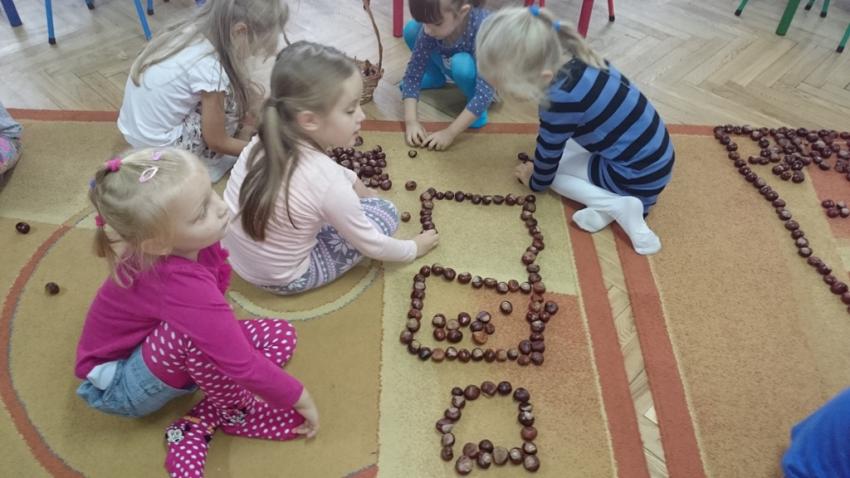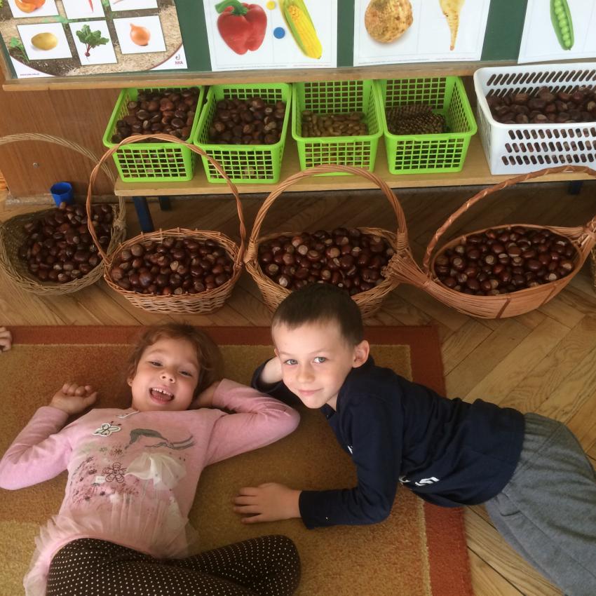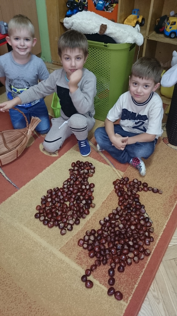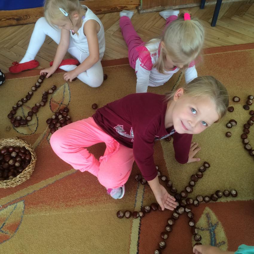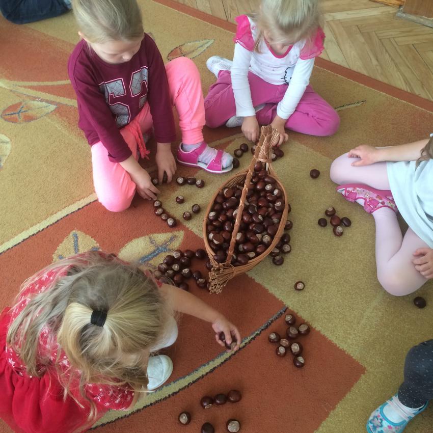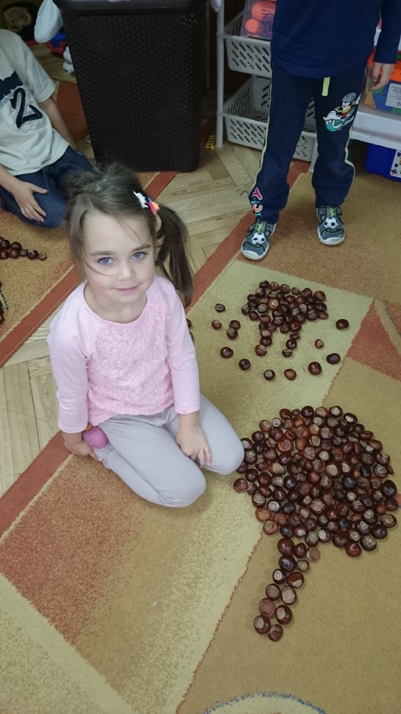 Jesień to znakomita pora na kasztanowe zabawy. W ubiegły wtorek „Kolorowe akwarelki” zebrały na placu przedszkolnym mnóstwo kasztanów. Na początku postanowiliśmy urządzić zawody kasztanów, gdzie dzieci turlając po podłodze musiały doprowadzić je jak najbliżej mety. Mimo, że konkurencja nie była łatwa sprawiła ogromną radość. Następnie przyszedł czas na układanie kasztanowych wzorków. Nasze akwarelki wykazały się ogromną pomysłowością.