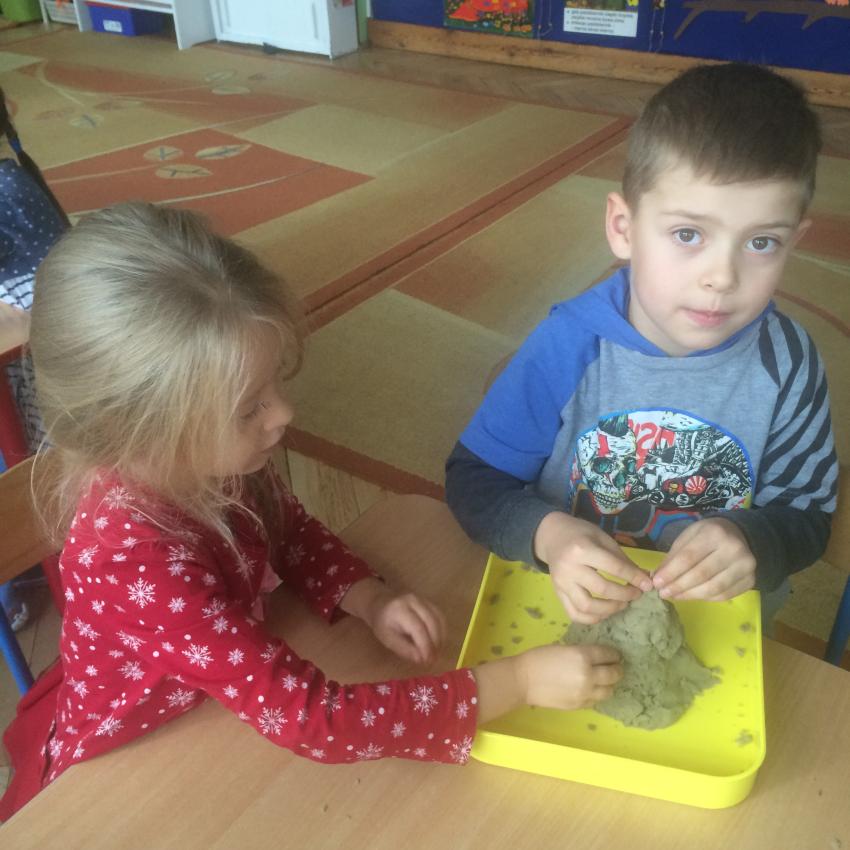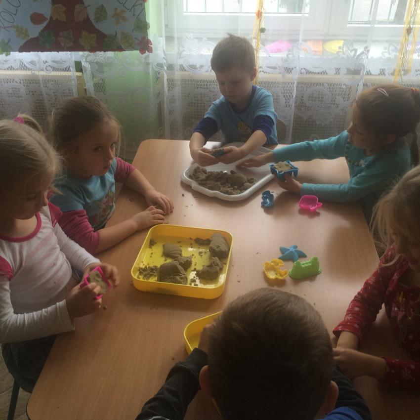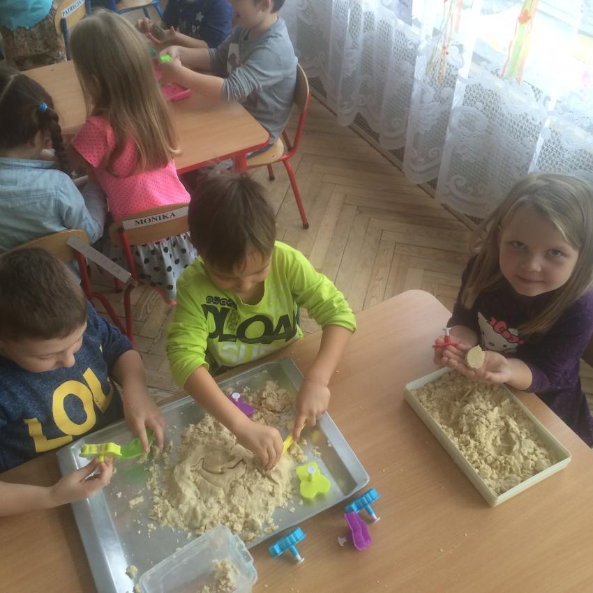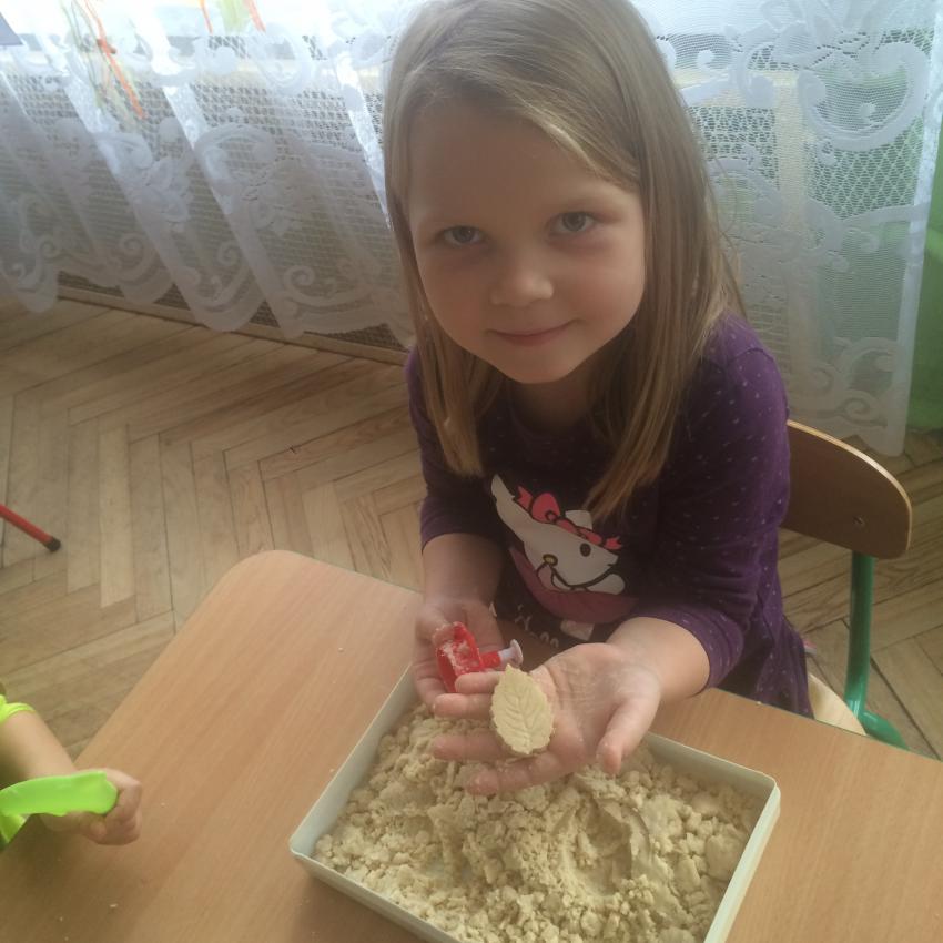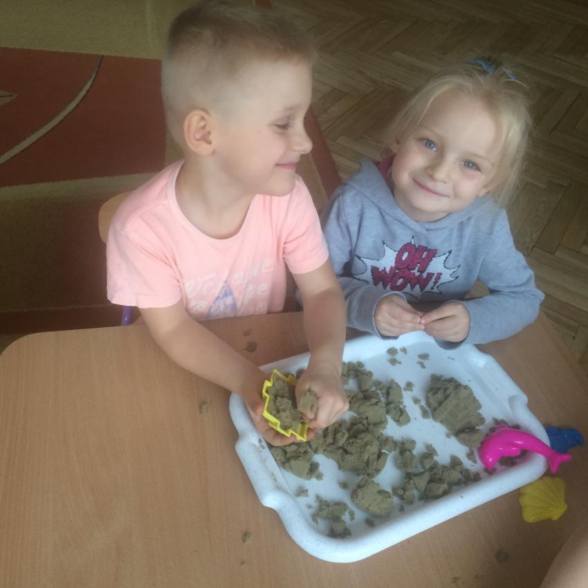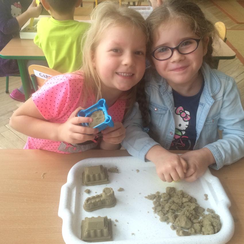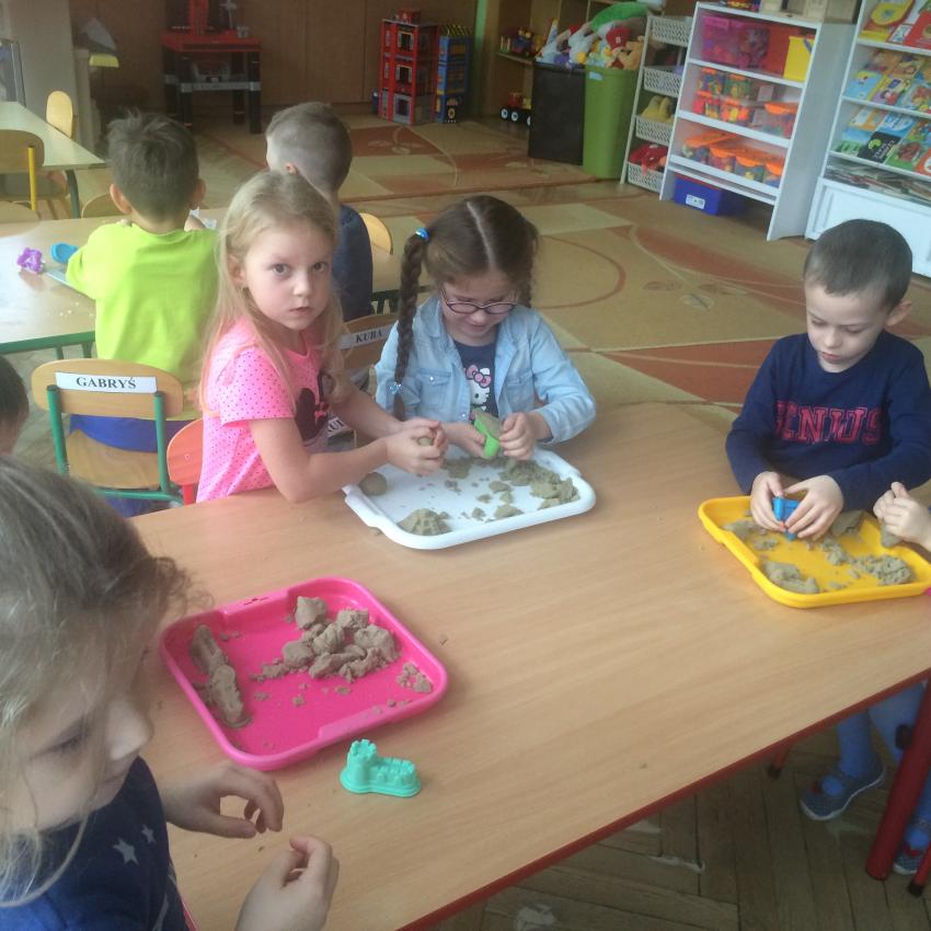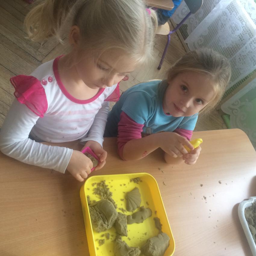 Mamy piasek w naszej sali !!! Nie jakiś zwykły, z piaskownicy, ale taki specjalny z którego można tworzyć różne budowle, można wycinać foremkami, jak ciasteczka. Nie rozsypuje się, nie brudzi rąk i w dodatku jest mięciutki w dotyku. Dzieci bardzo lubią się nim bawić. To piasek kinetyczny, który dostarcza „Akwarelkom” wiele frajdy, bowiem przesypywanie  i formowanie piasku działa relaksująco, wzmacnia nasze ręce i pobudza naszą wyobraźnię.