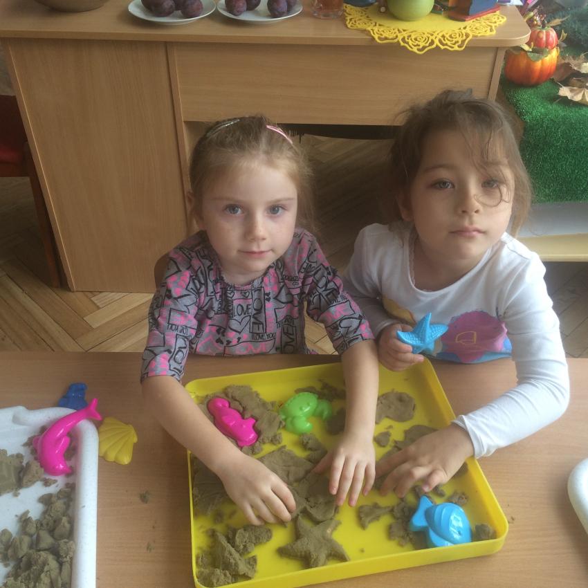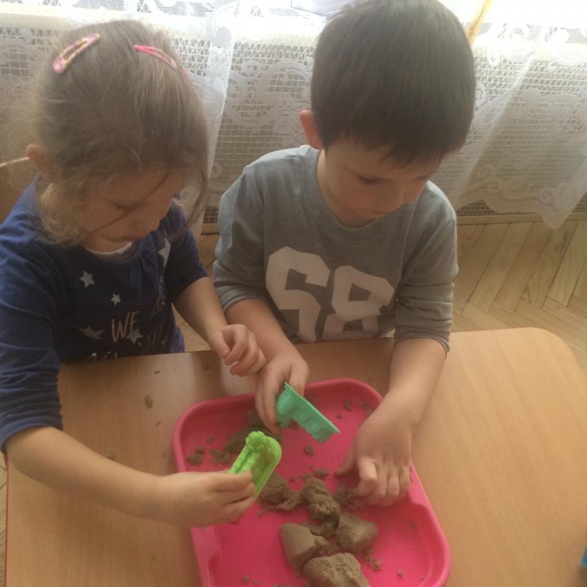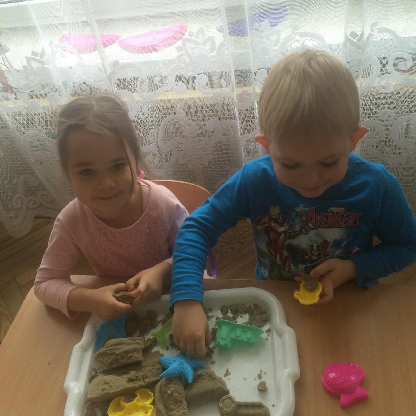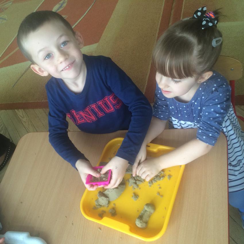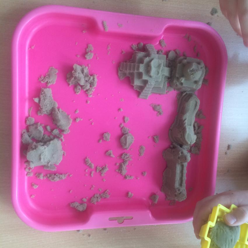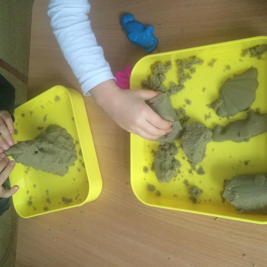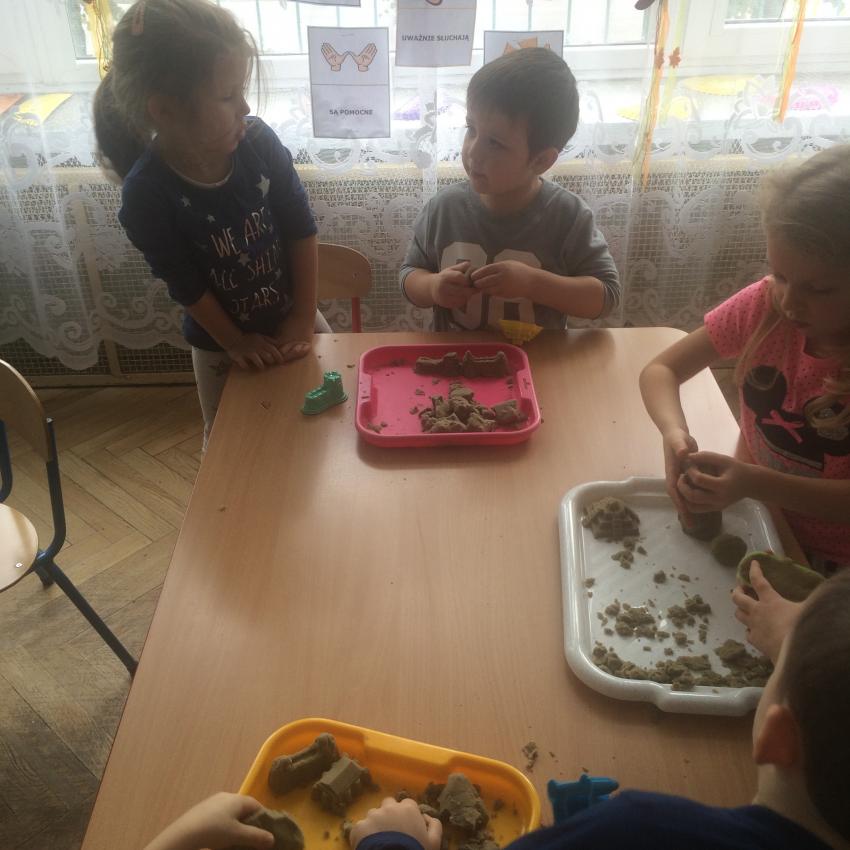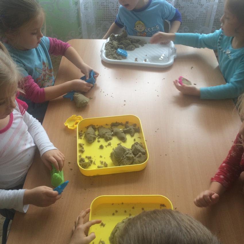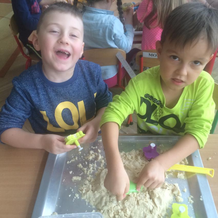 Mamy piasek w naszej sali !!! Nie jakiś zwykły, z piaskownicy, ale taki specjalny z którego można tworzyć różne budowle, można wycinać foremkami, jak ciasteczka. Nie rozsypuje się, nie brudzi rąk i w dodatku jest mięciutki w dotyku. Dzieci bardzo lubią się nim bawić. To piasek kinetyczny, który dostarcza „Akwarelkom” wiele frajdy, bowiem przesypywanie  i formowanie piasku działa relaksująco, wzmacnia nasze ręce i pobudza naszą wyobraźnię.