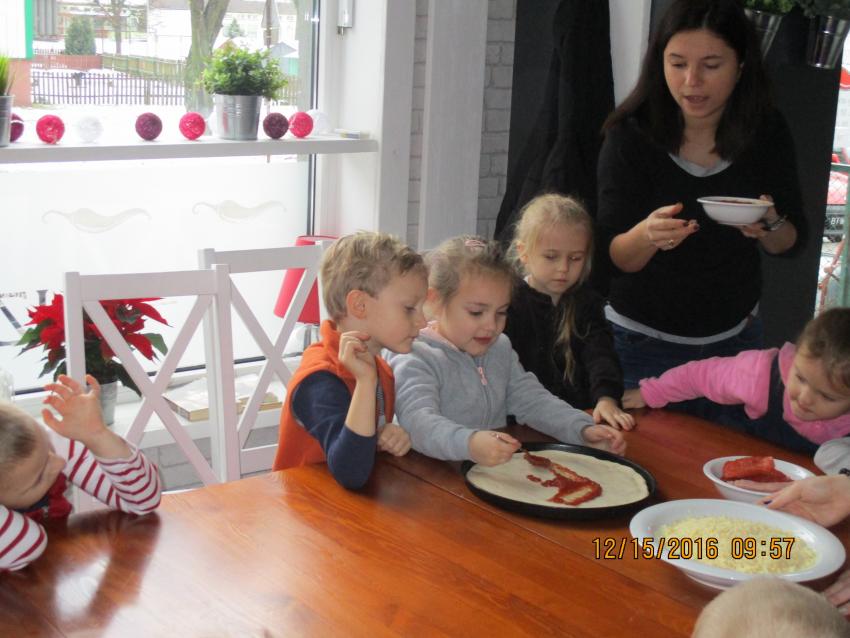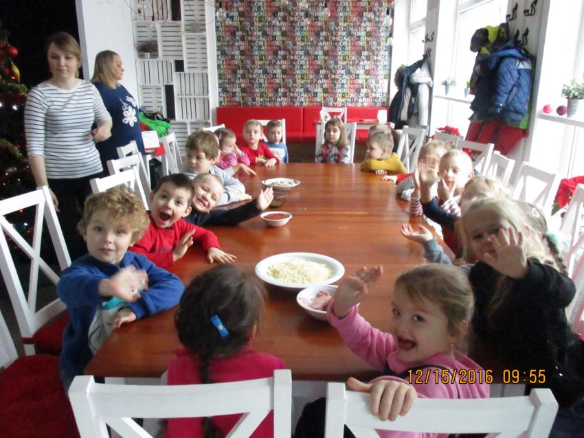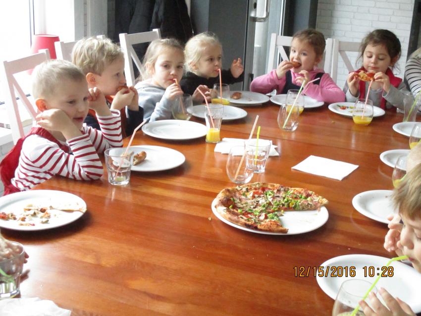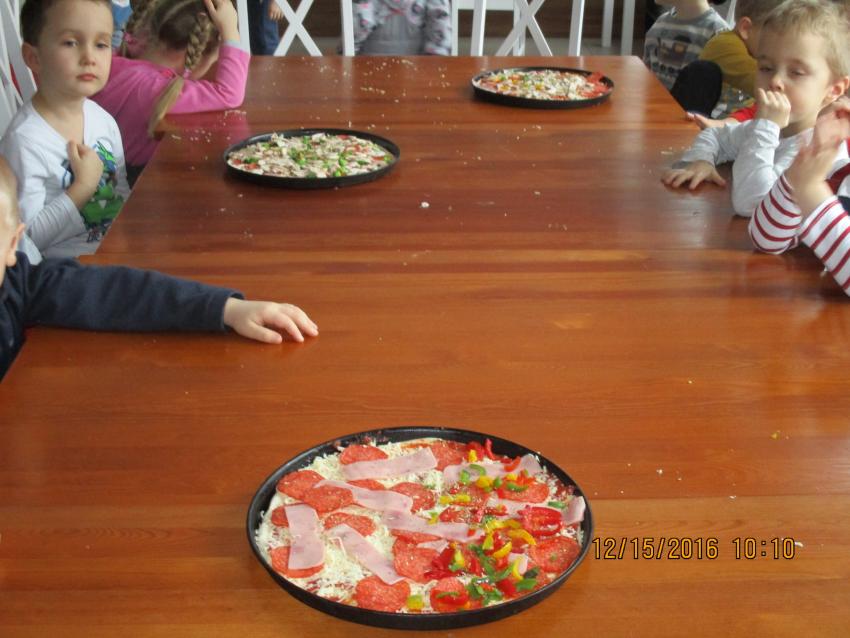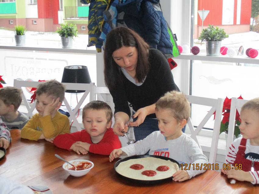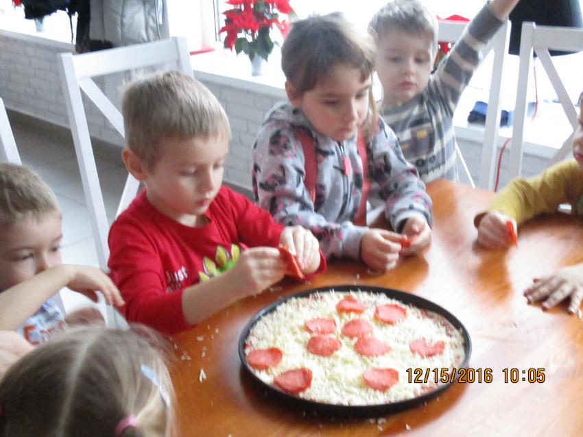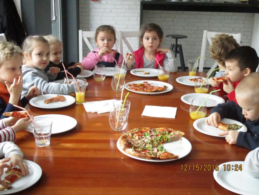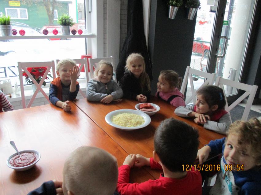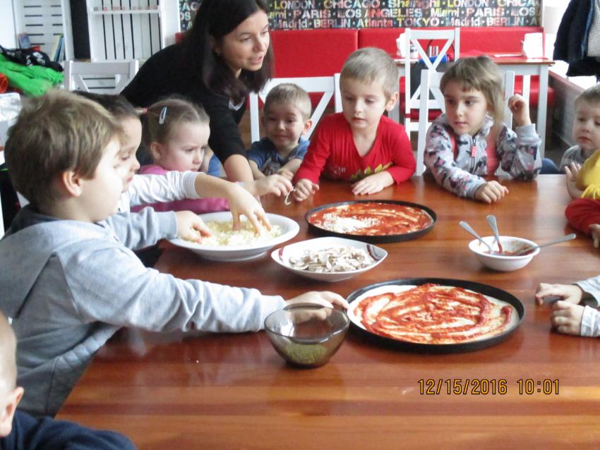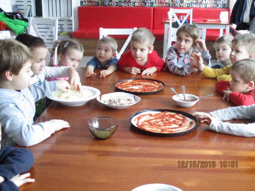Dnia 15.12.2016r. dzieci z grupy Zaczarowane Pacynki wybrały się na wycieczkę do Pizzerii Peperoni. Przedszkolaki zapoznały się z pracą w pizzerii oraz zobaczyły, jak robi się prawdziwą pizzę. Po krótkim instruktażu dzieci zabrały się do przygotowania własnej pizzy.Wszystkie wypieki wyszły doskonałe. Przedszkolaki dziękują właścicielom Pizzerii Peperoni za gościnność i miłą atmosferę.