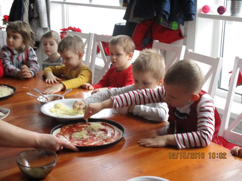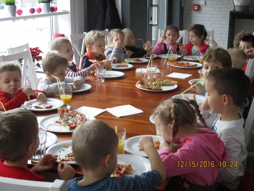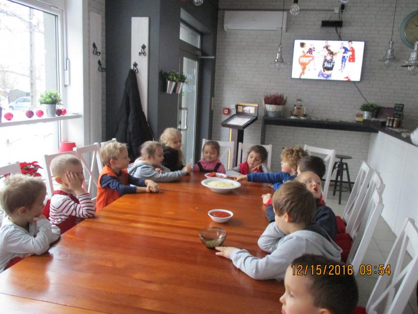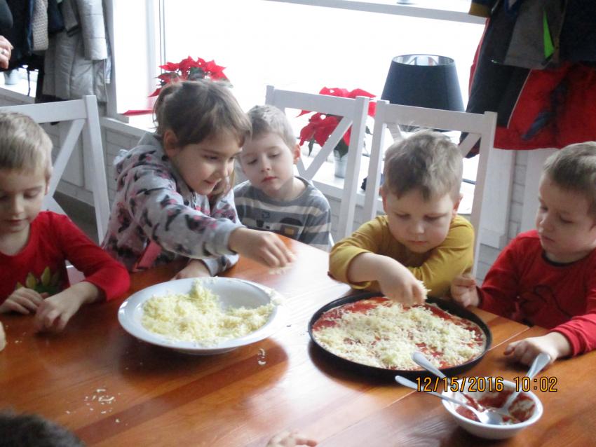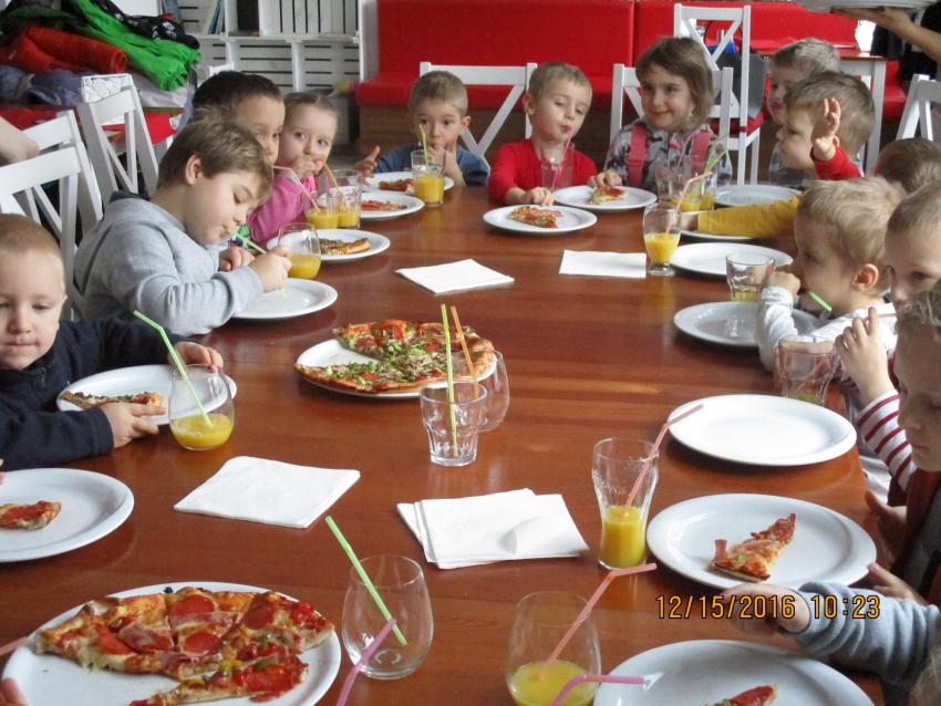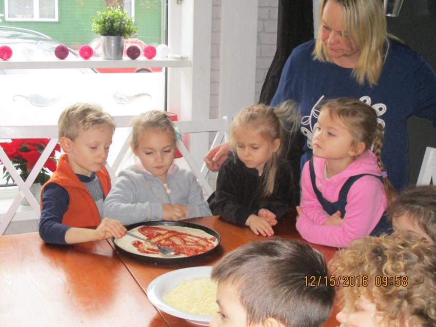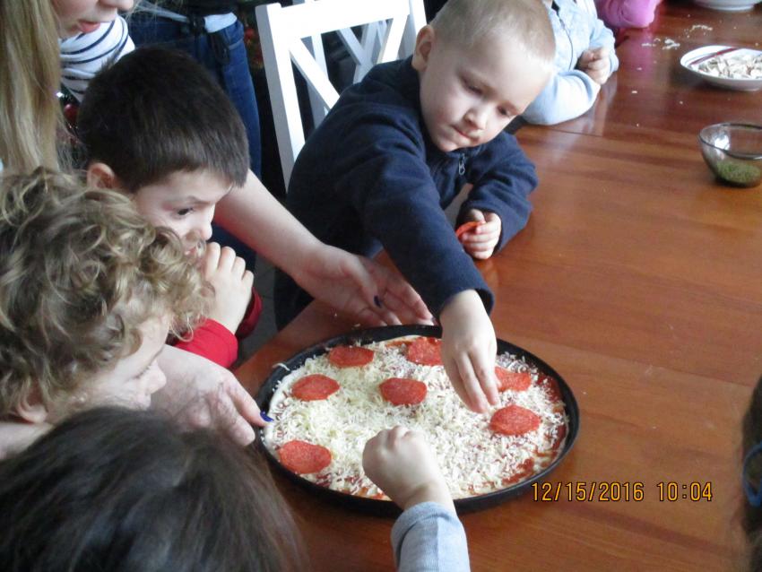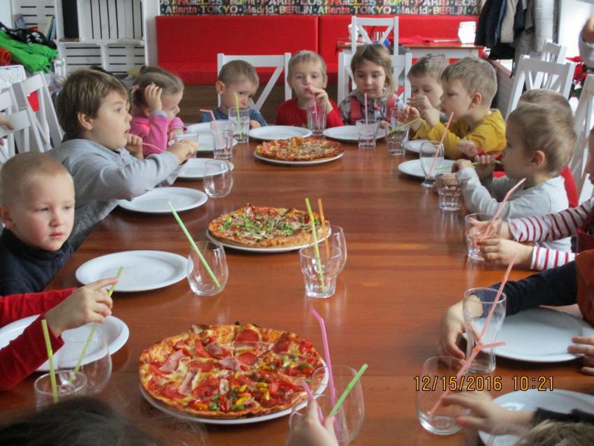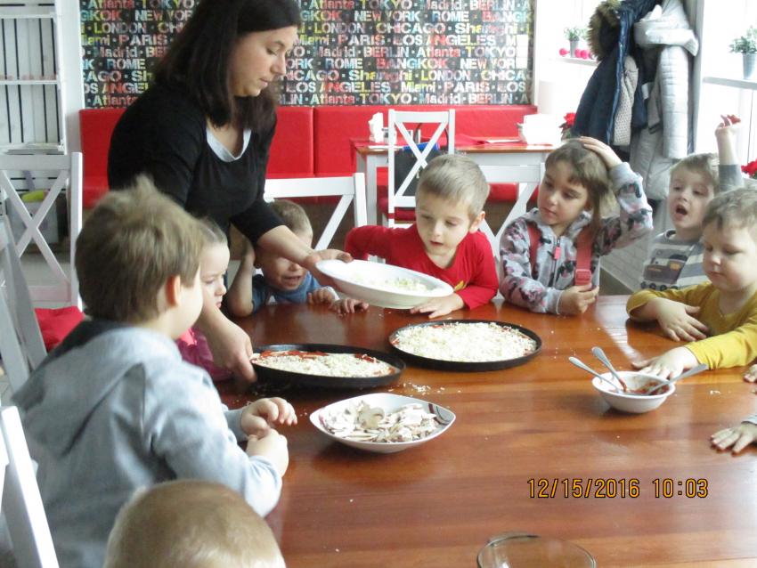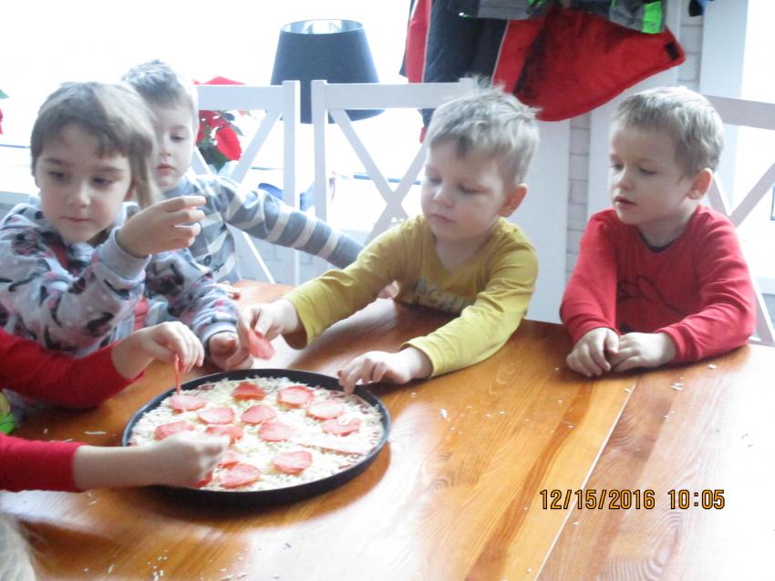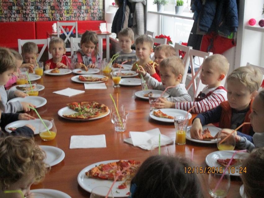 Dnia 15.12.2016r. dzieci z grupy Zaczarowane Pacynki wybrały się na wycieczkę do Pizzerii Peperoni. Przedszkolaki zapoznały się z pracą w pizzerii oraz zobaczyły, jak robi się prawdziwą pizzę. Po krótkim instruktażu dzieci zabrały się do przygotowania własnej pizzy.Wszystkie wypieki wyszły doskonałe. Przedszkolaki dziękują właścicielom Pizzerii Peperoni za gościnność i miłą atmosferę.