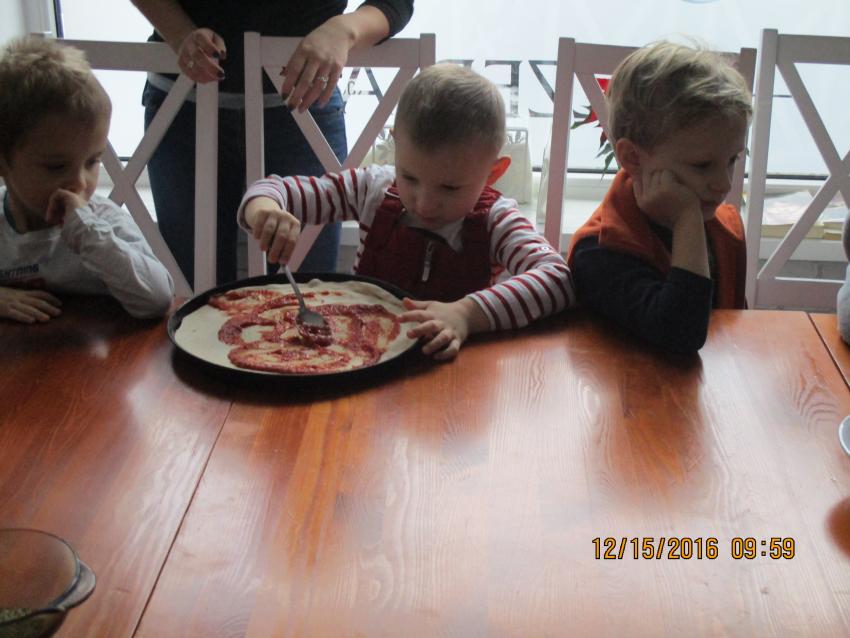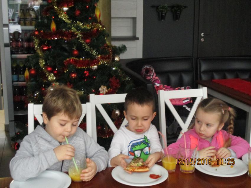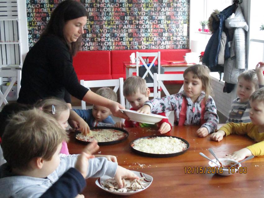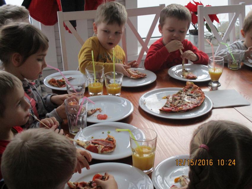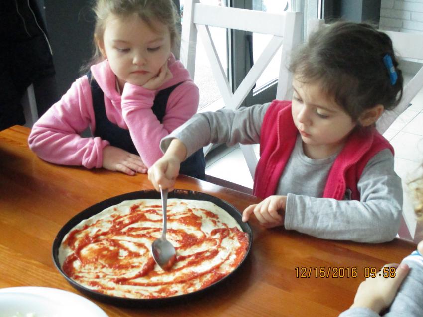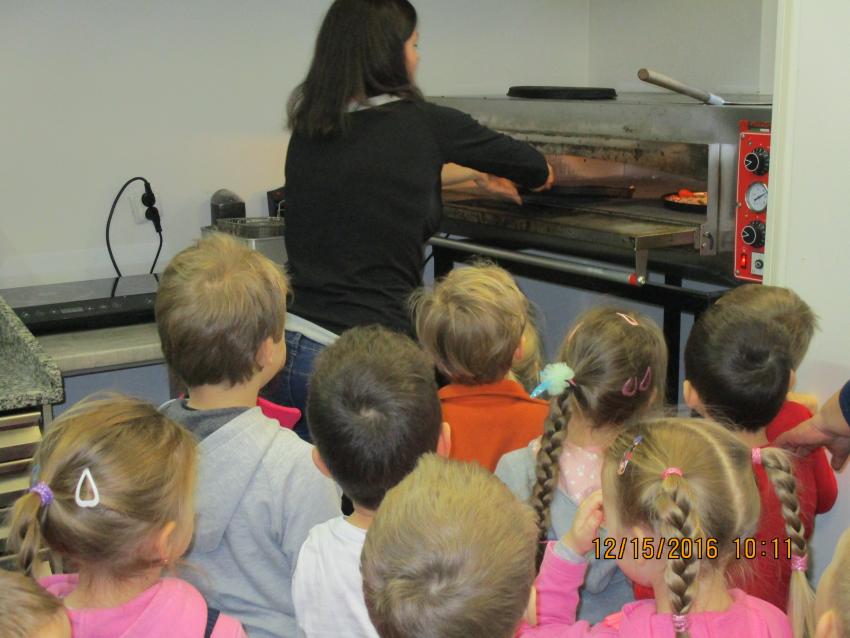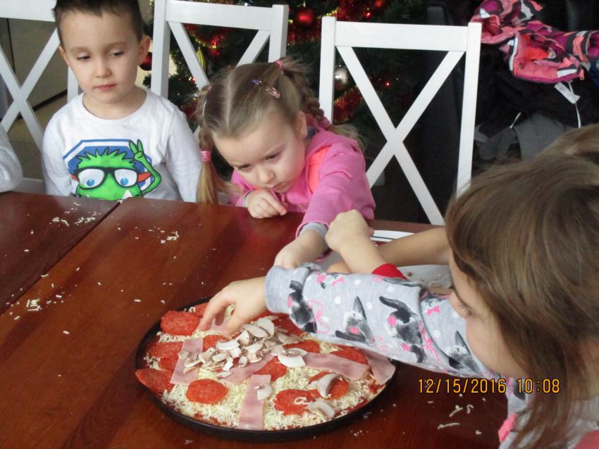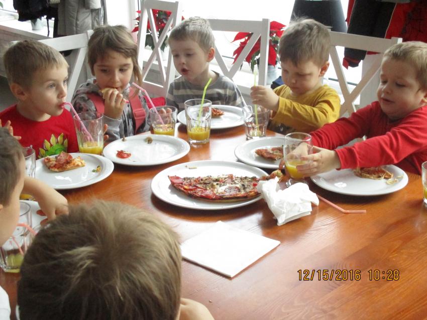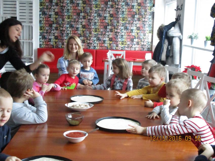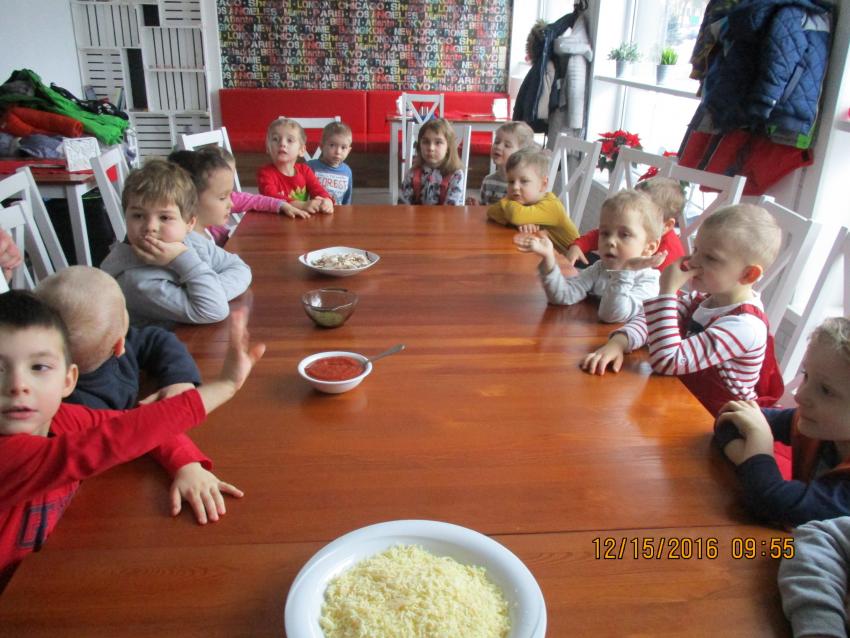 Dnia 15.12.2016r. dzieci z grupy Zaczarowane Pacynki wybrały się na wycieczkę do Pizzerii Peperoni. Przedszkolaki zapoznały się z pracą w pizzerii oraz zobaczyły, jak robi się prawdziwą pizzę. Po krótkim instruktażu dzieci zabrały się do przygotowania własnej pizzy.Wszystkie wypieki wyszły doskonałe. Przedszkolaki dziękują właścicielom Pizzerii Peperoni za gościnność i miłą atmosferę.