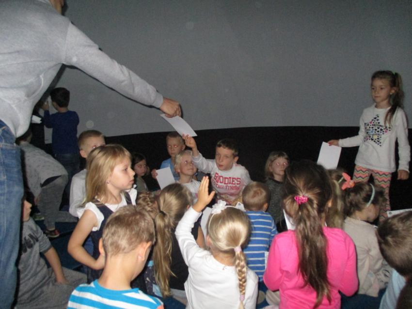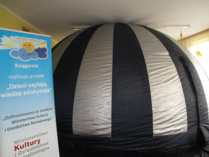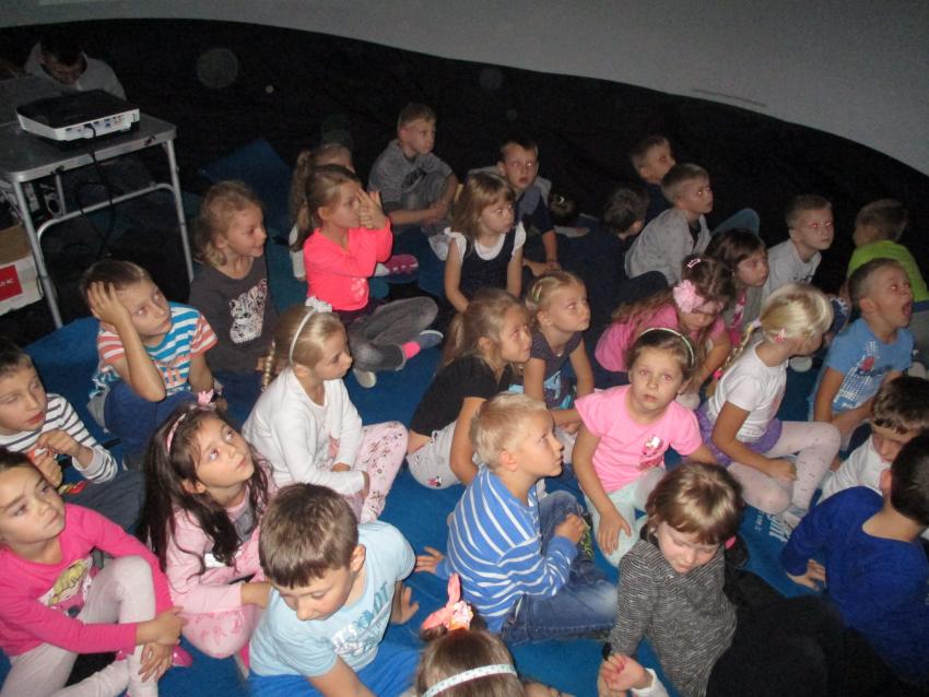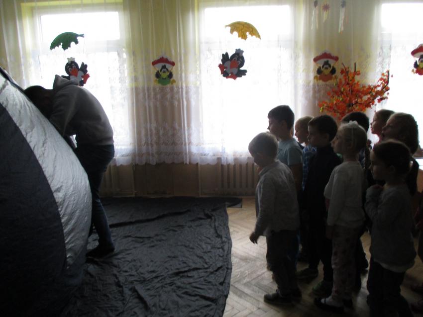W dniu 25.09.2017 w Przedszkolu Nr 1 dzieci z grup „Kolorowe akwarelki” i „Tęczowe kredki” miały okazję skorzystać z niesamowitej atrakcji. Do placówki przyjechało KINO SFERYCZNE, które jest postrzegane jako nowa forma kształcenia. Za pomocą systemu sferycznej projekcji w środku kopuły tworzy się niesamowity, panoramiczny obraz. Zaciekawione przedszkolaki weszły do środka ogromnej, rozstawionej w sali półkuli i z ogromnym zainteresowaniem obejrzały pokazy filmów edukacyjnych.