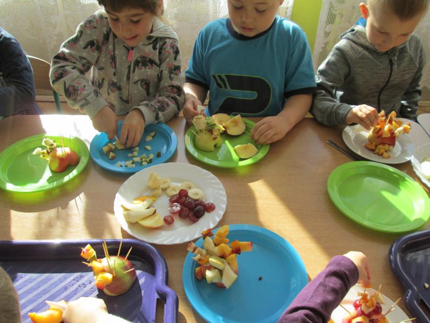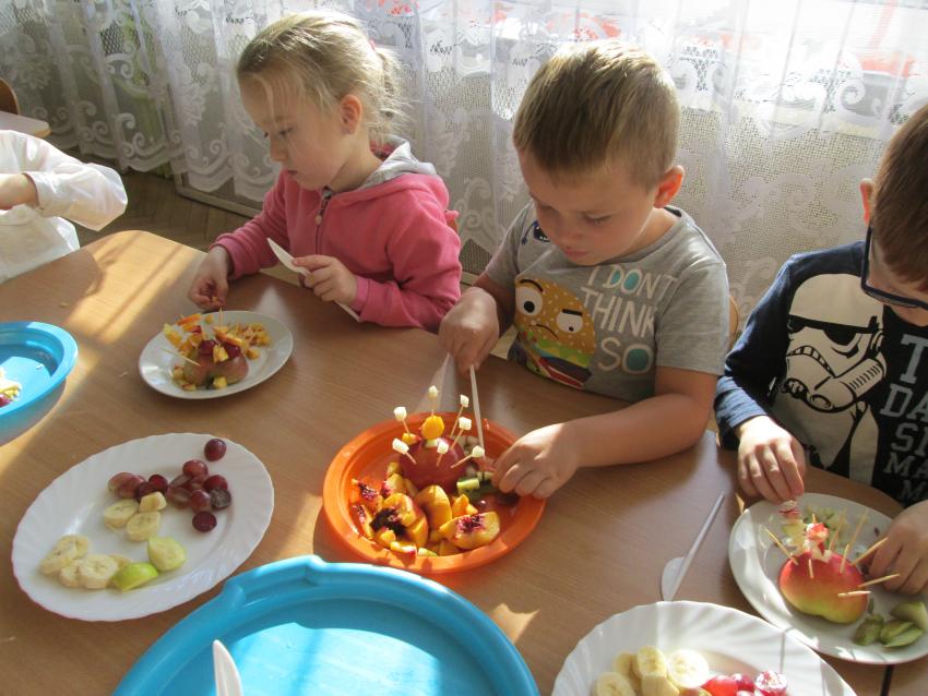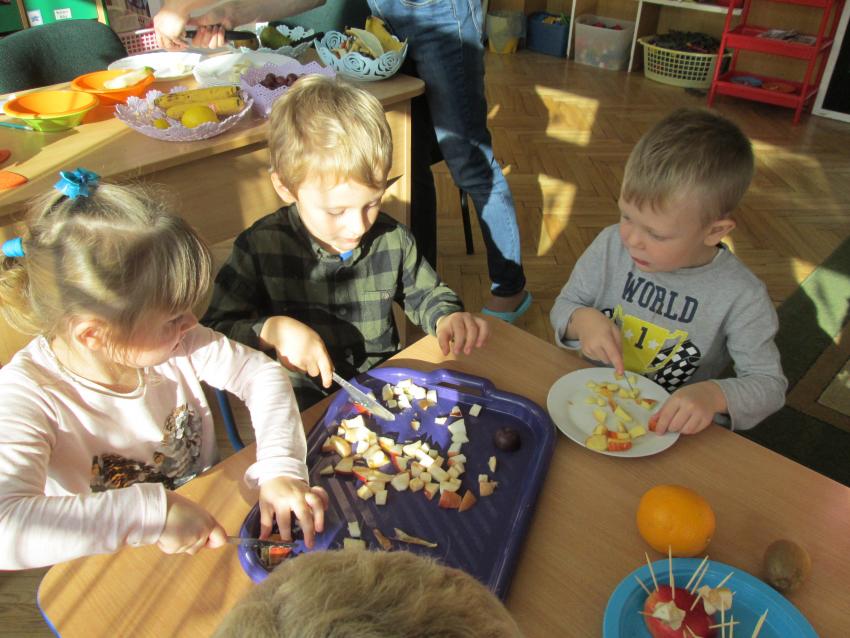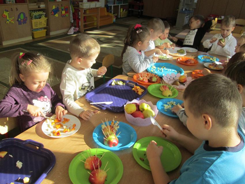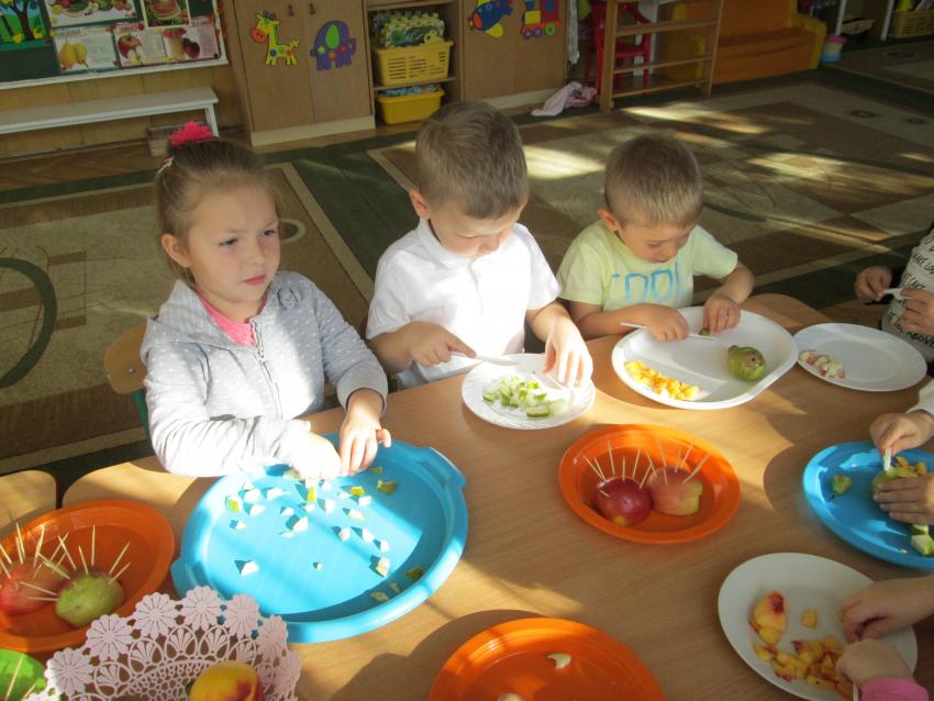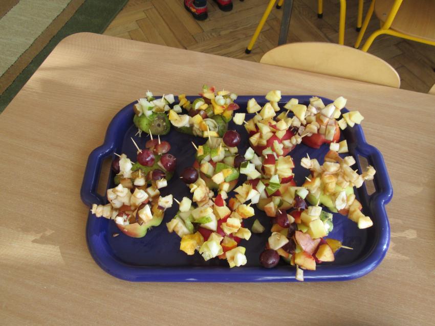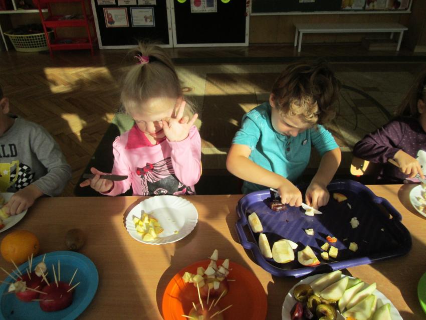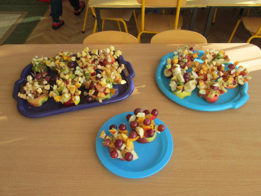 W związku z realizowaną w grupie III „Roztańczone nutki” tematyką „Jesień w sadzie”, w ramach podsumowania zdobytych wiadomości, dzieci z przyniesionych wcześniej owoców wykonały „Owocowe jeżyki”, które były doskonałą dodatkową, jesienną dawką witamin.