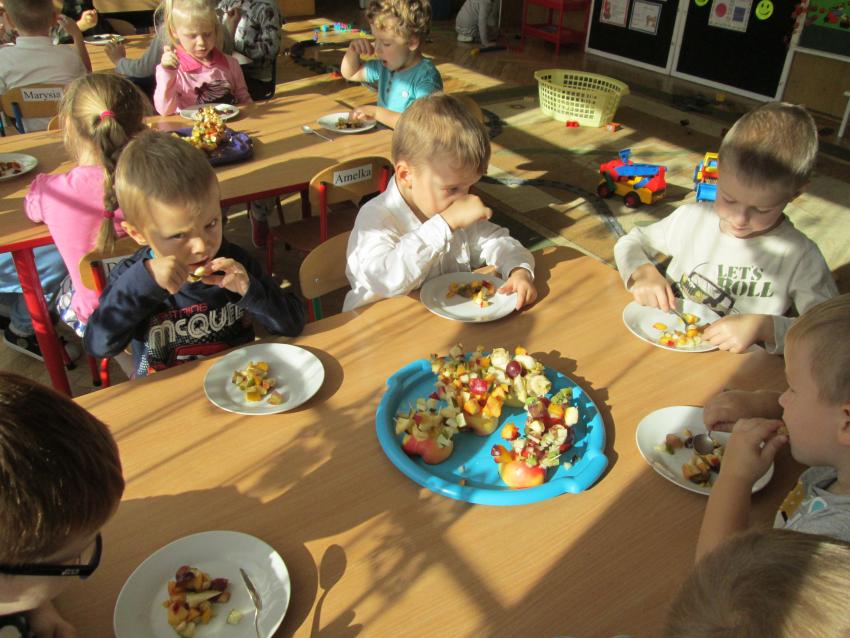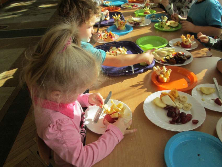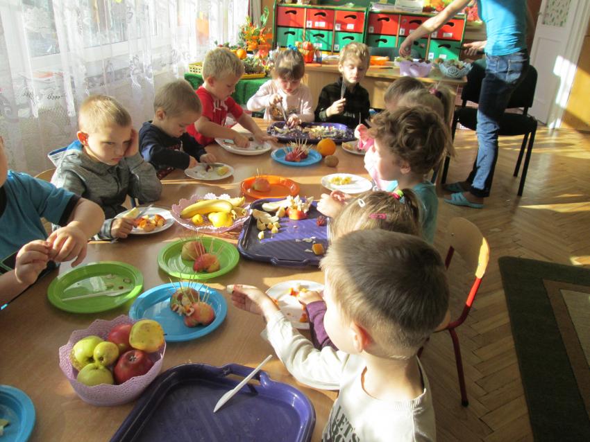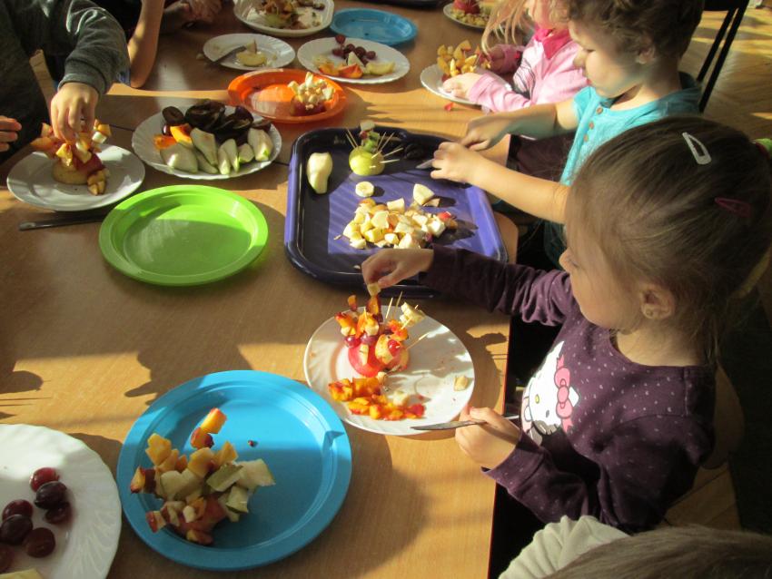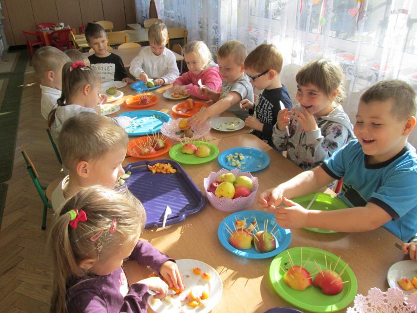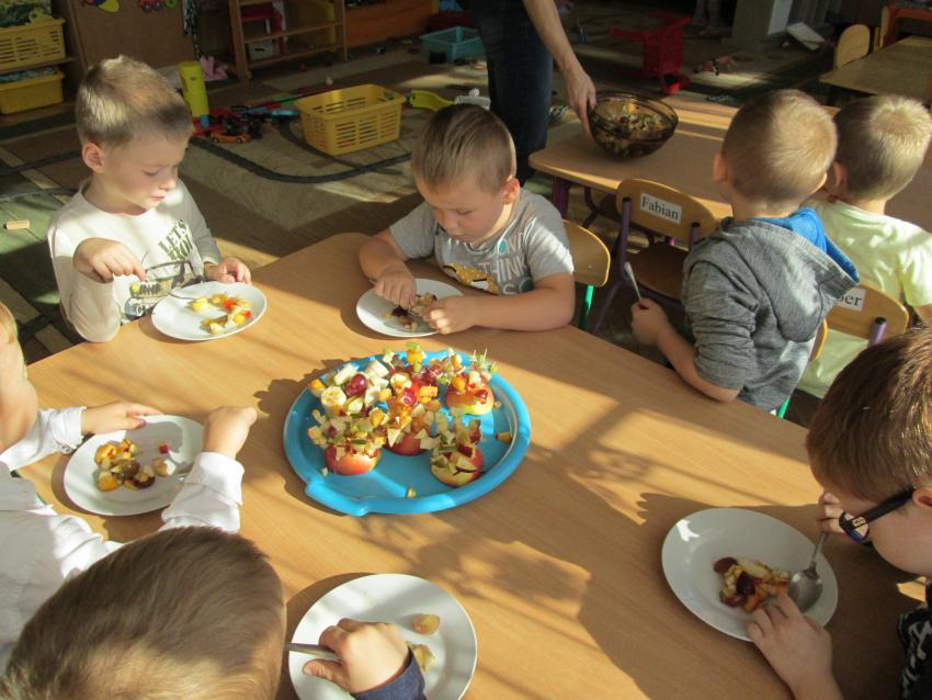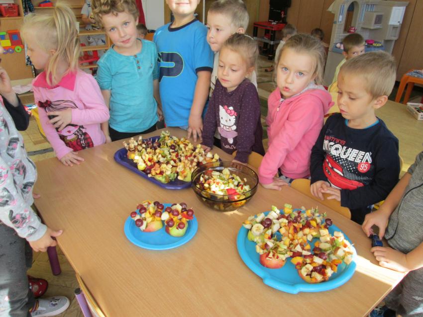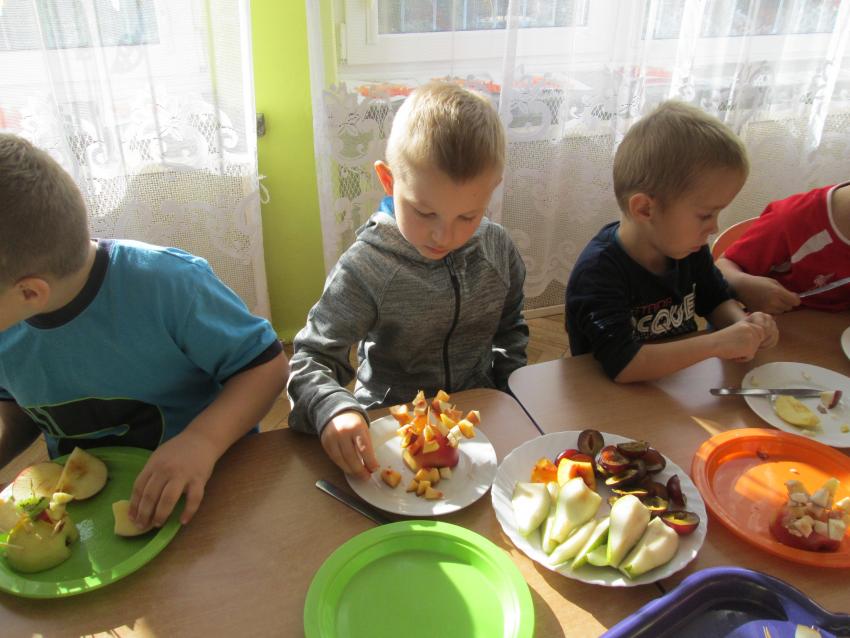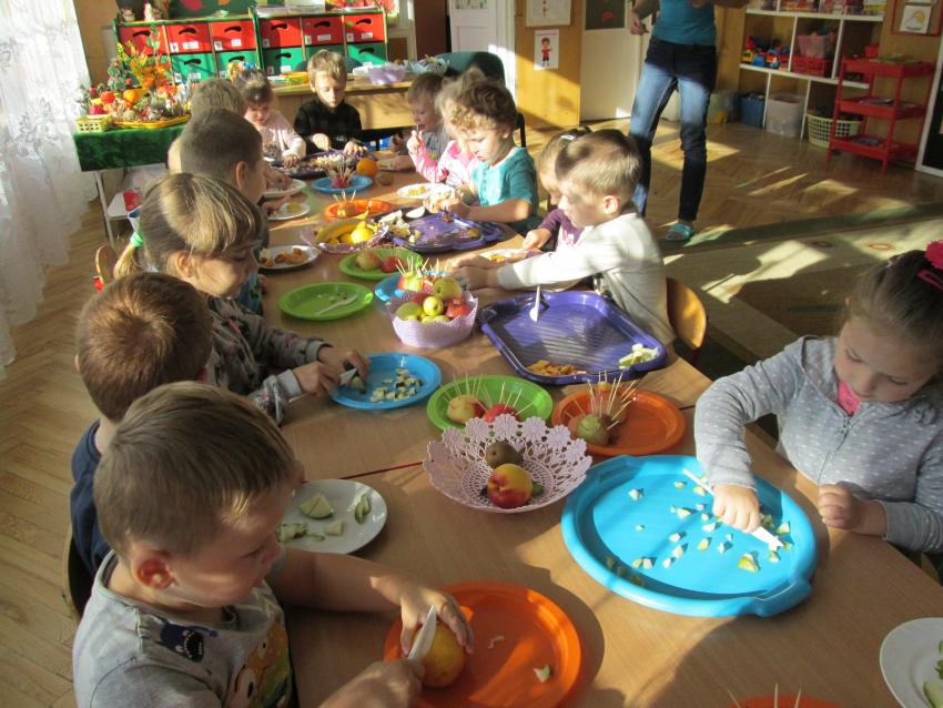 W związku z realizowaną w grupie III „Roztańczone nutki” tematyką „Jesień w sadzie”, w ramach podsumowania zdobytych wiadomości, dzieci z przyniesionych wcześniej owoców wykonały „Owocowe jeżyki”, które były doskonałą dodatkową, jesienną dawką witamin.