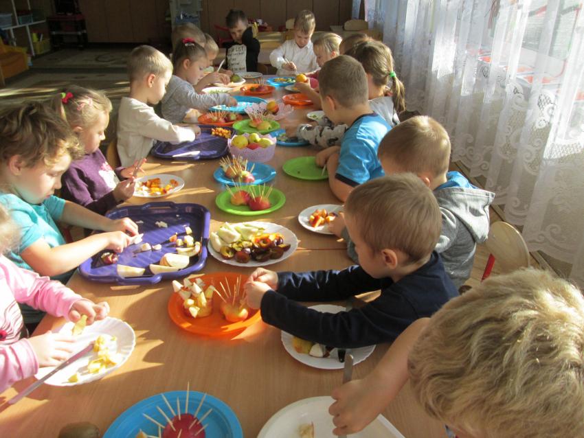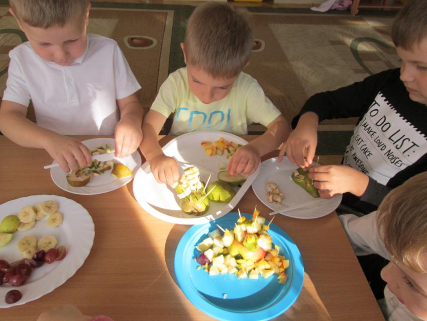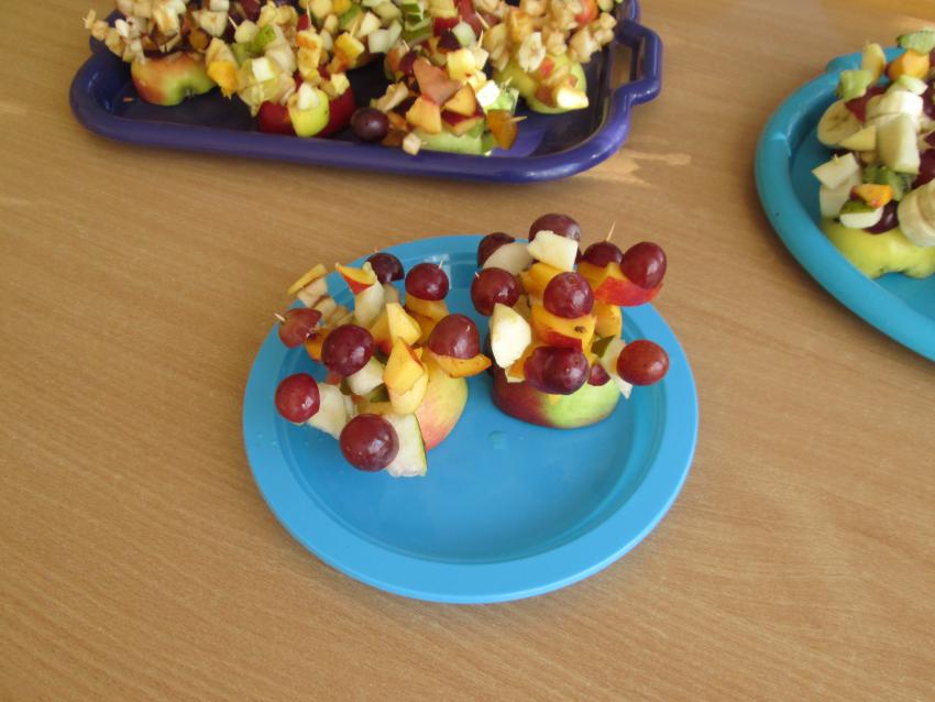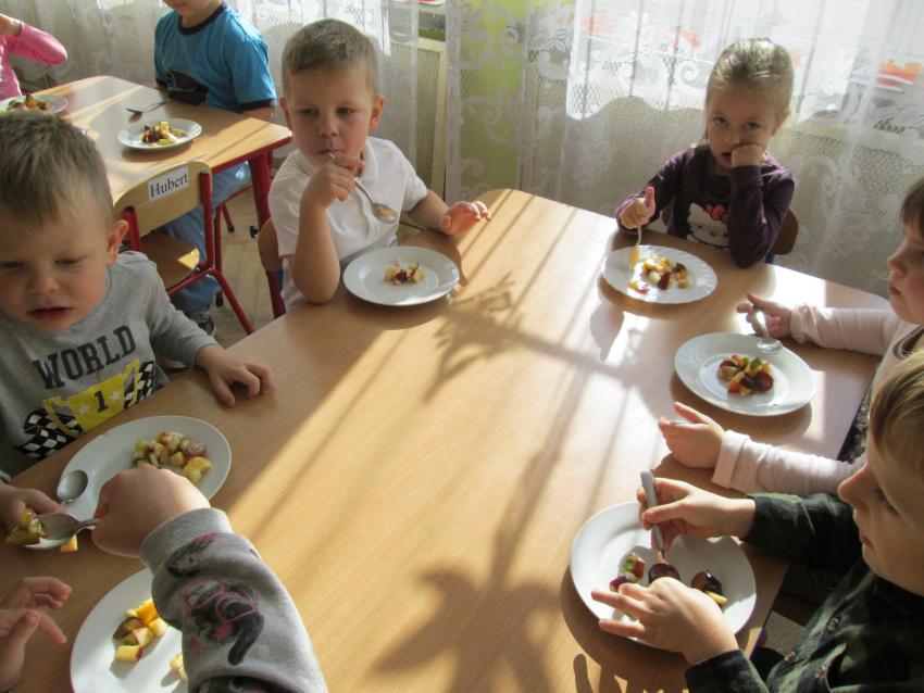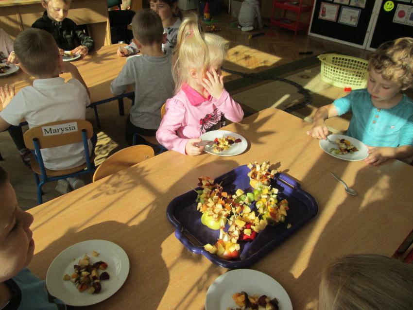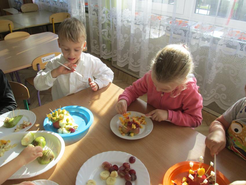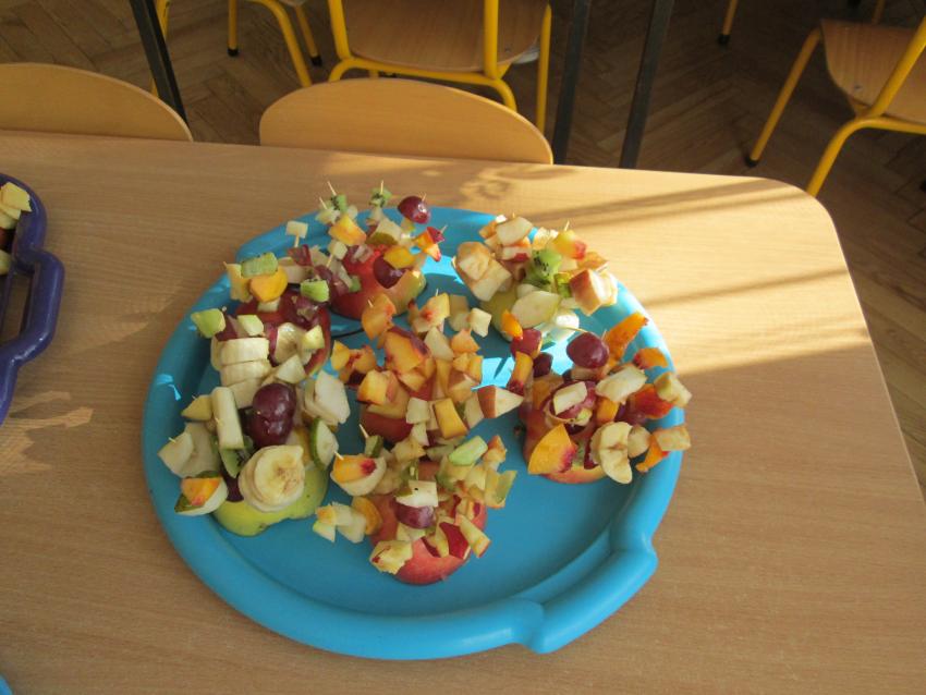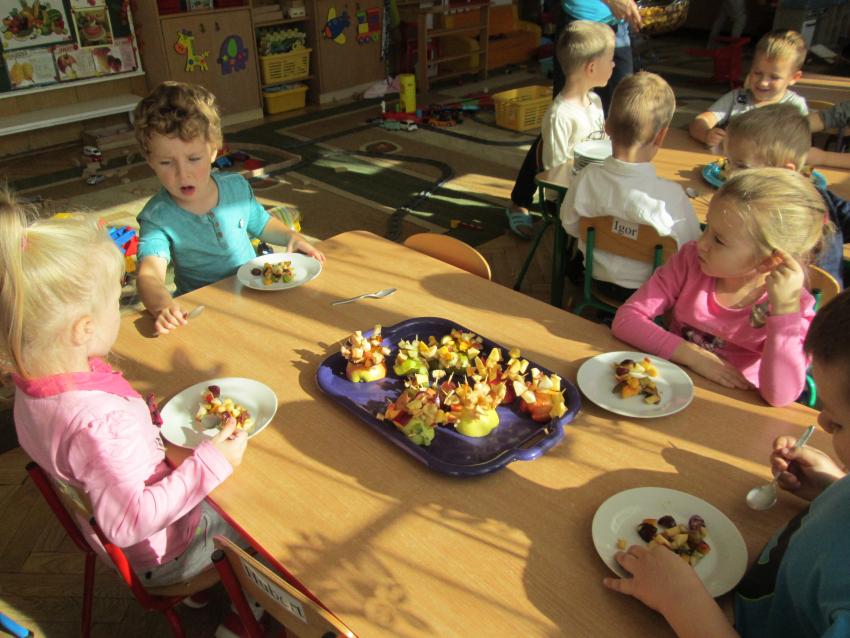 W związku z realizowaną w grupie III „Roztańczone nutki” tematyką „Jesień w sadzie”, w ramach podsumowania zdobytych wiadomości, dzieci z przyniesionych wcześniej owoców wykonały „Owocowe jeżyki”, które były doskonałą dodatkową, jesienną dawką witamin.