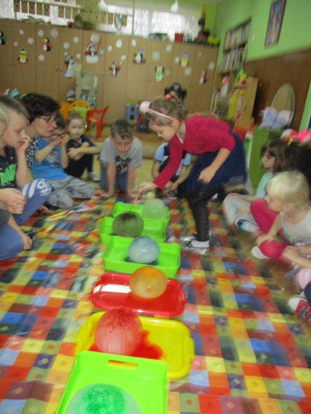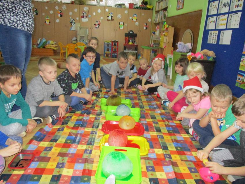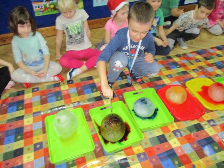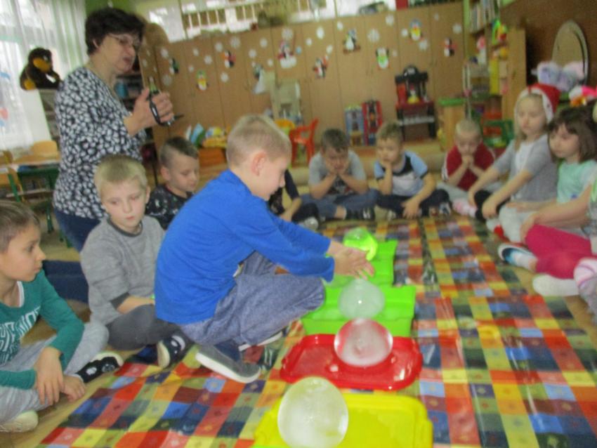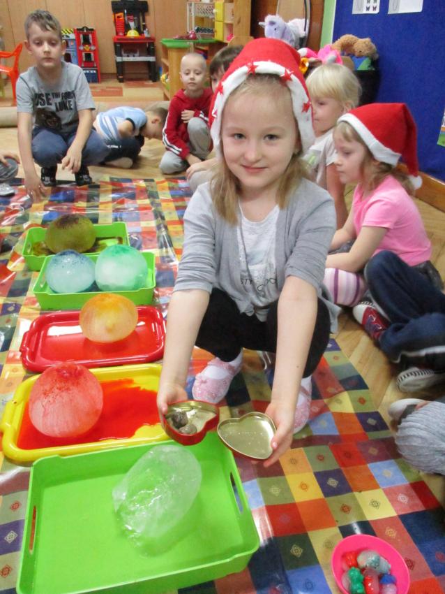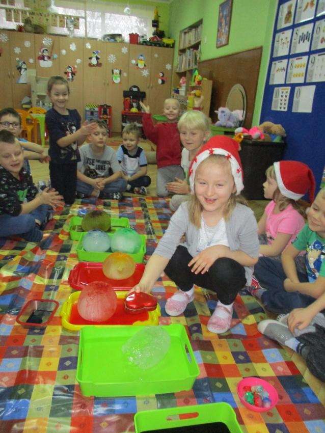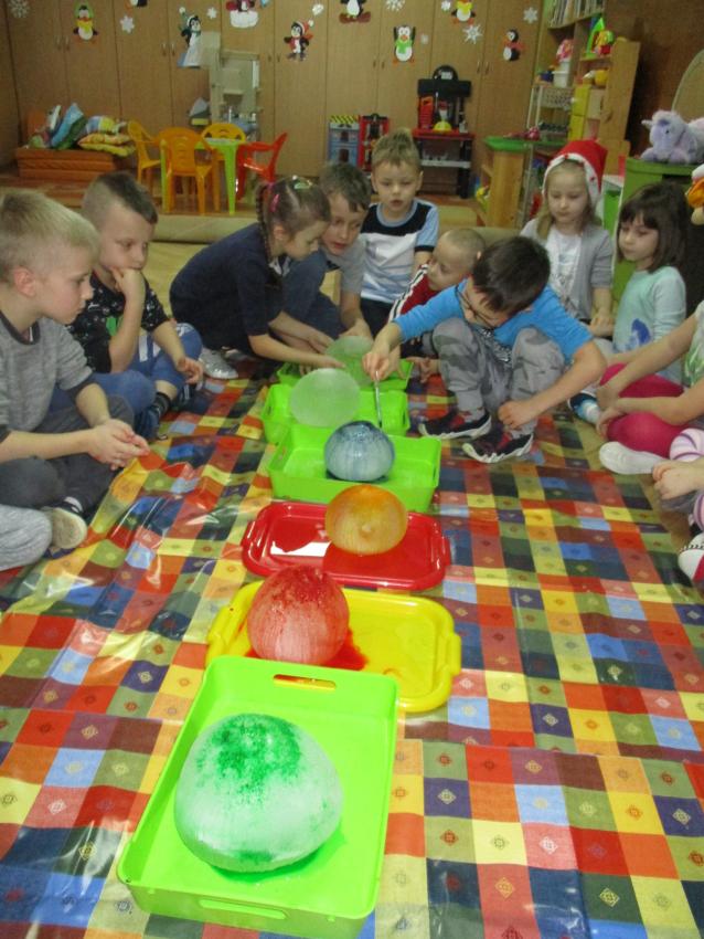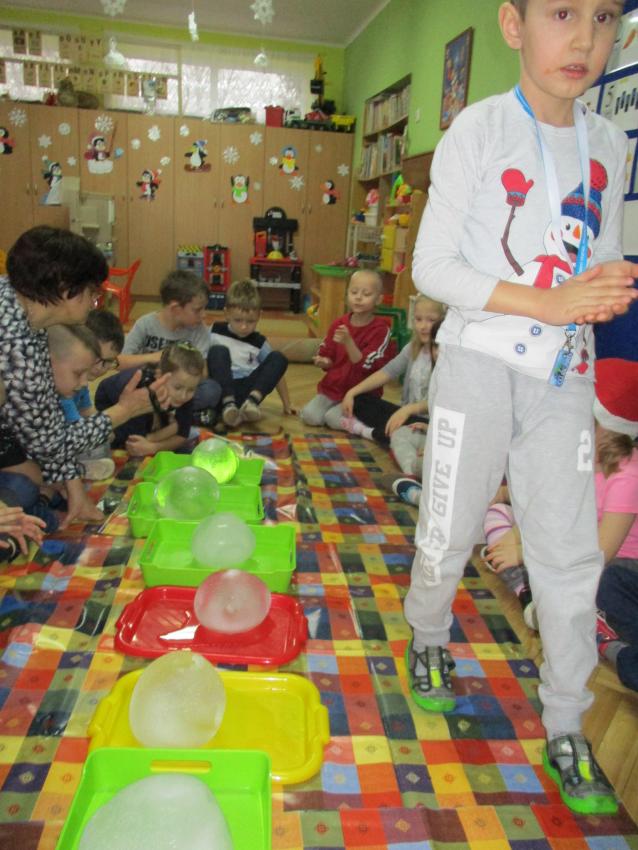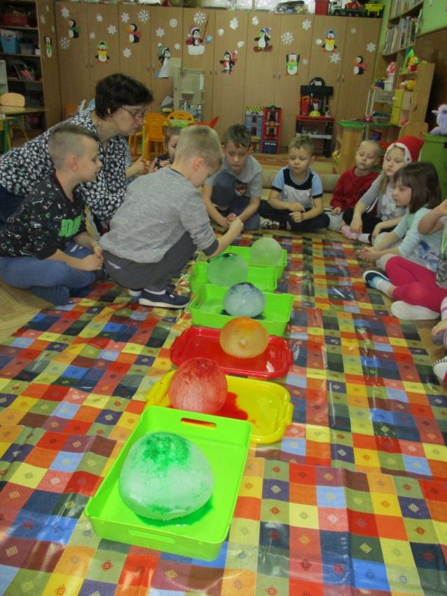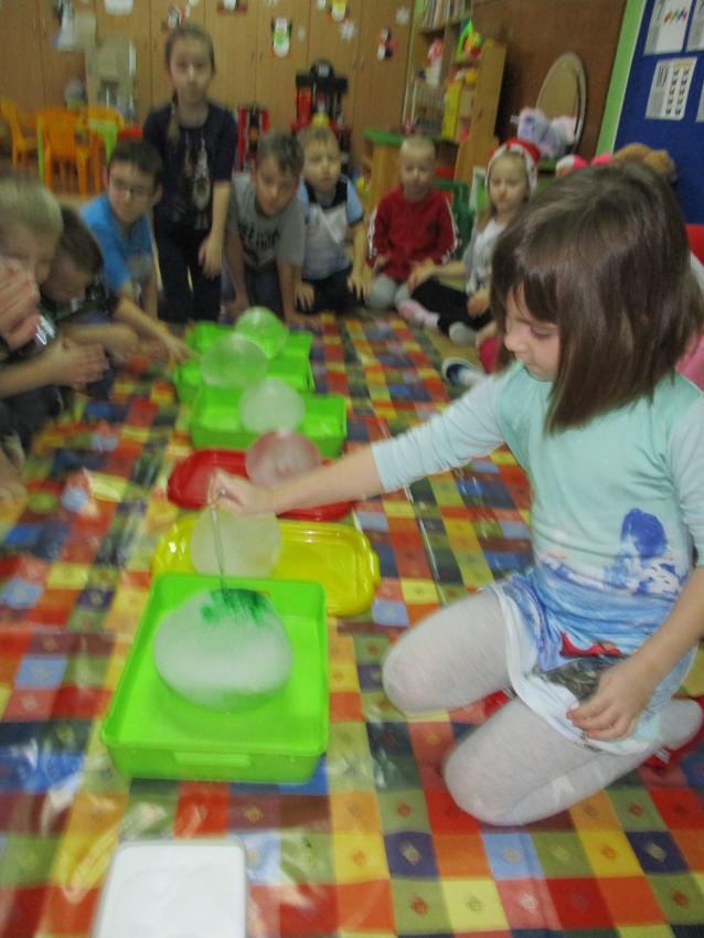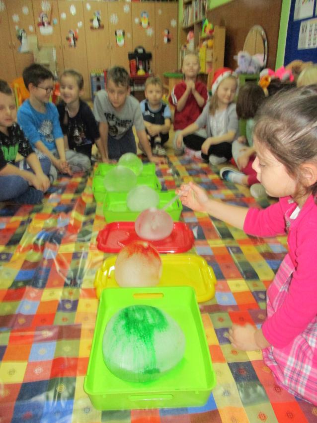 „Kolorowe akwarelki” w ramach programu czytelniczego „Przedszkolaki bajki znają i bardzo je uwielbiają” zapoznały się z baśnią pt. „Królowa Śniegu”. Oprócz poznania treści zorganizowaliśmy zabawy tematyczne oraz doświadczenia z lodem, uwolniliśmy zamrożone serduszko, sprawdzaliśmy co się stanie z kulami lodowymi po zastosowaniu soli itp.