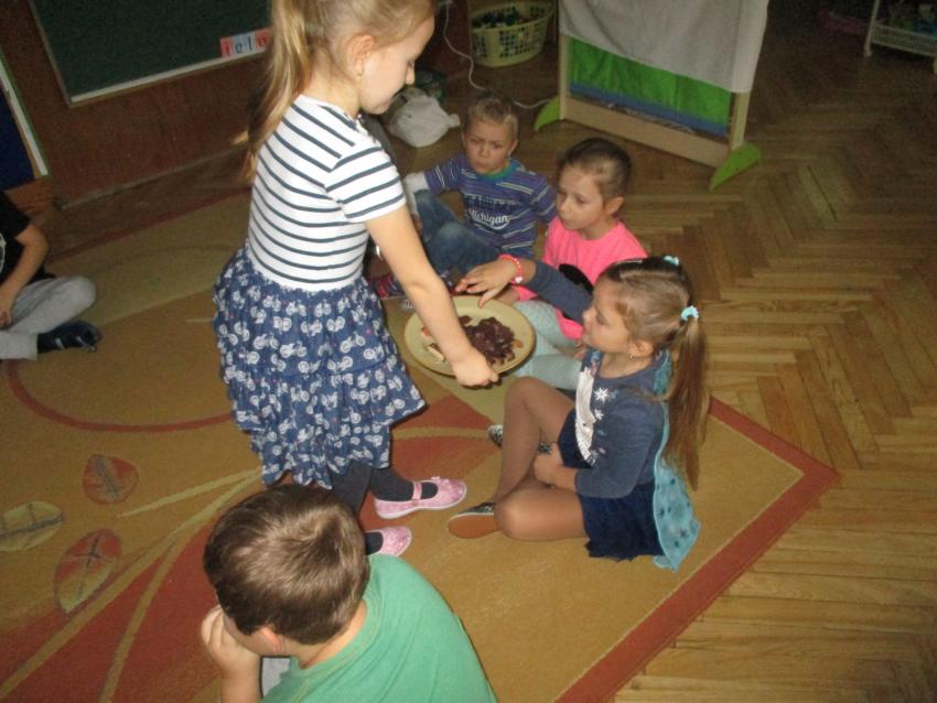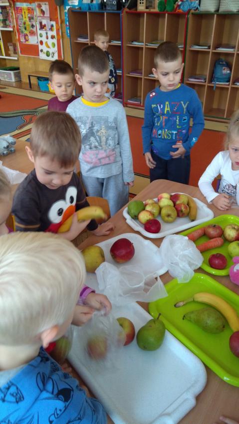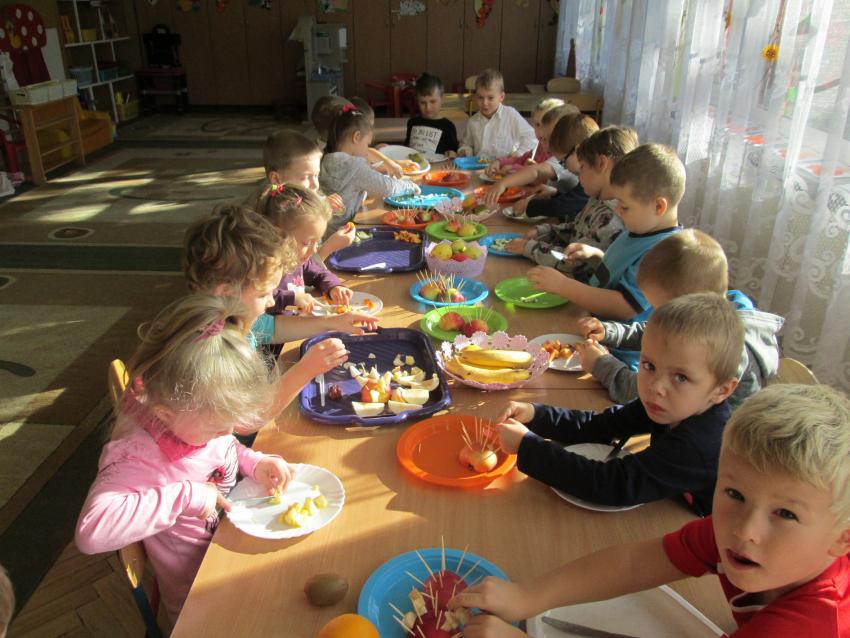 W związku z realizowaną w grupie III „Roztańczone nutki” tematyką „Jesień w sadzie”, w ramach podsumowania zdobytych wiadomości, dzieci z przyniesionych wcześniej owoców wykonały „Owocowe jeżyki”, które były doskonałą dodatkową, jesienną dawką witamin.