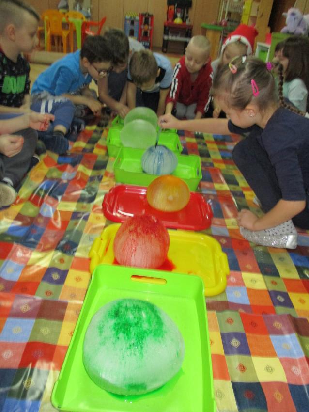 „Kolorowe akwarelki” w ramach programu czytelniczego „Przedszkolaki bajki znają i bardzo je uwielbiają” zapoznały się z baśnią pt. „Królowa Śniegu”. Oprócz poznania treści zorganizowaliśmy zabawy tematyczne oraz doświadczenia z lodem, uwolniliśmy zamrożone serduszko, sprawdzaliśmy co się stanie z kulami lodowymi po zastosowaniu soli itp.